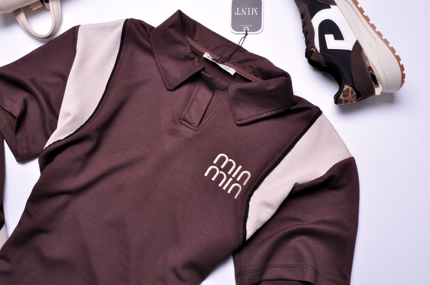 Bluzka o fasonie luźnym, nieprzylegającym. Rękawy krótkie. Z kołnierzykiem. Linia ramion obniżona w kolorze beżowym, z czarnym paskiem przy szwach. Z lewej strony beżowy napis "MIN MIN".