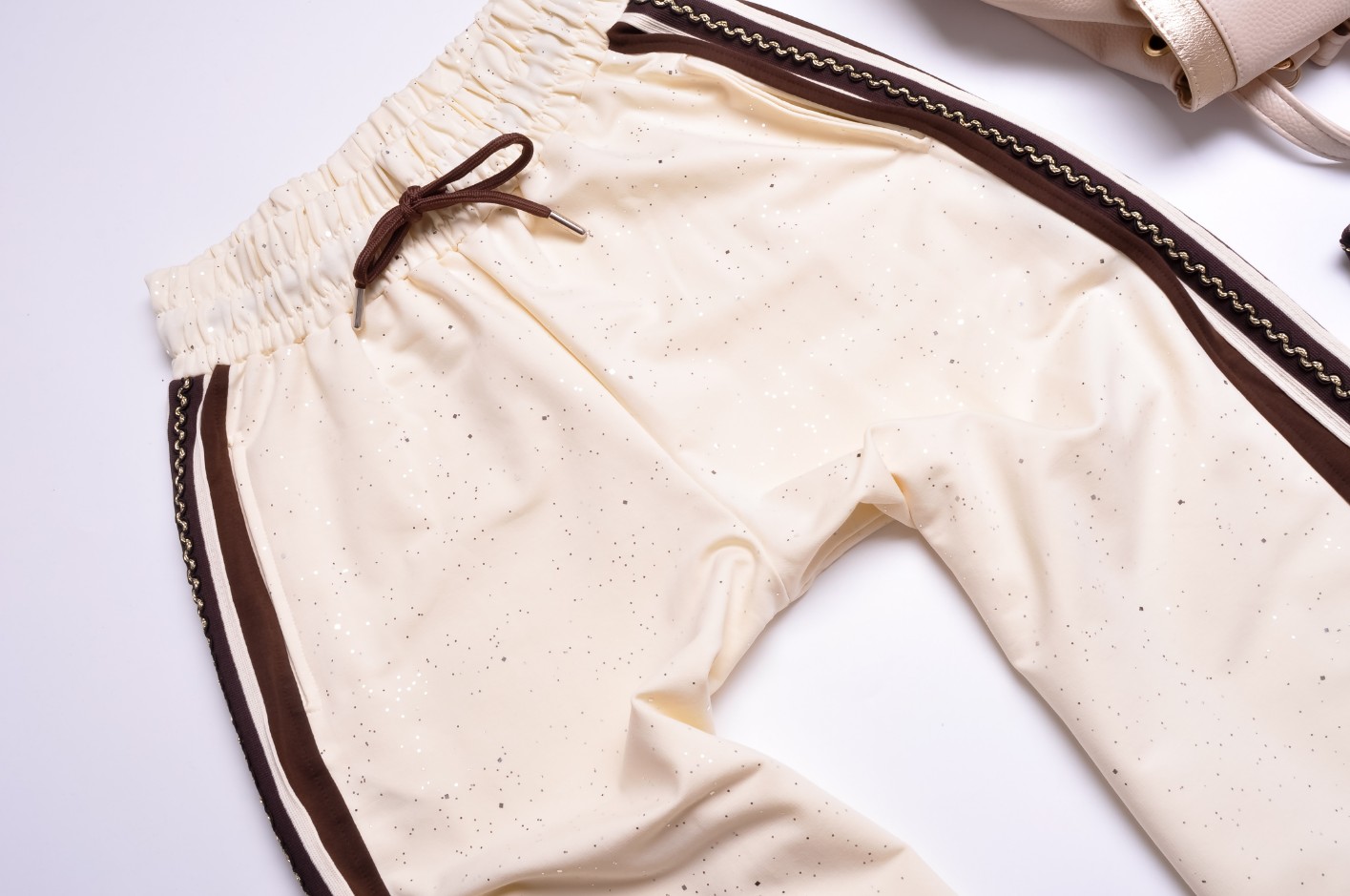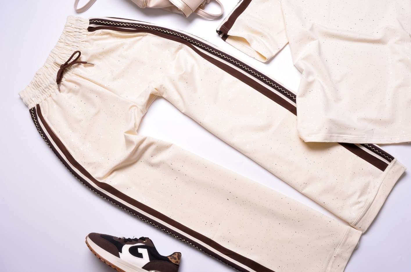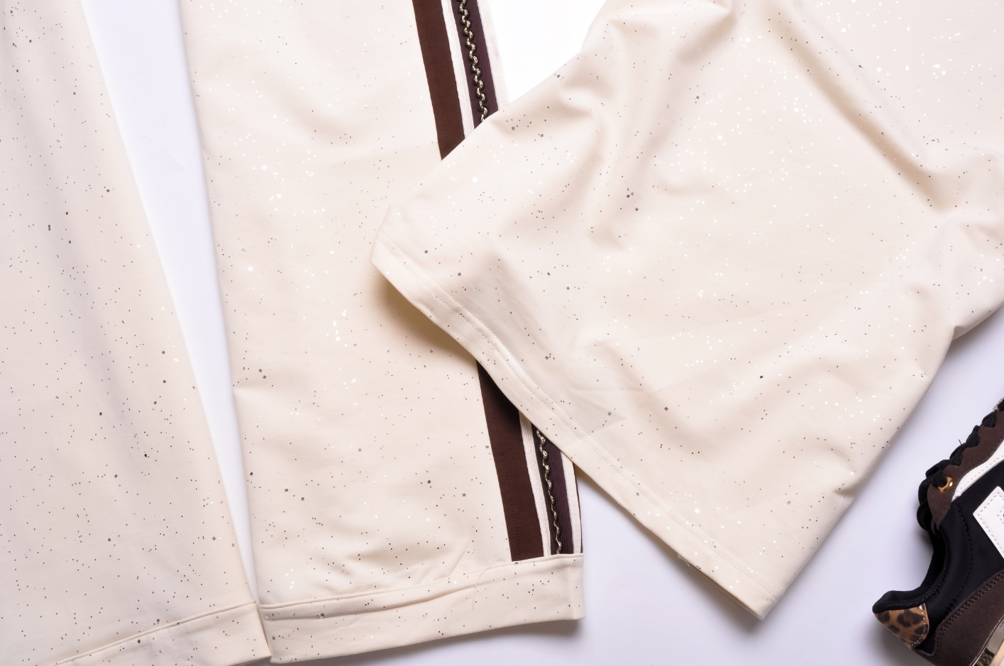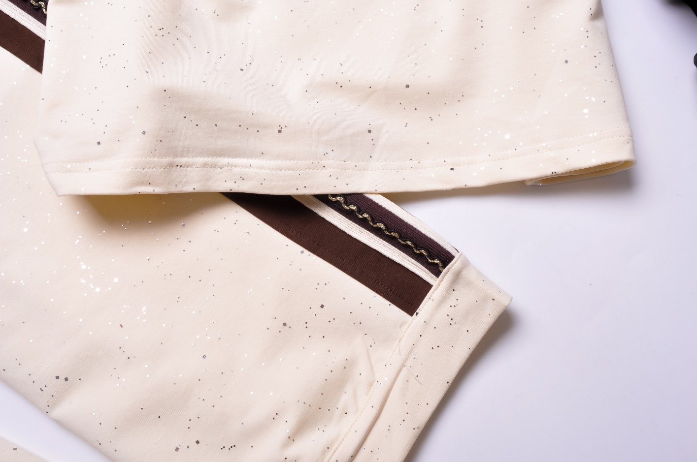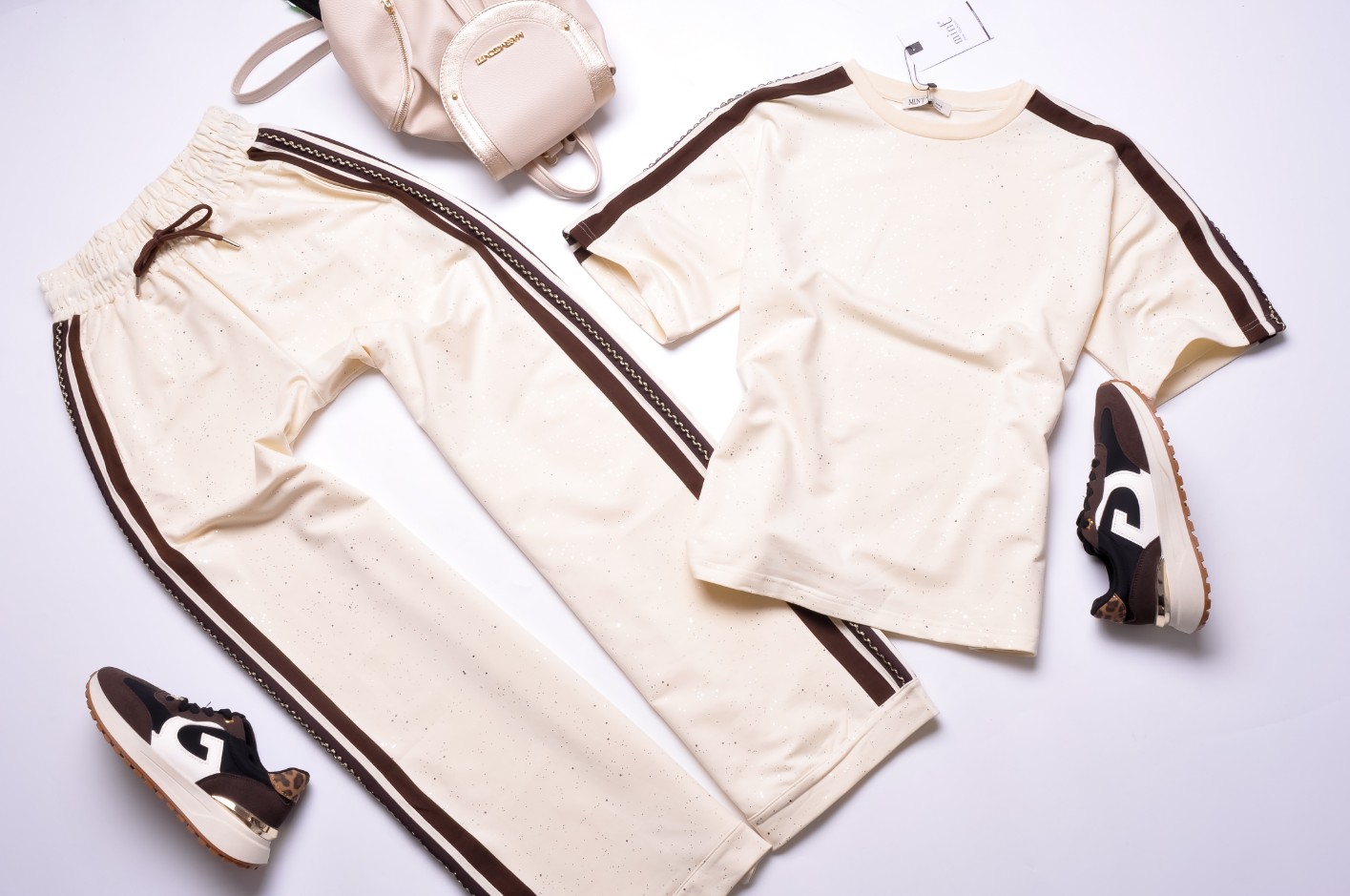 Dwuczęściowy dres składający się z bluzki i spodni w bananowym kolorze. Posypany delikatnymi cyrkoniami.