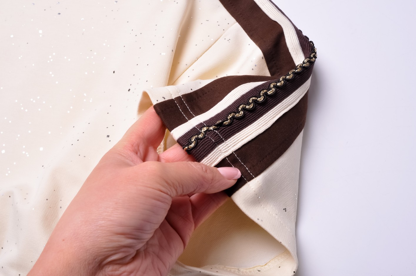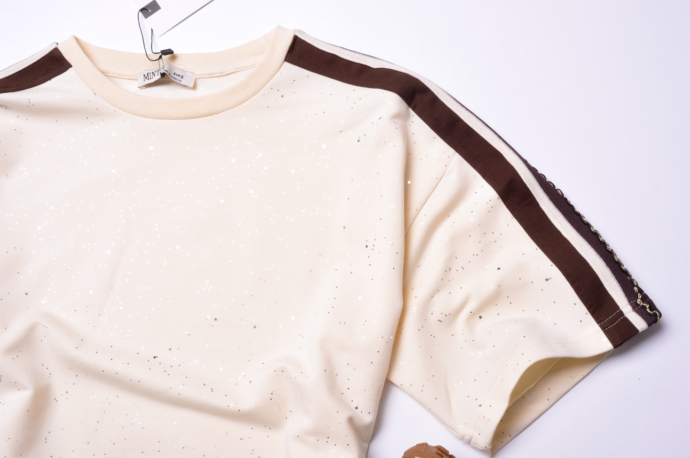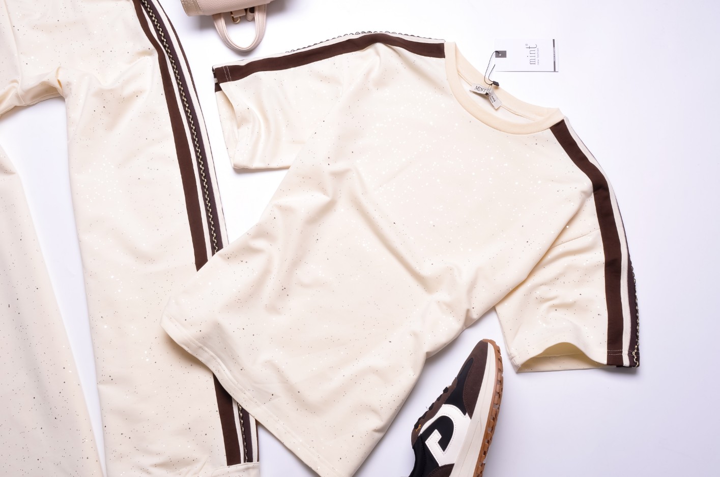 Bluzka o fasonie luźnym, nieprzylegającym. Rękawy krótkie. Po bokach lampasy.