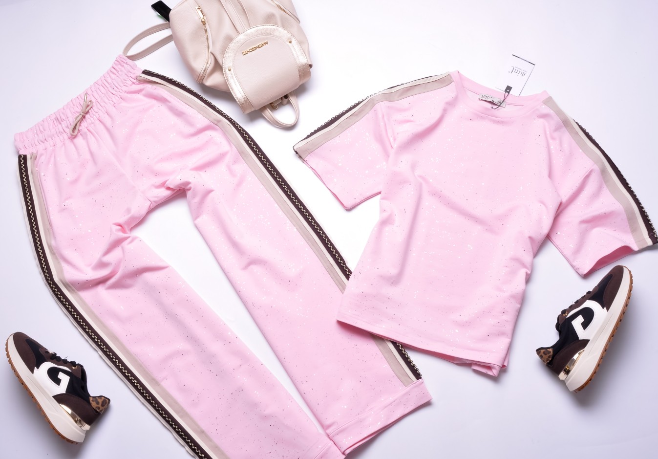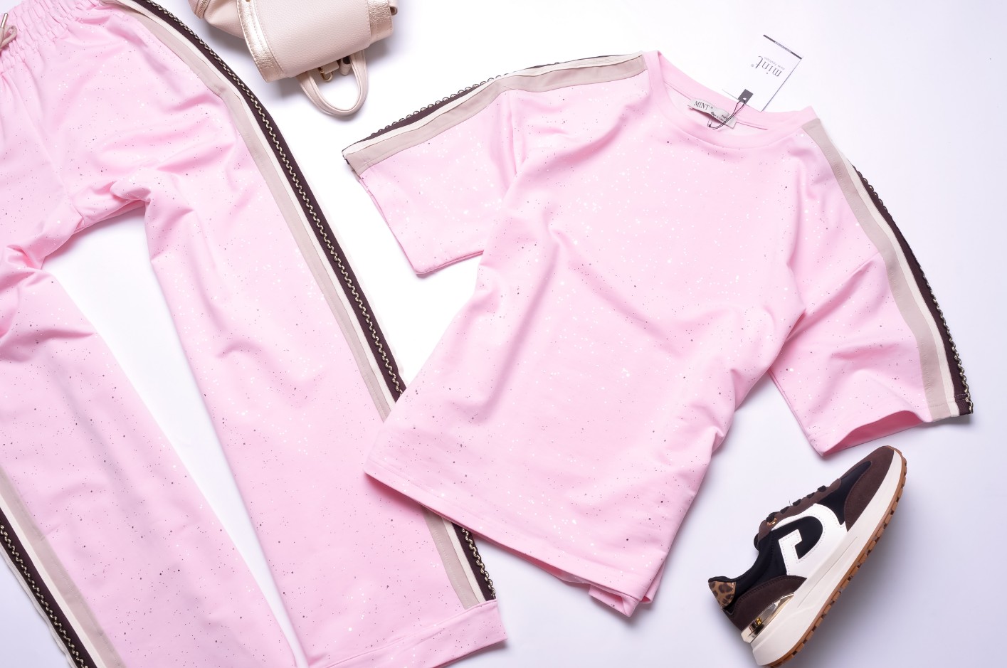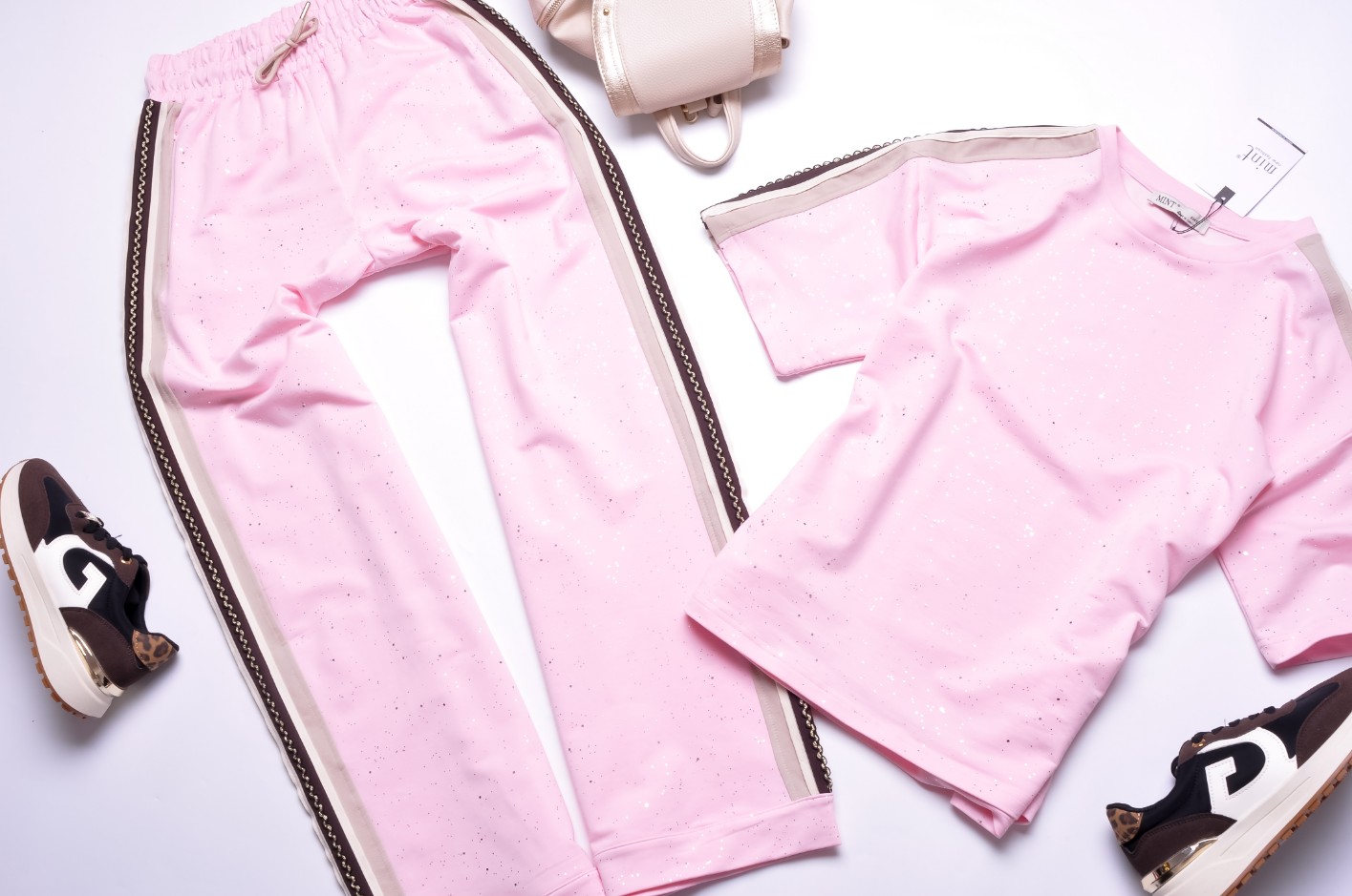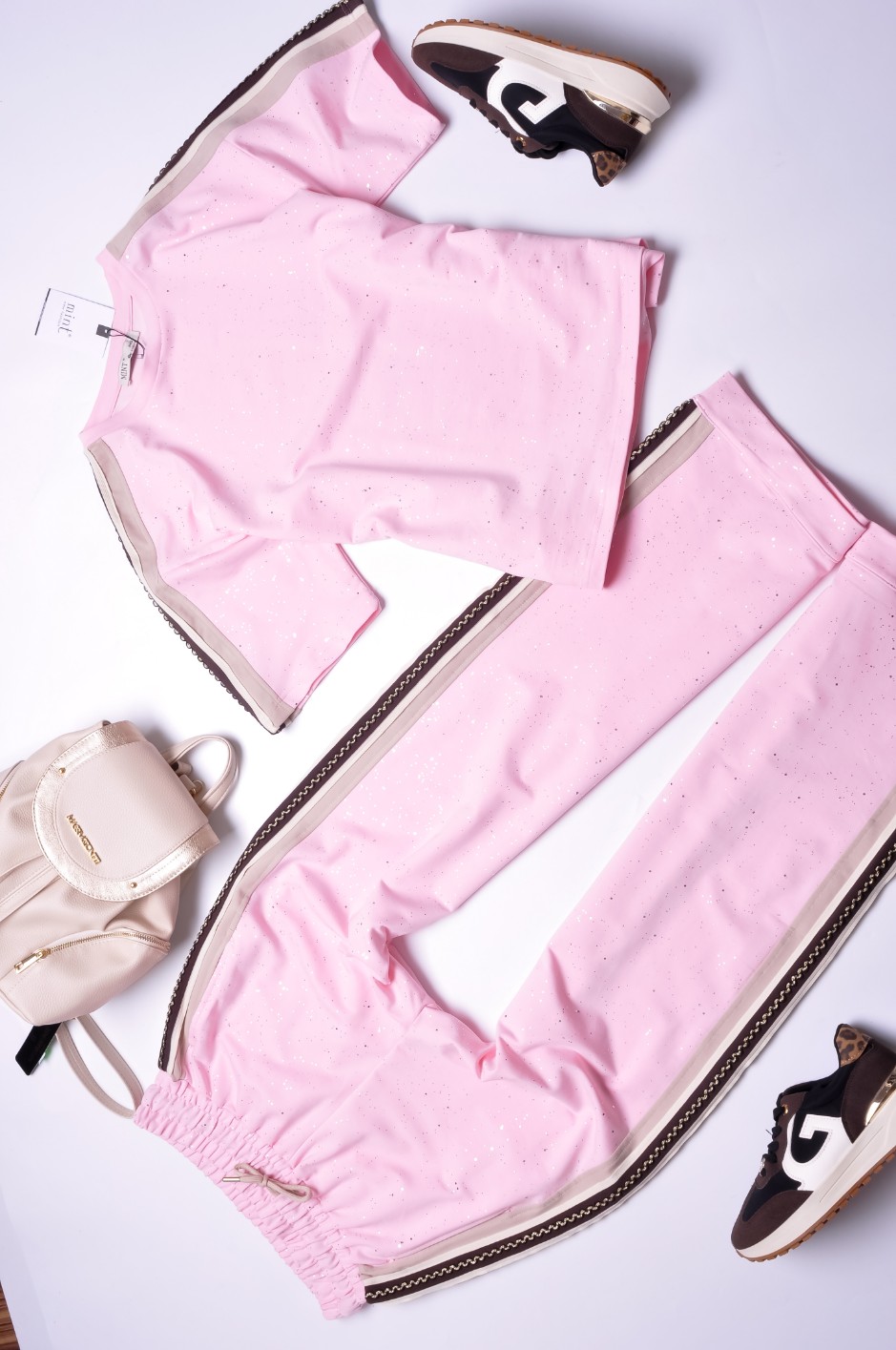 Dwuczęściowy dres składający się z bluzki i spodni w różowym kolorze. Posypany delikatnymi cyrkoniami.