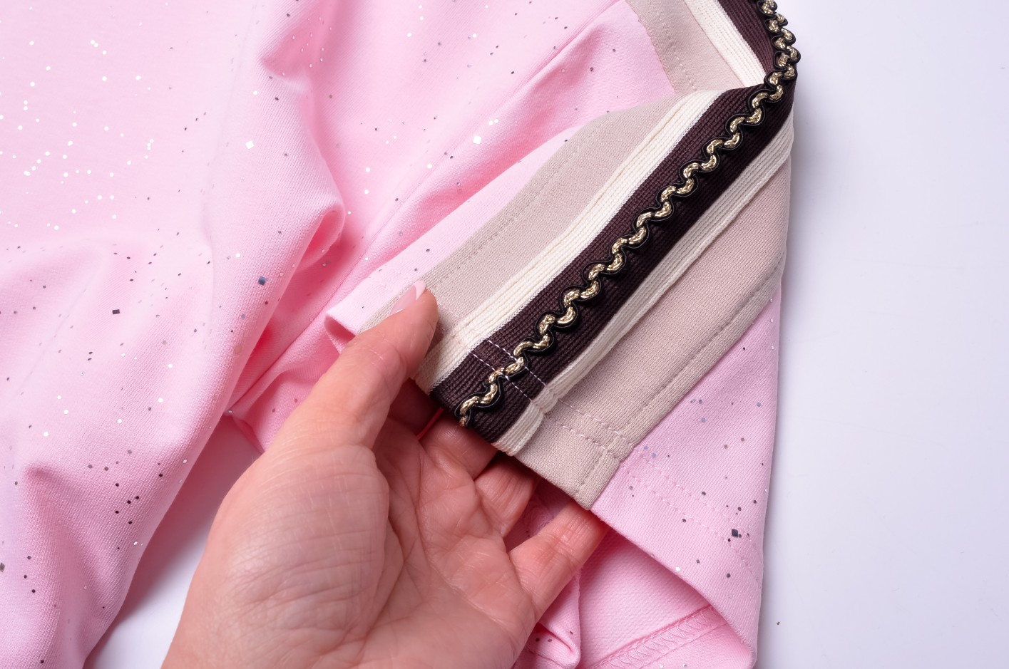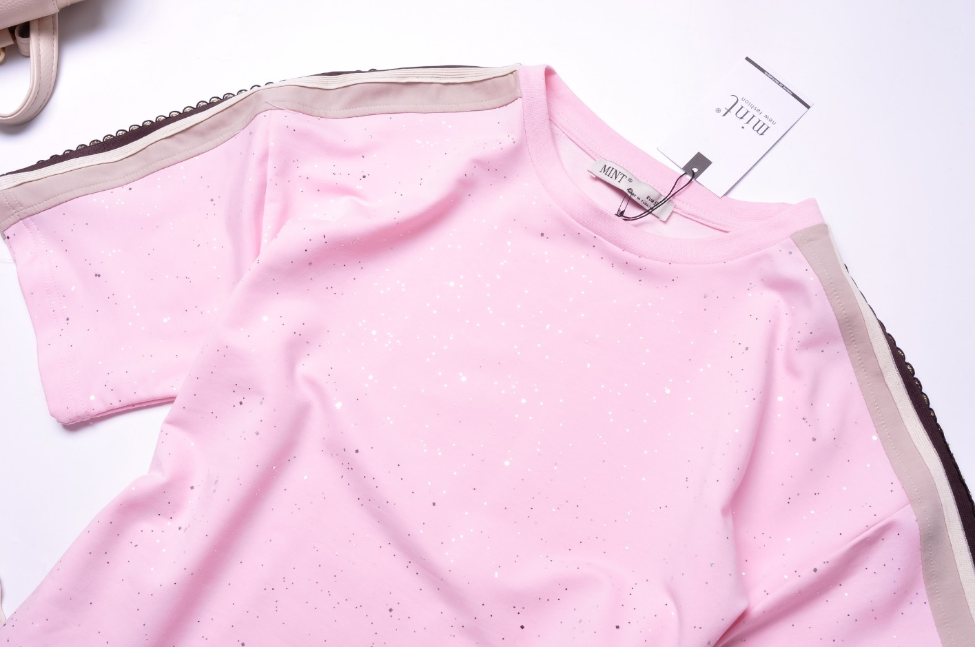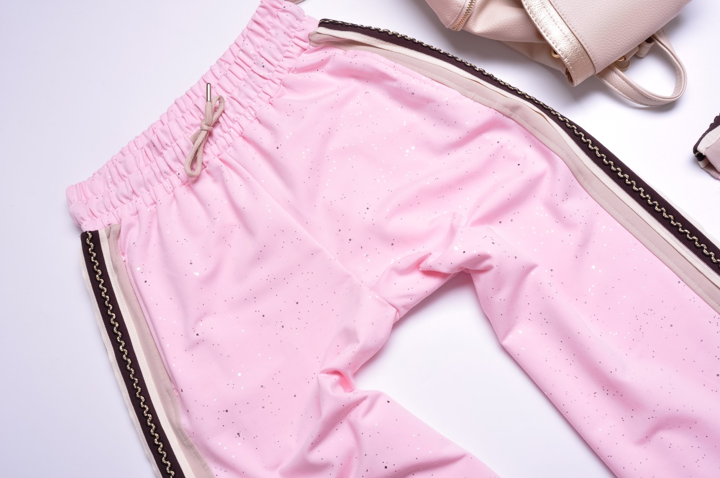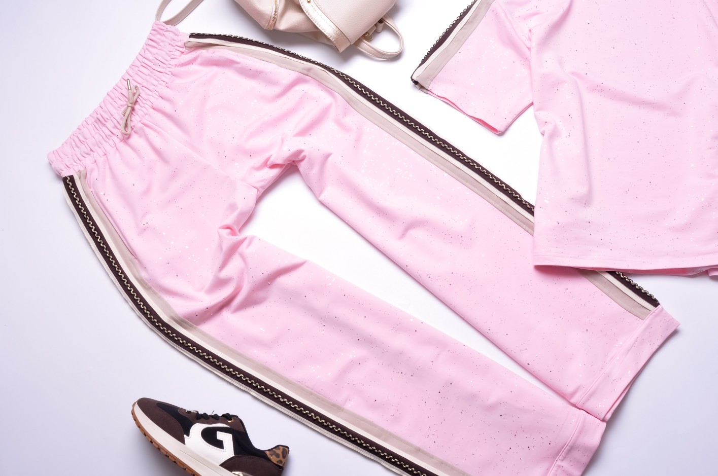 Dwuczęściowy dres składający się z bluzki i spodni w różowym kolorze. Posypany delikatnymi cyrkoniami.