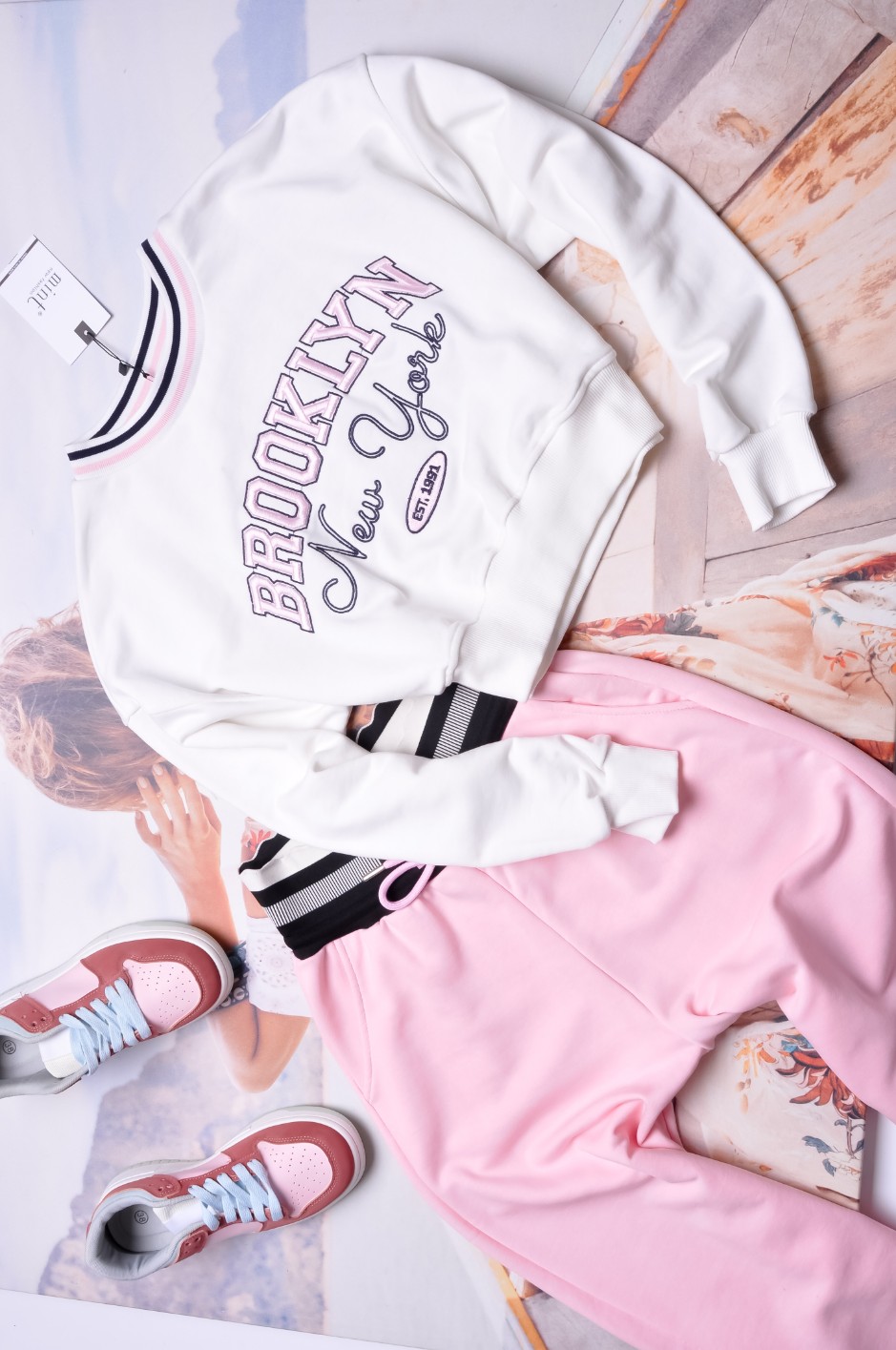 Śliczna bluza w białym kolorze. Wkładana przez głowę. Dekolt okrągły. Rękawy długie, obniżona linia ramion. Fason oversize, nieprzylegający. Wykończona aplikacją.
