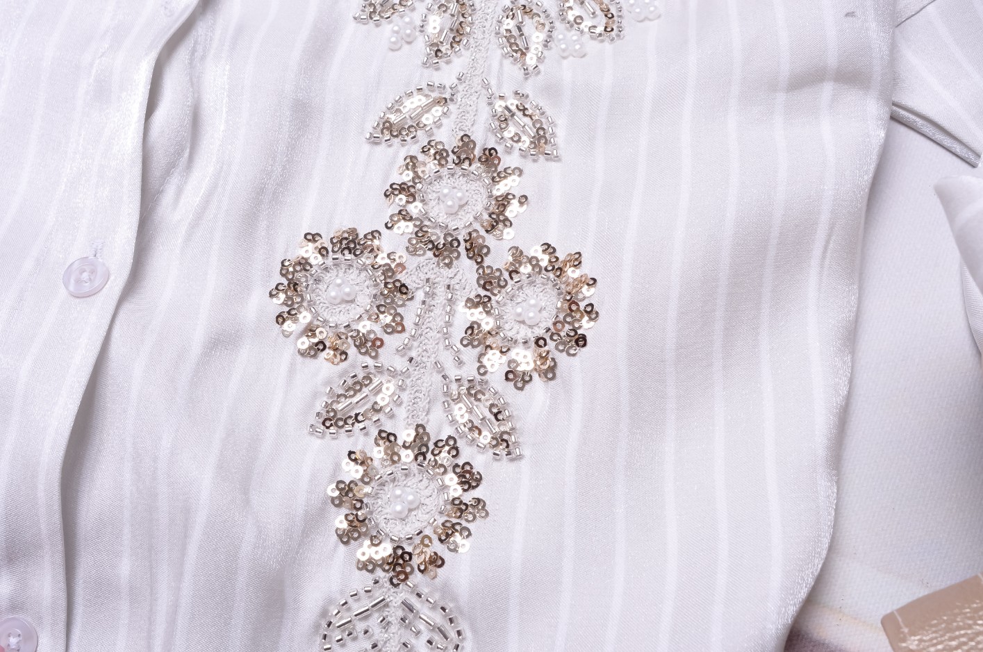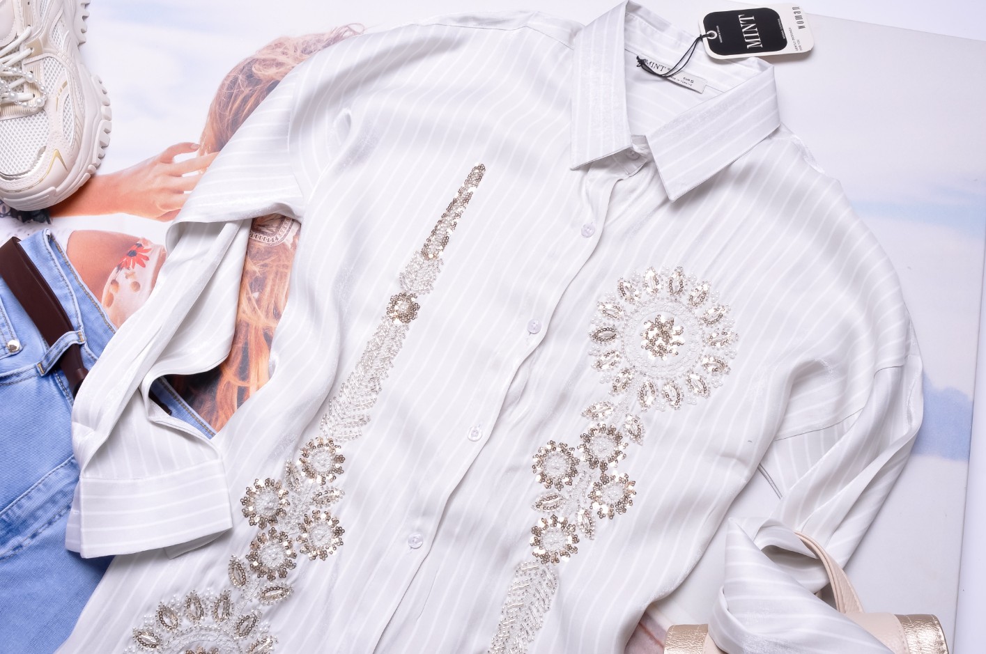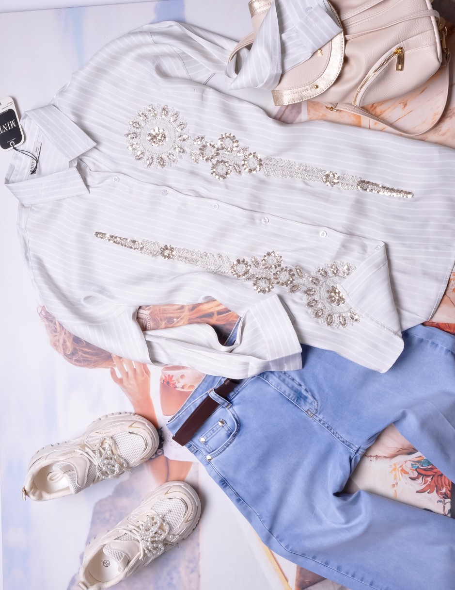 Połyskująca dłuższa koszula w popielatym kolorze z białymi paseczkami. Zapinana na guziki. Rękawy wykończone mankietami, z możliwością podwinięcia. Krój prosty. Z przodu zdobiona kwiatami z koralików i perełek. Posiada kołnierzyk.
