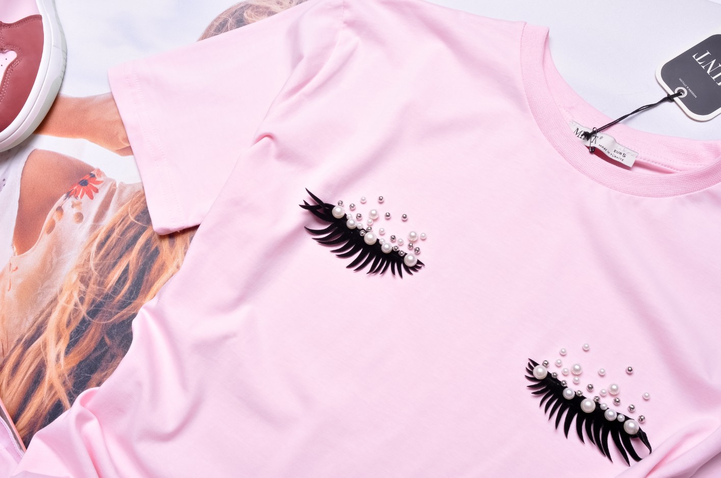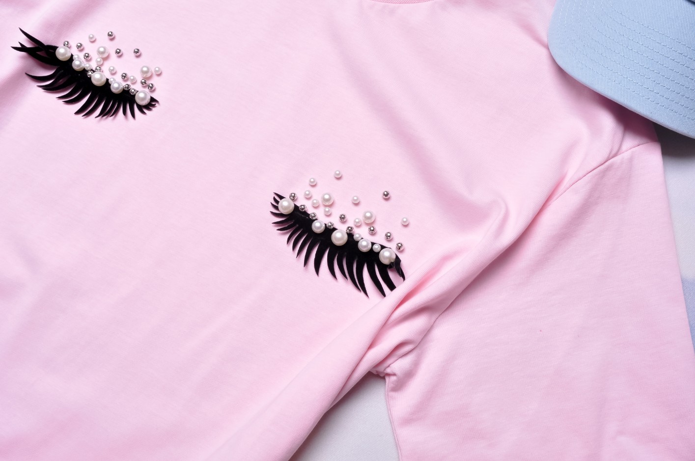 Śliczna bluzka w różowym kolorze. Wkładana przez głowę. Dekolt okrągły. Rękawy krótkie. Fason oversize, nieprzylegający. Wykończona aplikacją rzęs 3D i perełek.