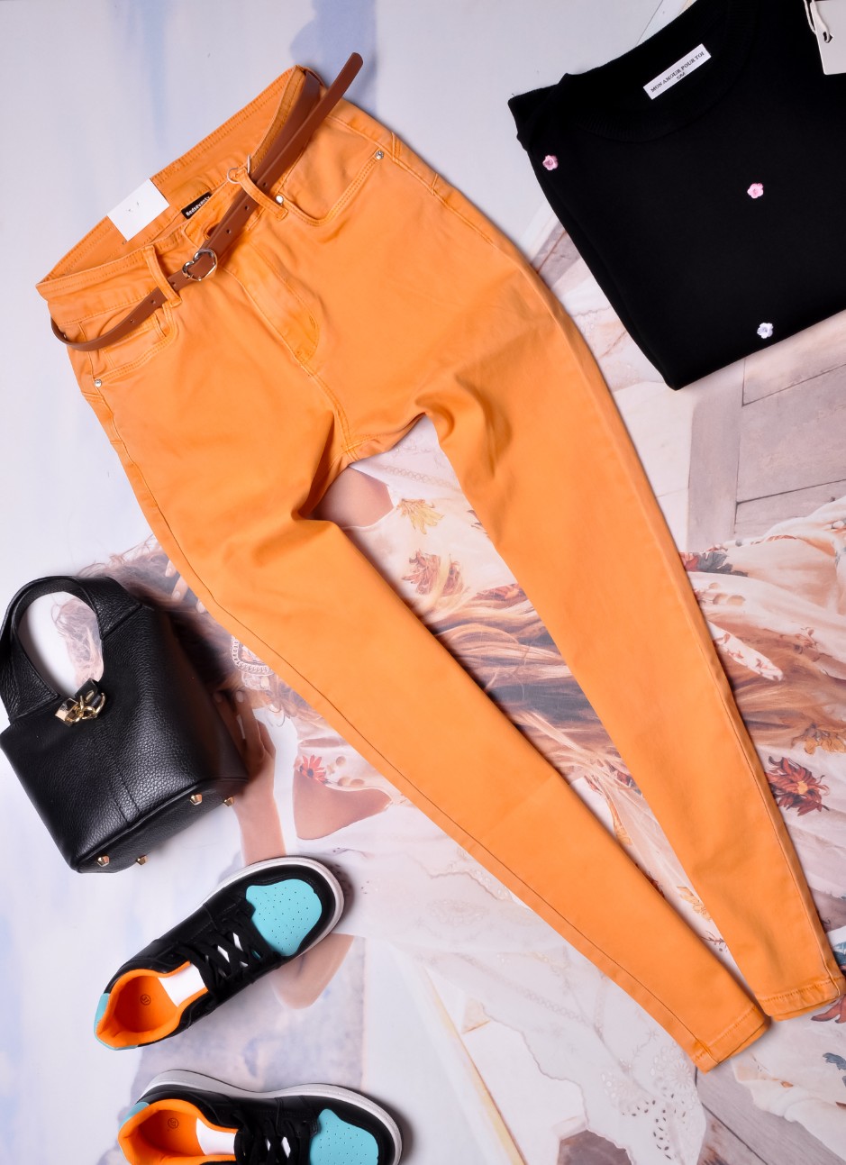 Jeansy w pomarańczowym kolorze z brązowym paseczkiem. Model PUSH UP. Zapinane na zamek oraz guziczek. Z przodu i z tyłu dwie kieszenie. Nogawki zwężane - przylegające. Wysoki stan