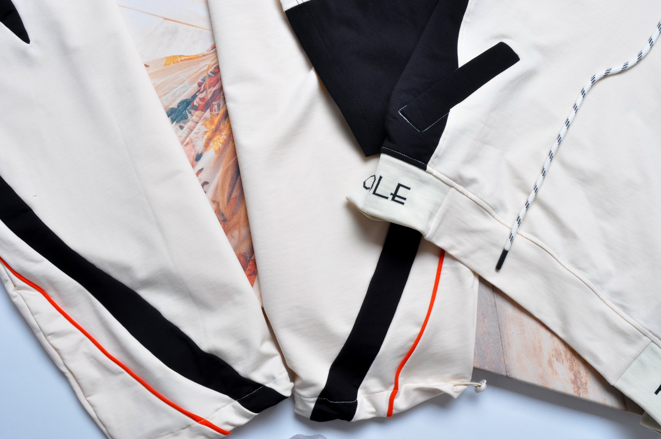 Spodnie dresowe z bardzo wysokim stanem. Nogawki szerokie, dołem możliwość ściągnięcia sznureczkiem. Dwie kieszenie z przodu. Ozdobione gumą w talii z napisem. Z przodu zdobione czarnymi i czerwonymi wstawkami.