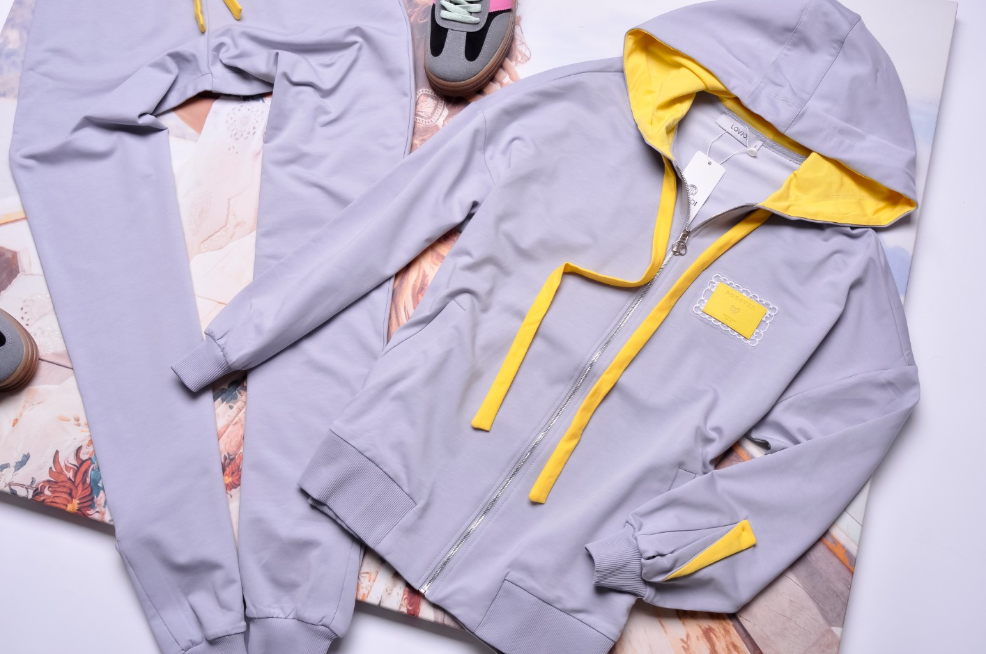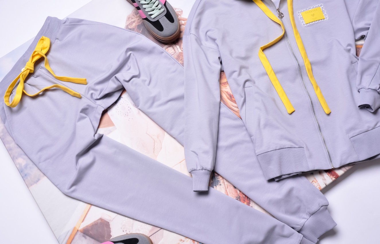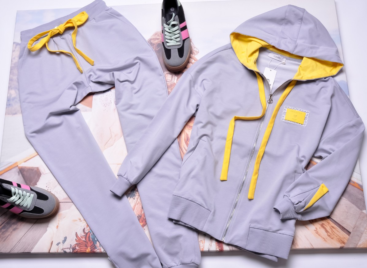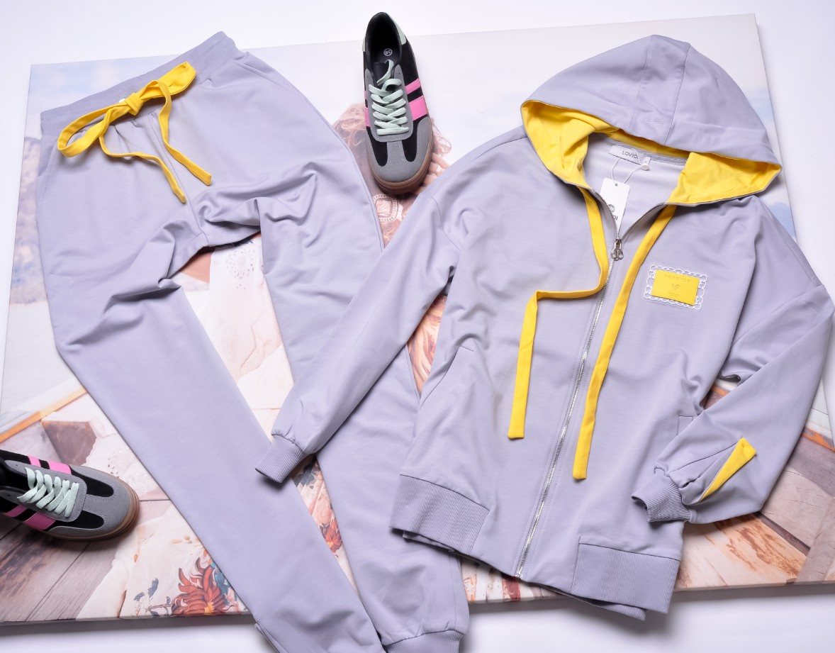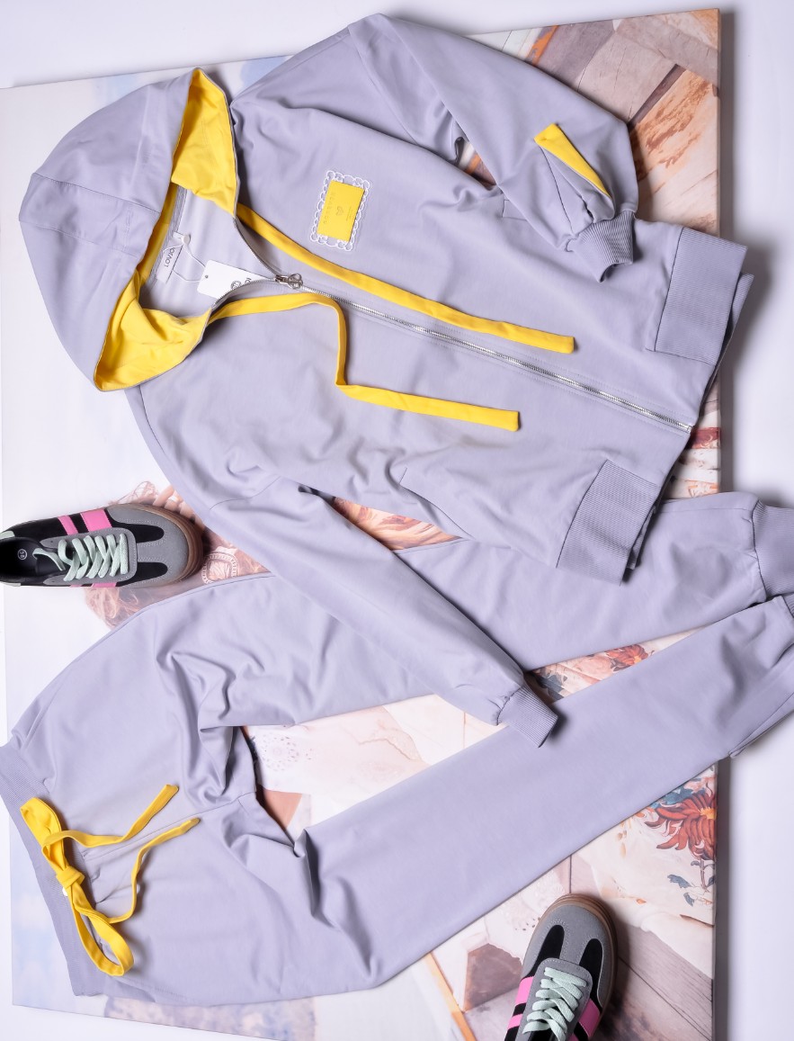 Spodnie z dopasowanymi nogawkami. Wysoki stan. W talii gruba gumka dla lepszego dopasowania. Z kieszeniami po bokach i u dołu nogawek rozcięcia z żółtymi wstawkami.