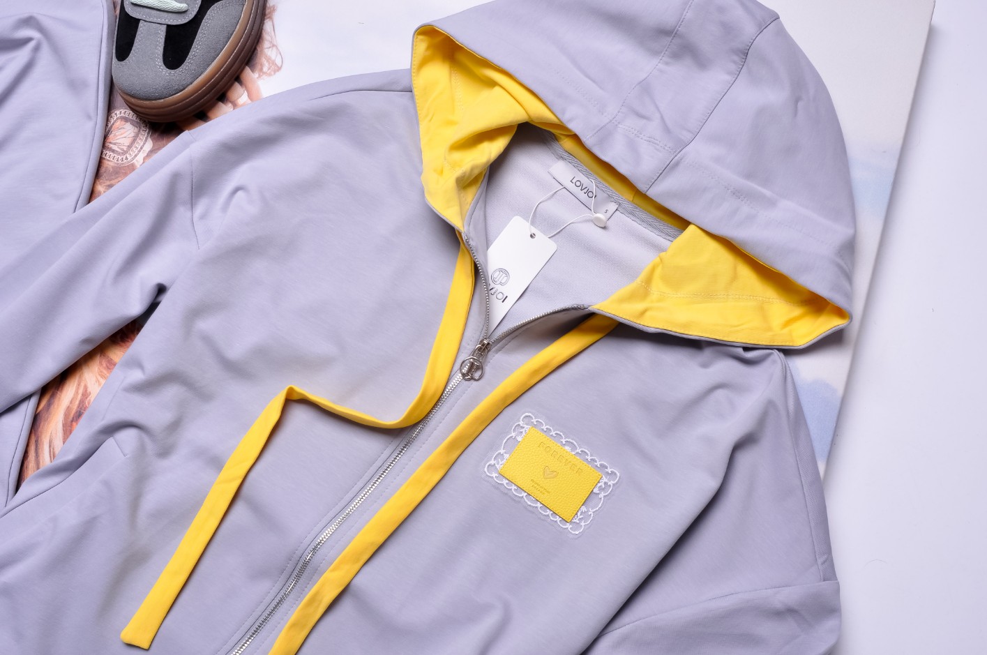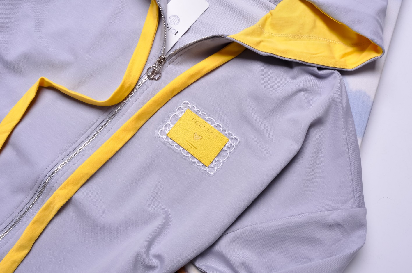 Bluza o swobodnym kroju . Zapinana na zamek. Po bokach kieszenie. Posiada kaptur regulowany żółtymi sznureczkami. Wypełnienie kaptura również jest żółte. Z prawej strony żółta wstawka z napisami.