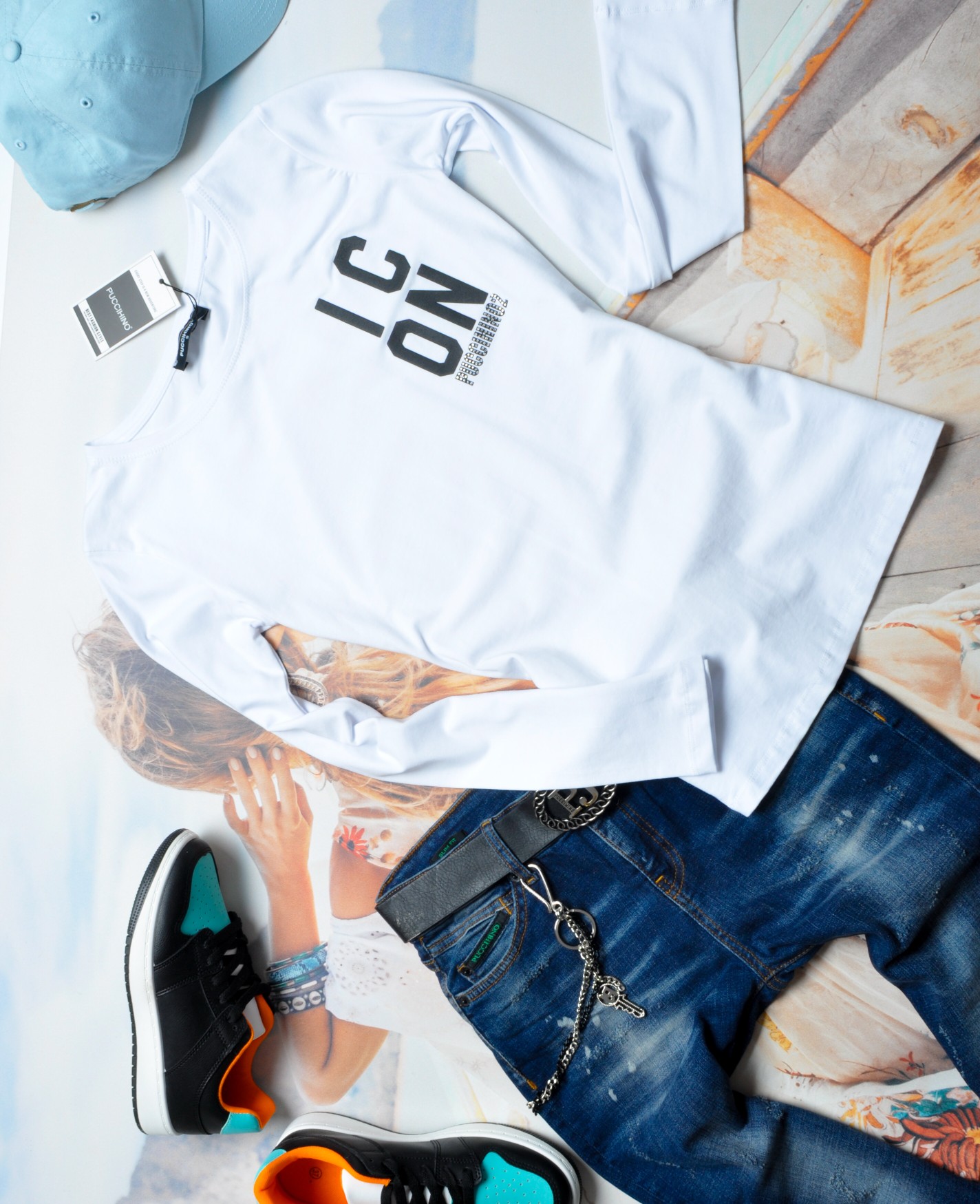 Biała bluzka o przylegającym fasonie. Wkładana przez głowę. Dekolt okrągły. Rękawy długie. Zdobiona z przodu logo 'ICON' z cyrkoniami. Materiał lekko elastyczny.
