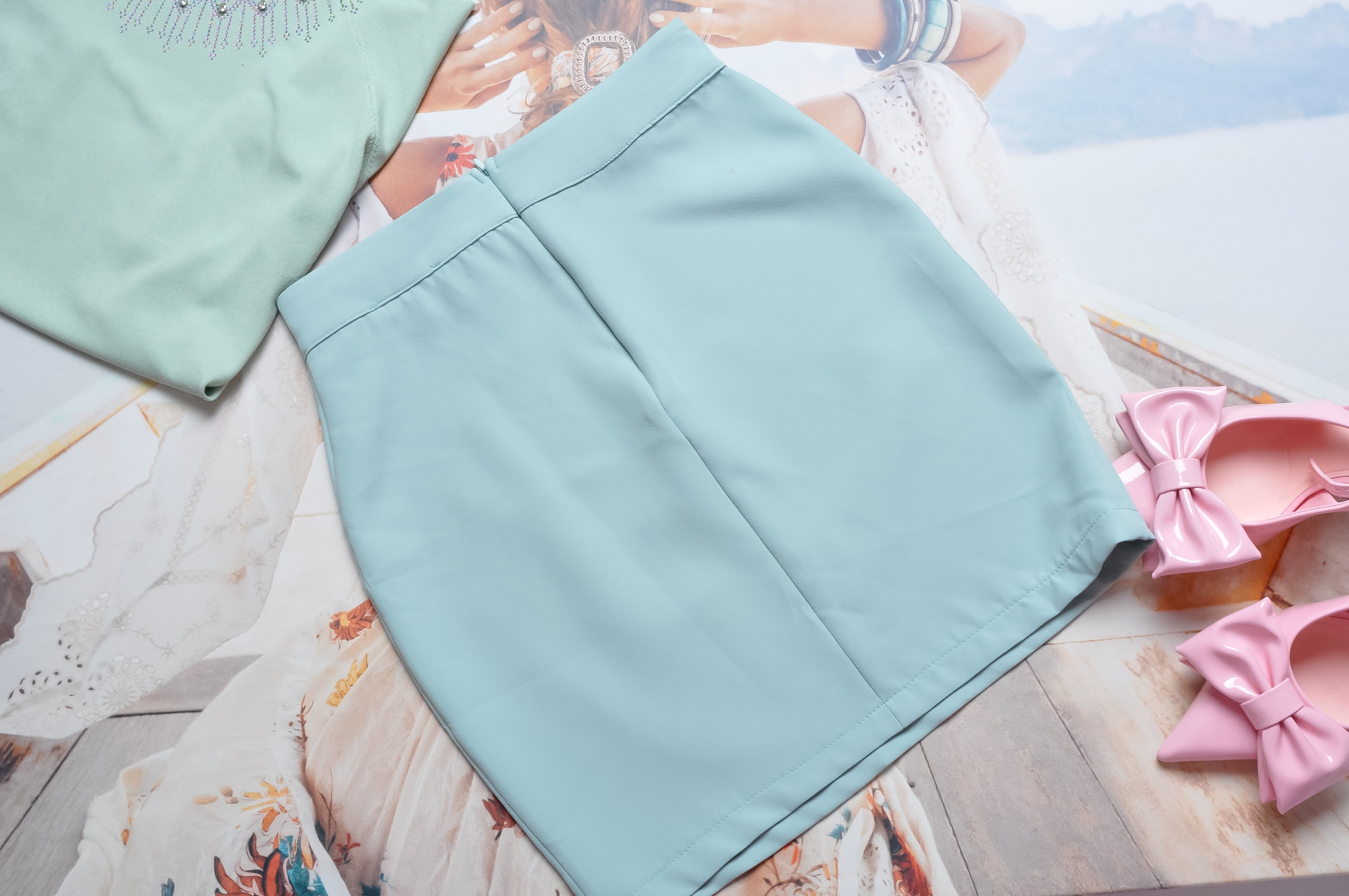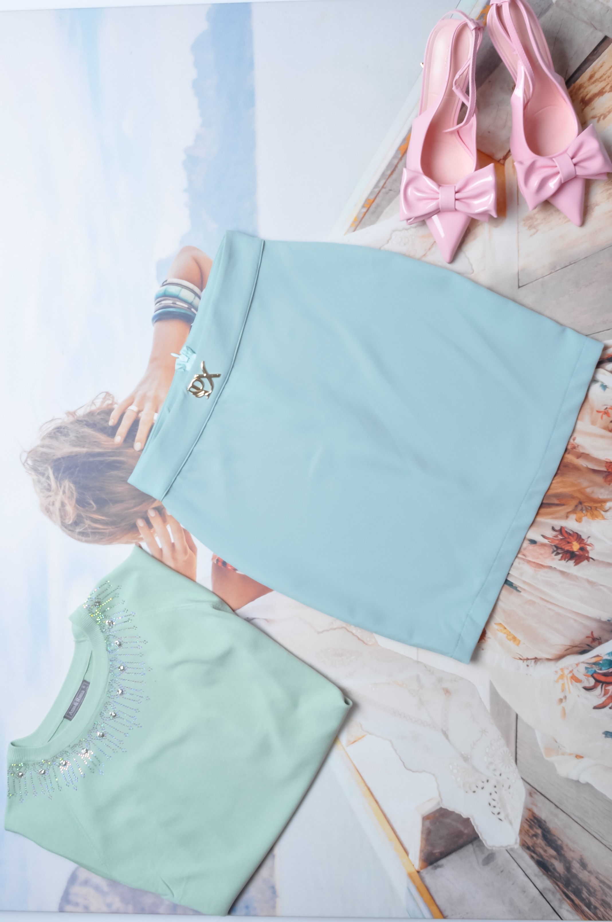 Elegancka spódnica w pięknym miętowym kolorze, wykończona złotym detalem w pasie. Model prosty - wizytowy. Z tyłu rozpinana suwakiem. Spódnica nie-elastyczna, krótka - do połowy uda.