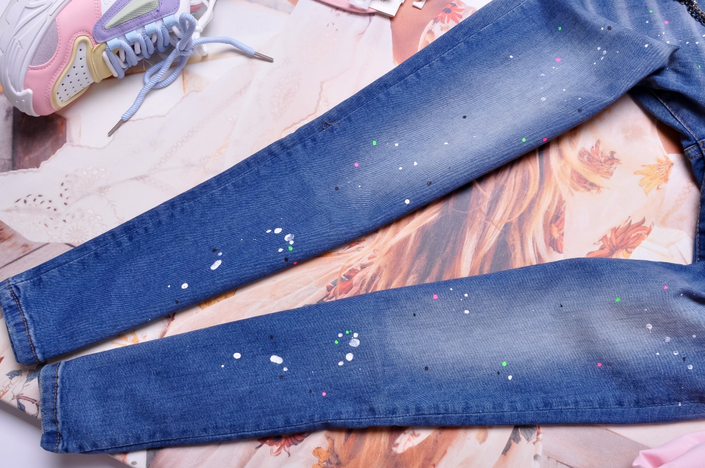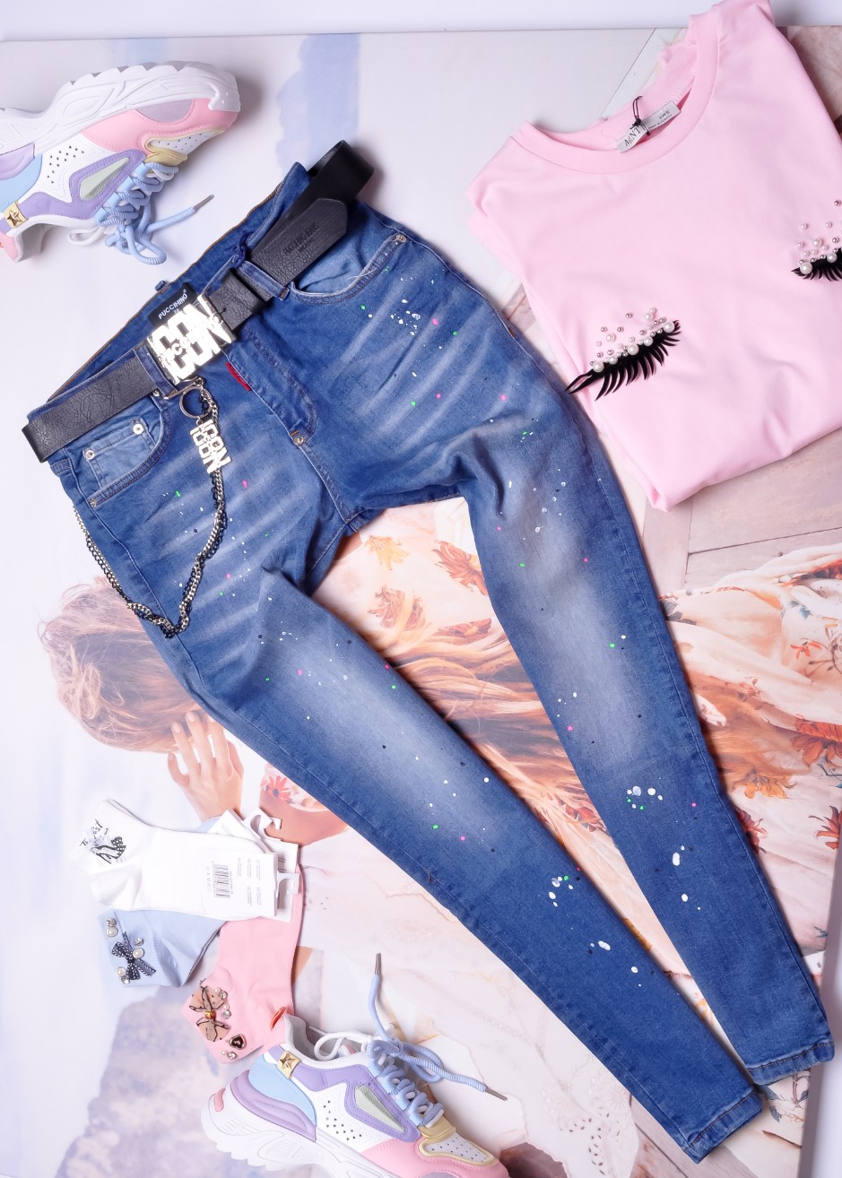 Jeansowe spodnie o kroju BOYFRIEND w granatowym kolorze. Nogawka prosta. Materiał z wysokiej jakości. Posiadają czarny pasek ze srebrną klamrą - ICON. Dwie kieszenie z przodu oraz dwie z tyłu. Odpinane ozdobne łańcuszki. Zdobione kolorową farbką.