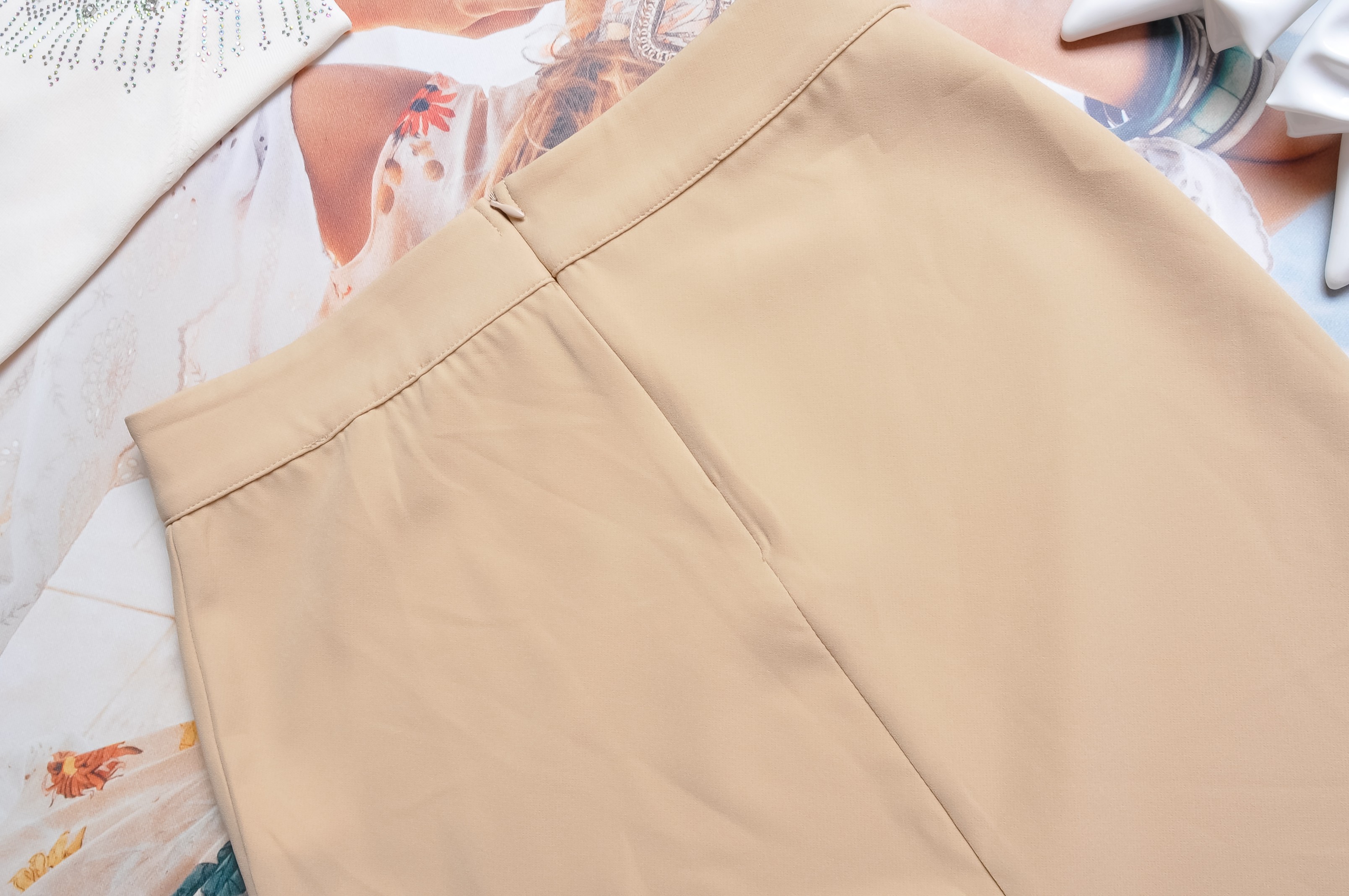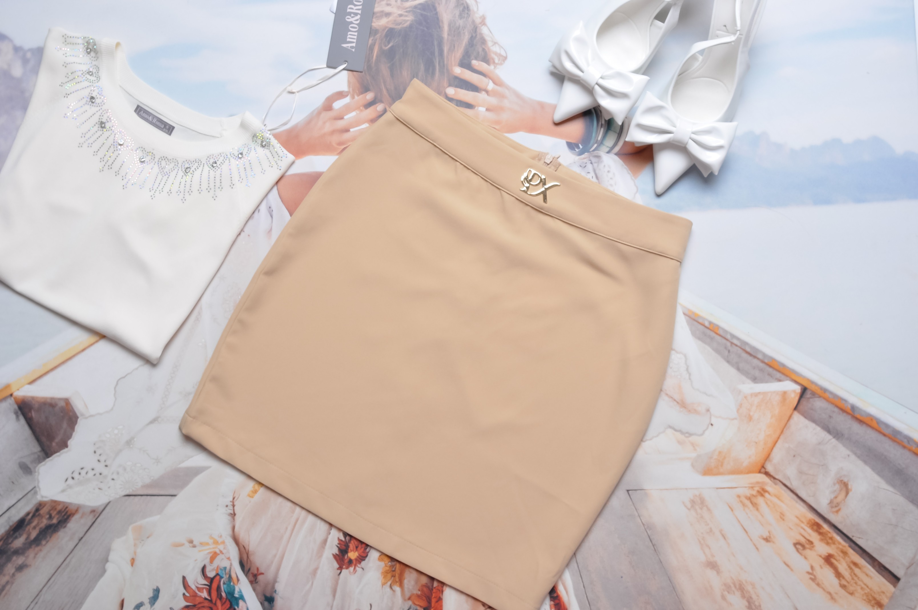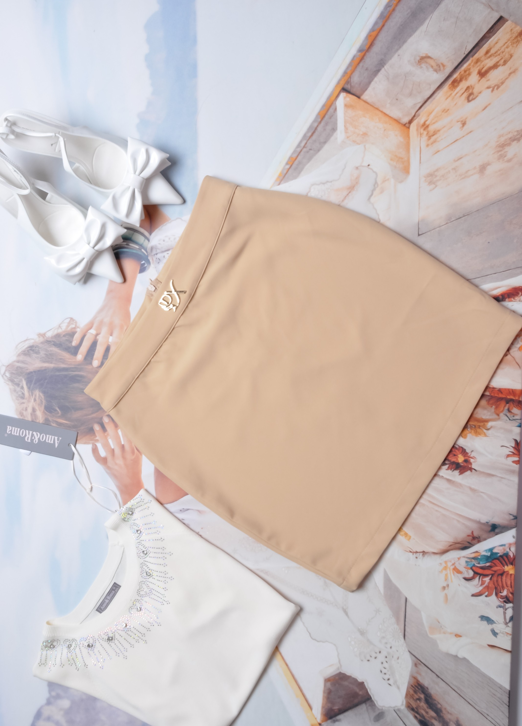 Elegancka spódnica w pięknym jasnym kolorze beżu, wykończona złotym detalem w pasie. Model prosty - wizytowy. Z tyłu rozpinana suwakiem. Spódnica nie-elastyczna, krótka - do połowy uda.