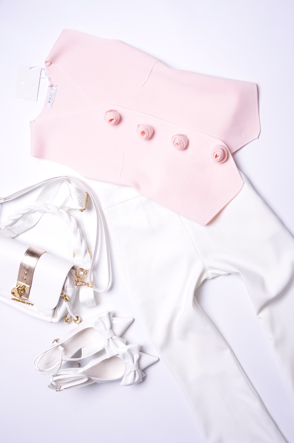 Piękna kamizelka o przylegającym kroju z dzianinowego materiału w pudrowo - różowym kolorze. Zapinana na napy. Zdobiona dzianinowymi kwiatami. Krój prosty.