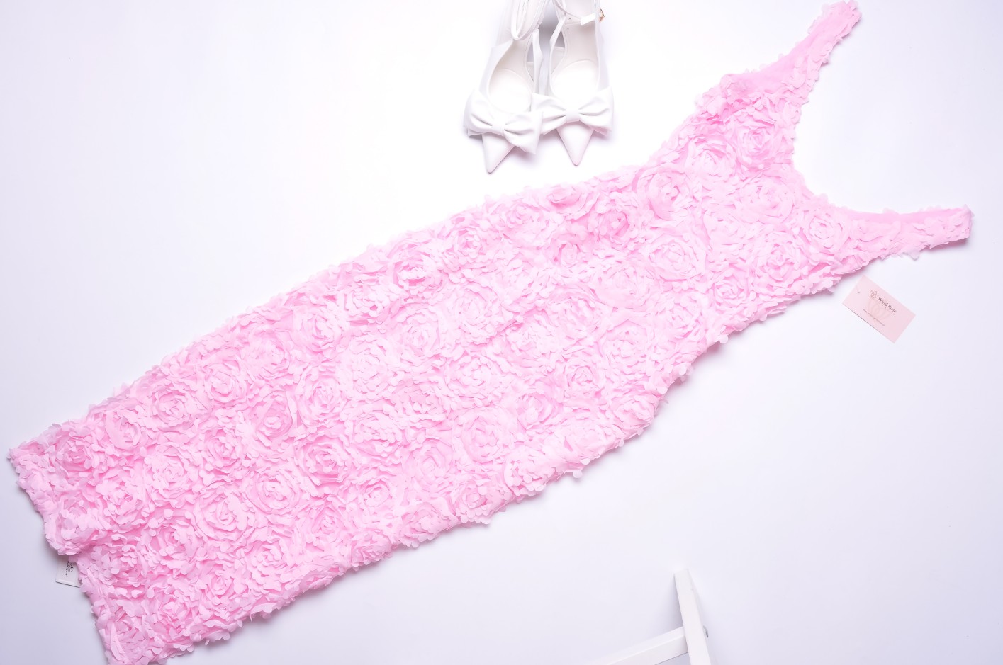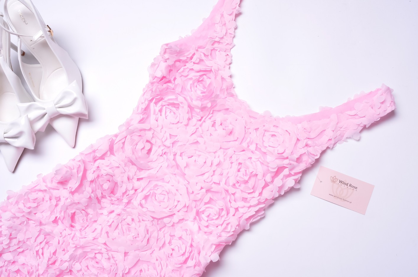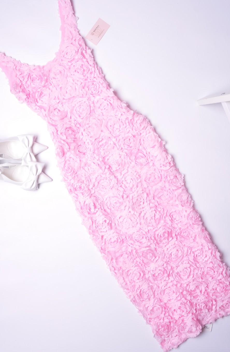 Sukienka midi w kolorze różowym na ramiączkach. Sukienka siateczkowa w całości zdobiona kwiatami 3D, z podszewką. Zapinana na zamek z boku, taliowana. Rozcięcie na nogę.