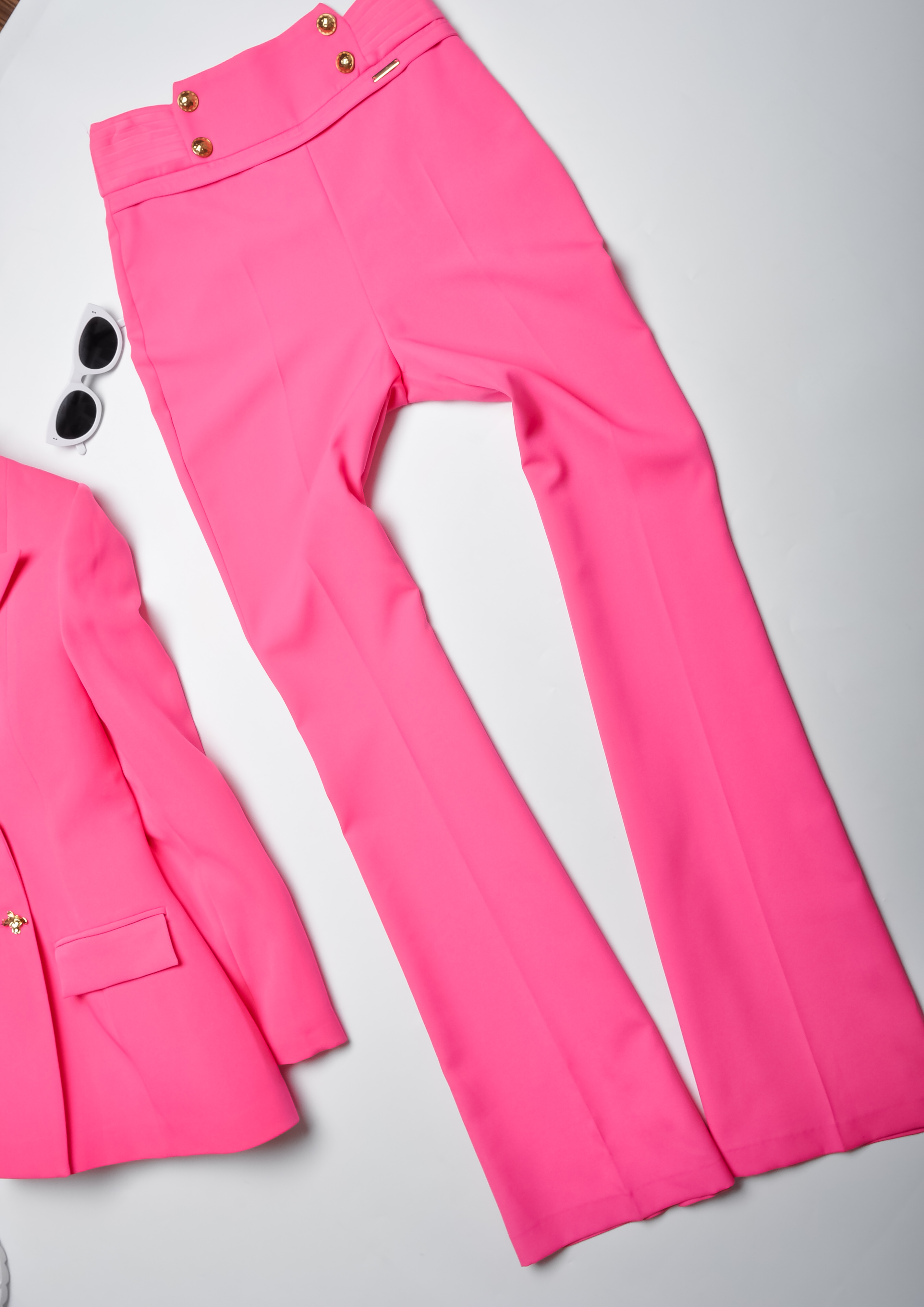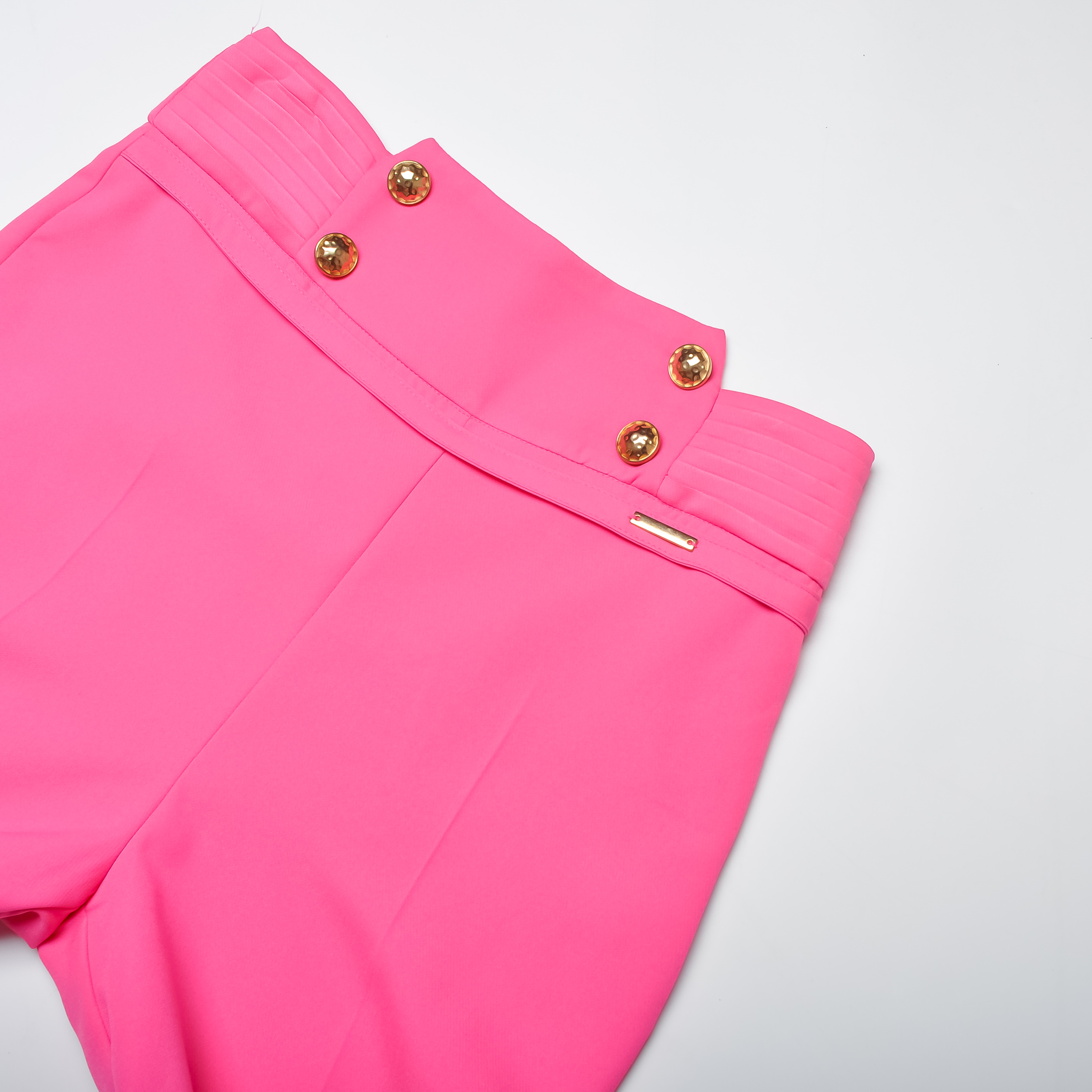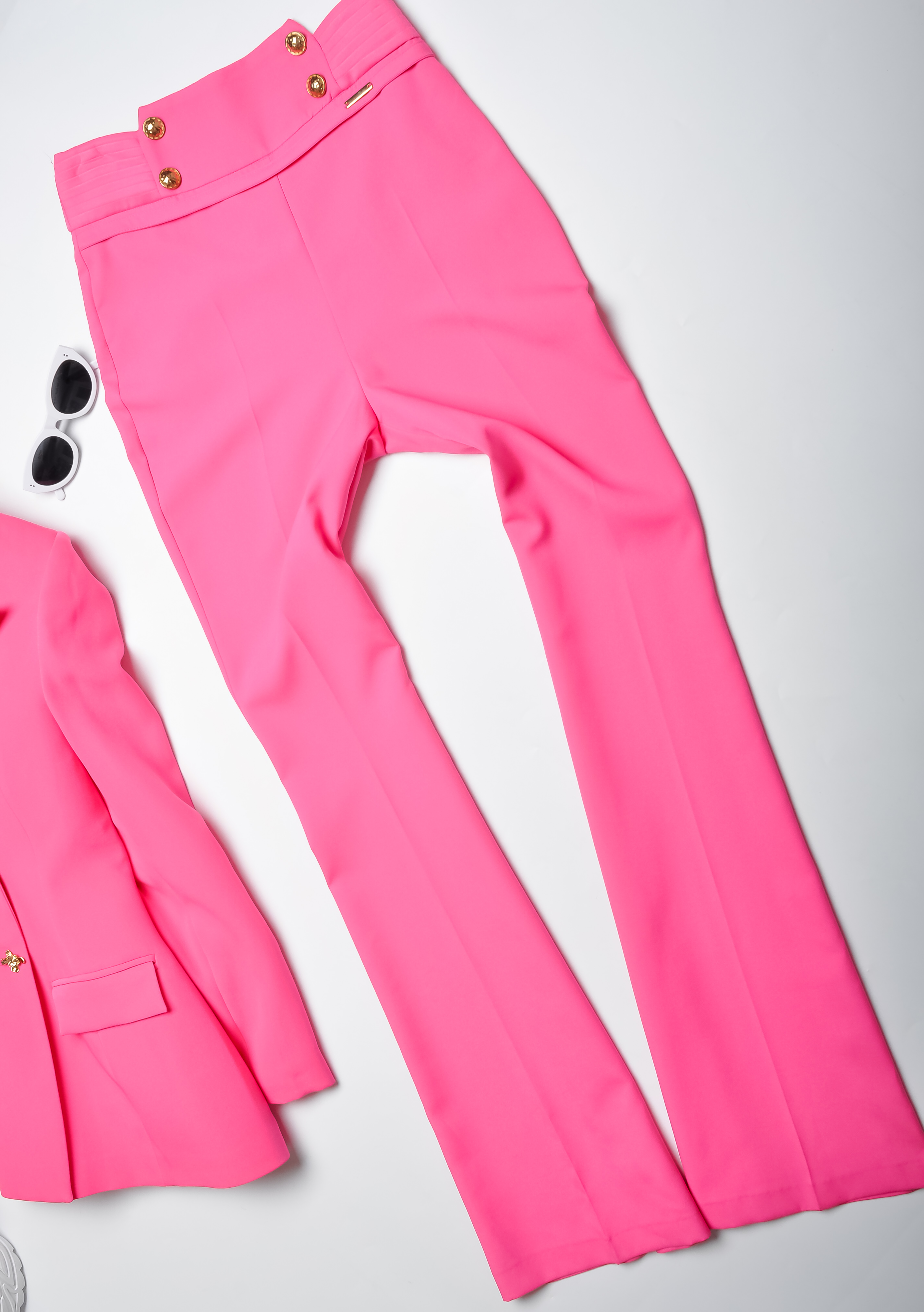 Różowe, eleganckie spodnbie z wysokim stanem - typu "FLARE". Z przodu zdobione złotymi guzikami. Zapinane na zamek, który jest z boku.
