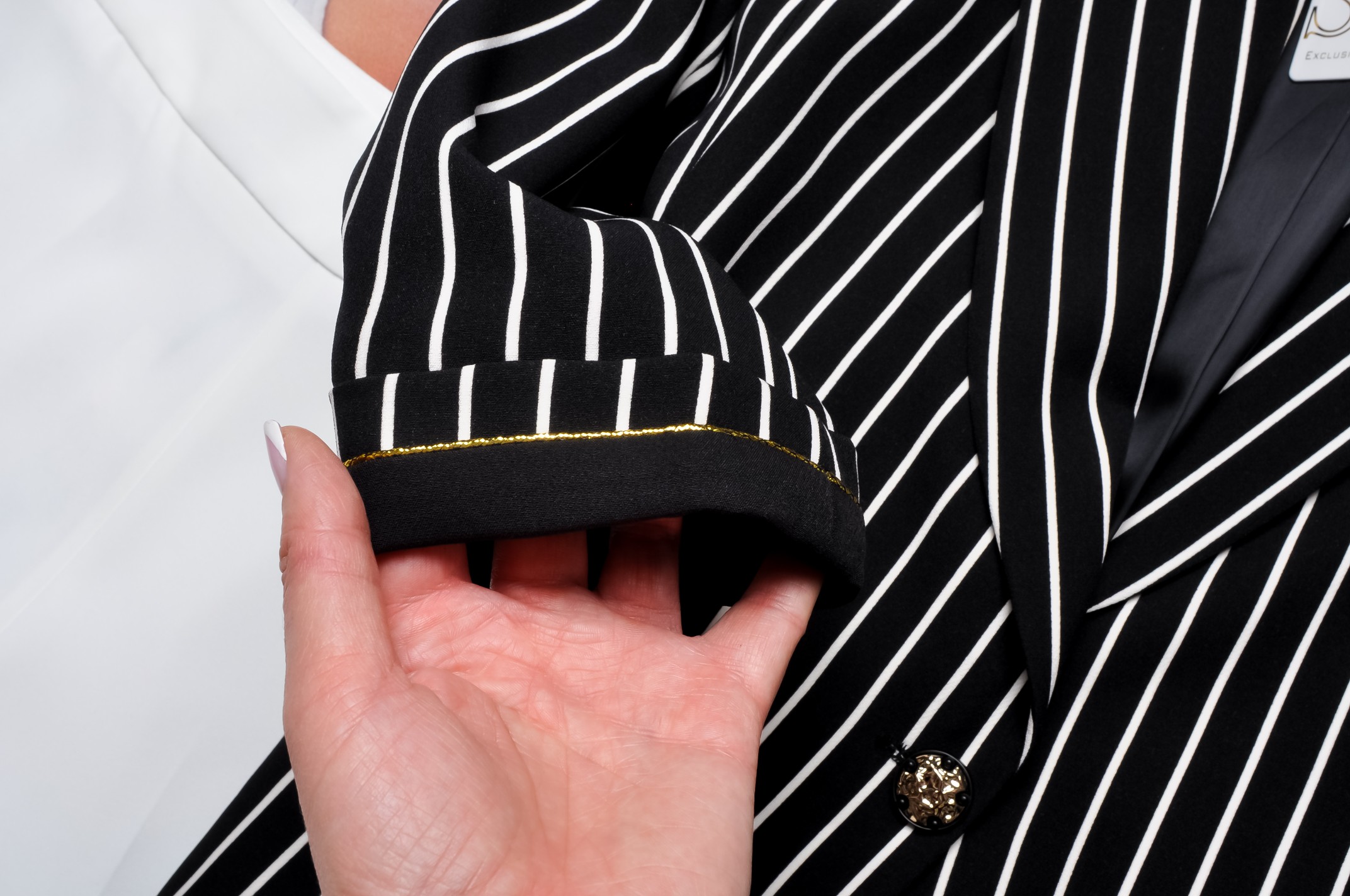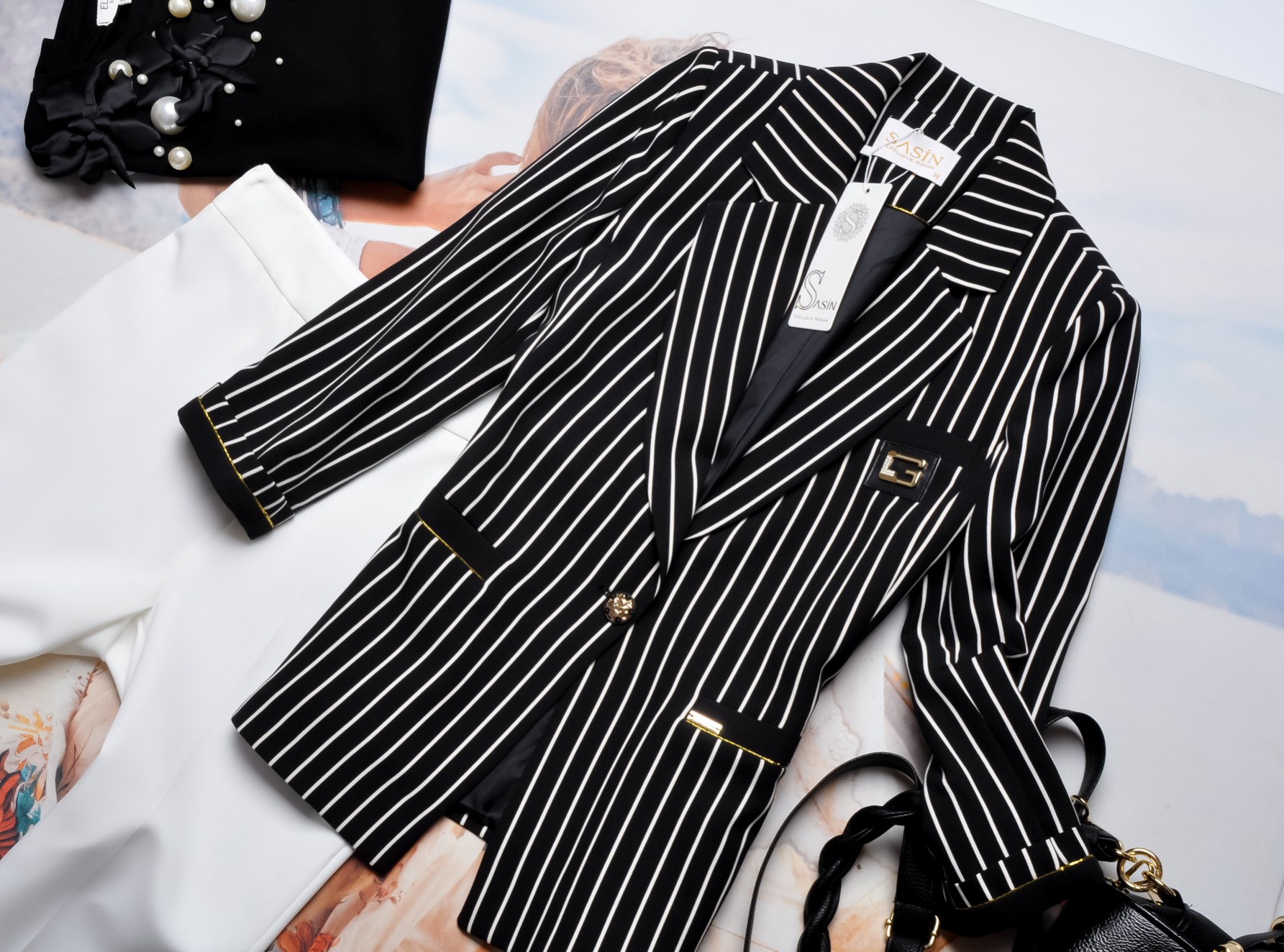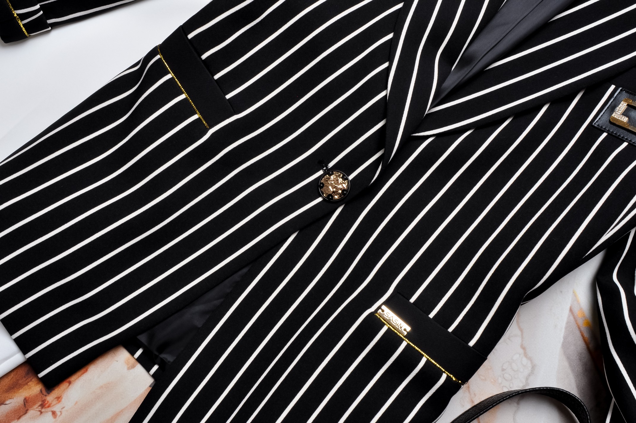 SASIN - CZARNA MARYNARKA W BIAŁE PASKI - ZŁOTE ZDOBIENIA