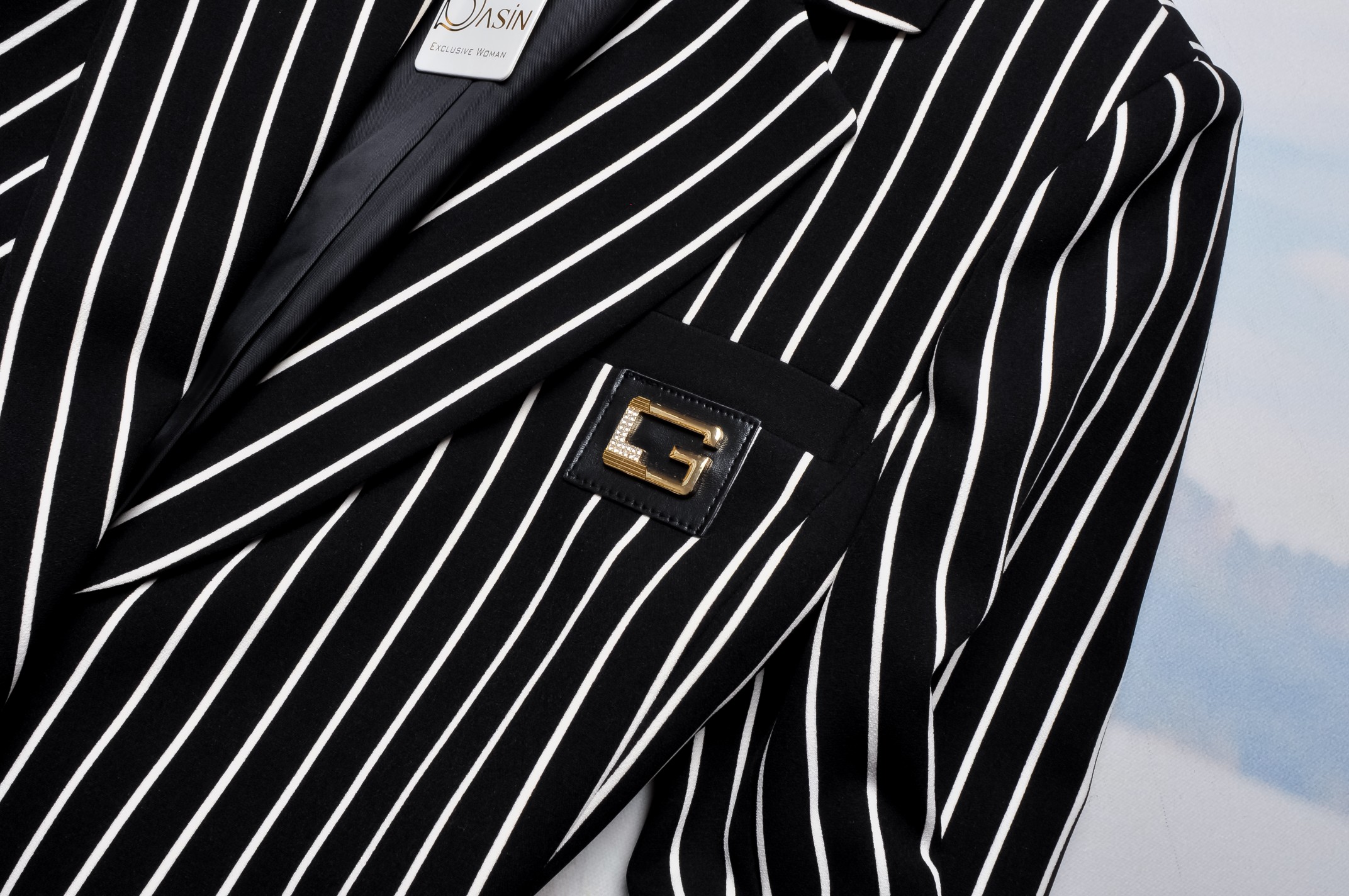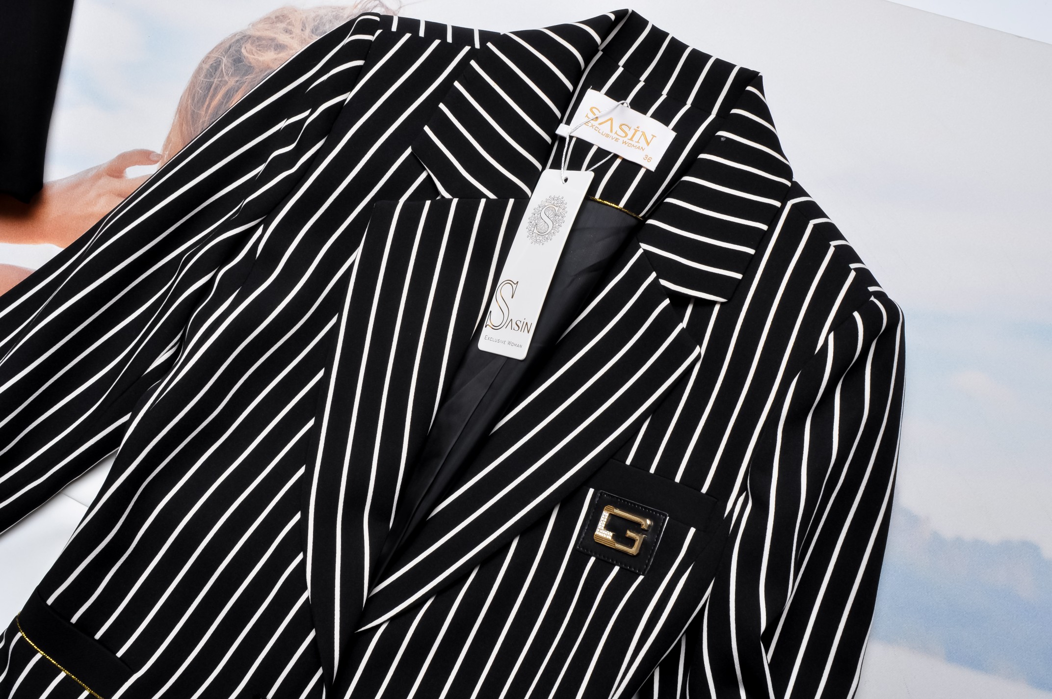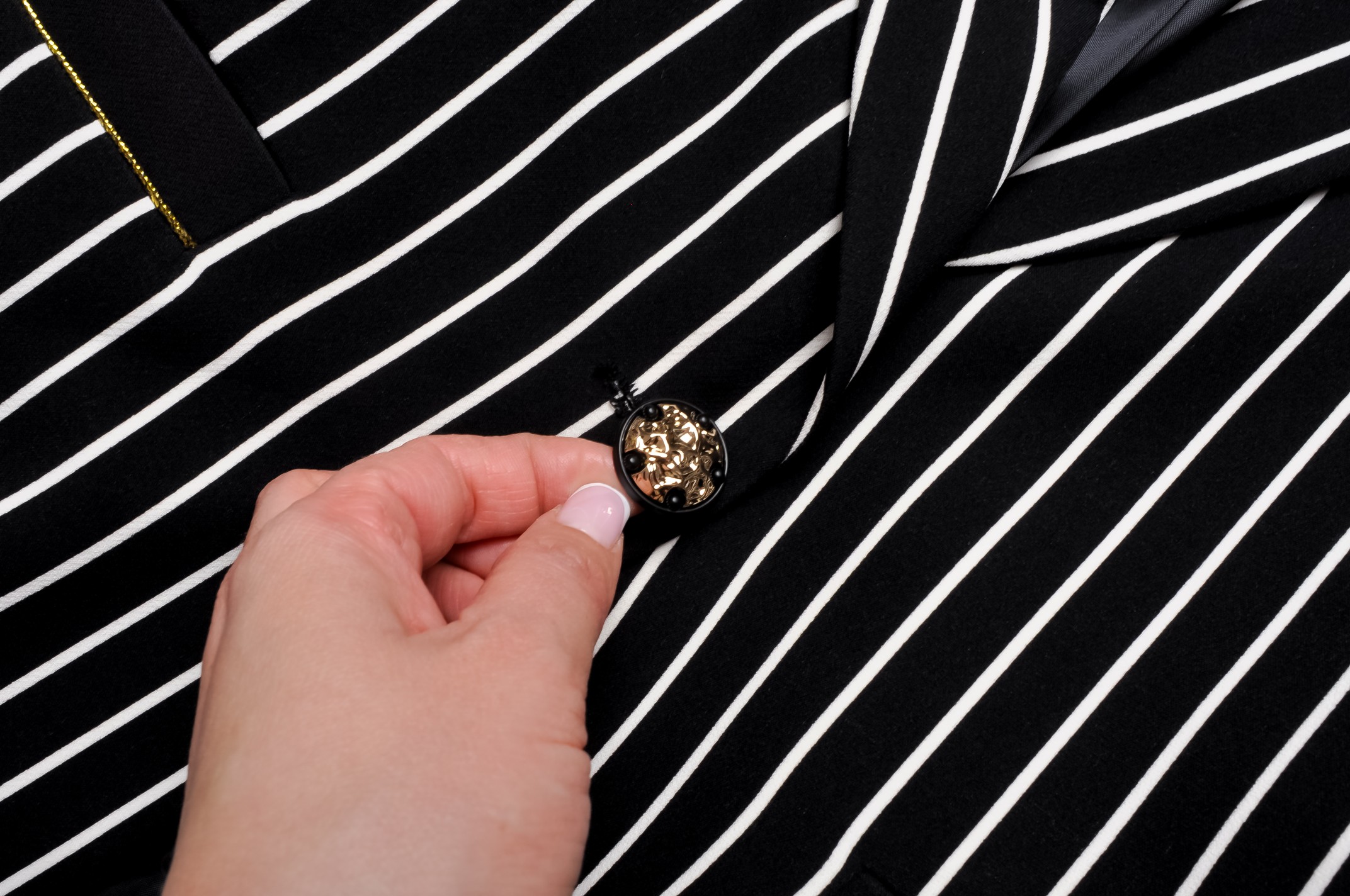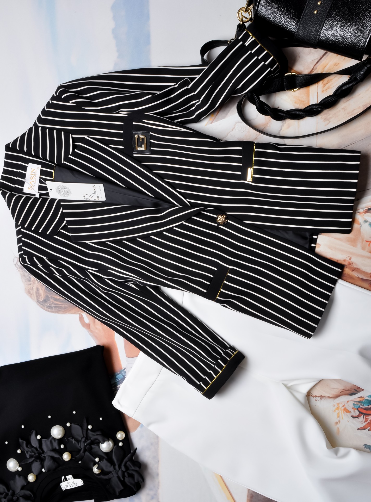 SASIN - CZARNA MARYNARKA W BIAŁE PASKI - ZŁOTE ZDOBIENIA