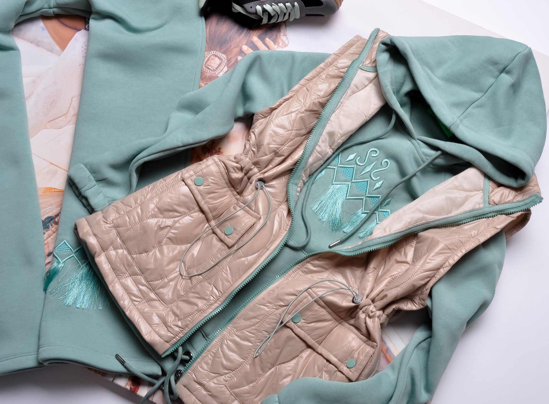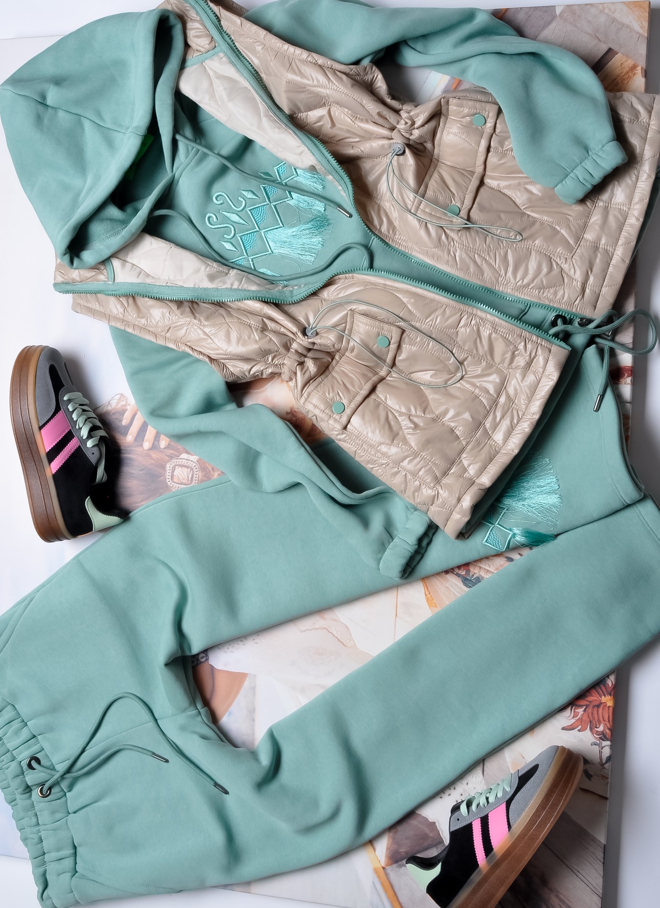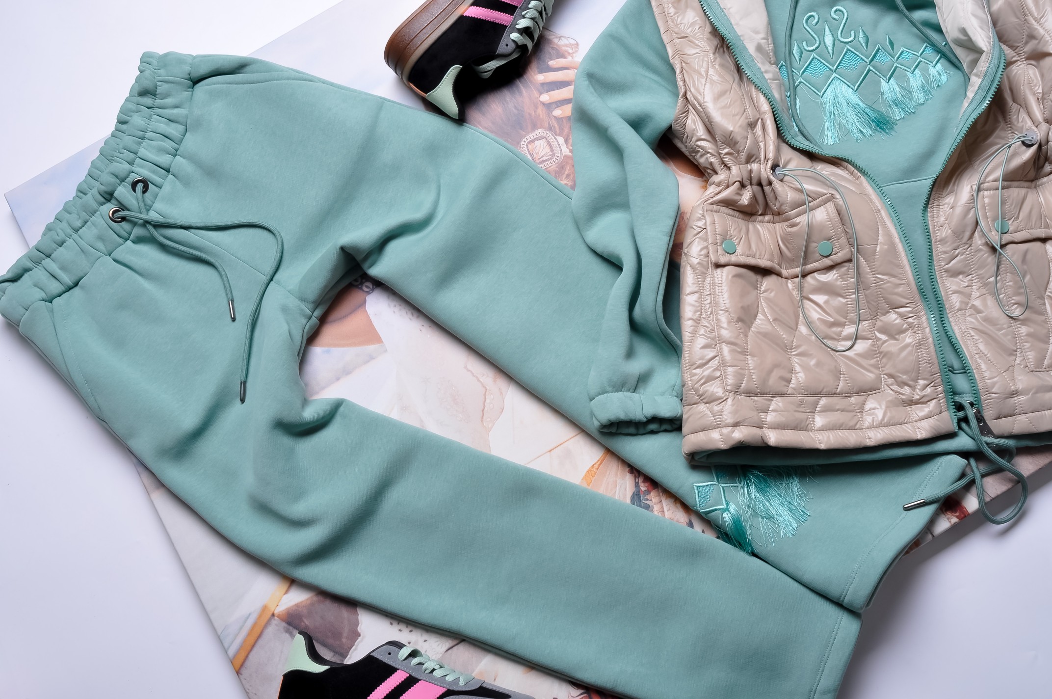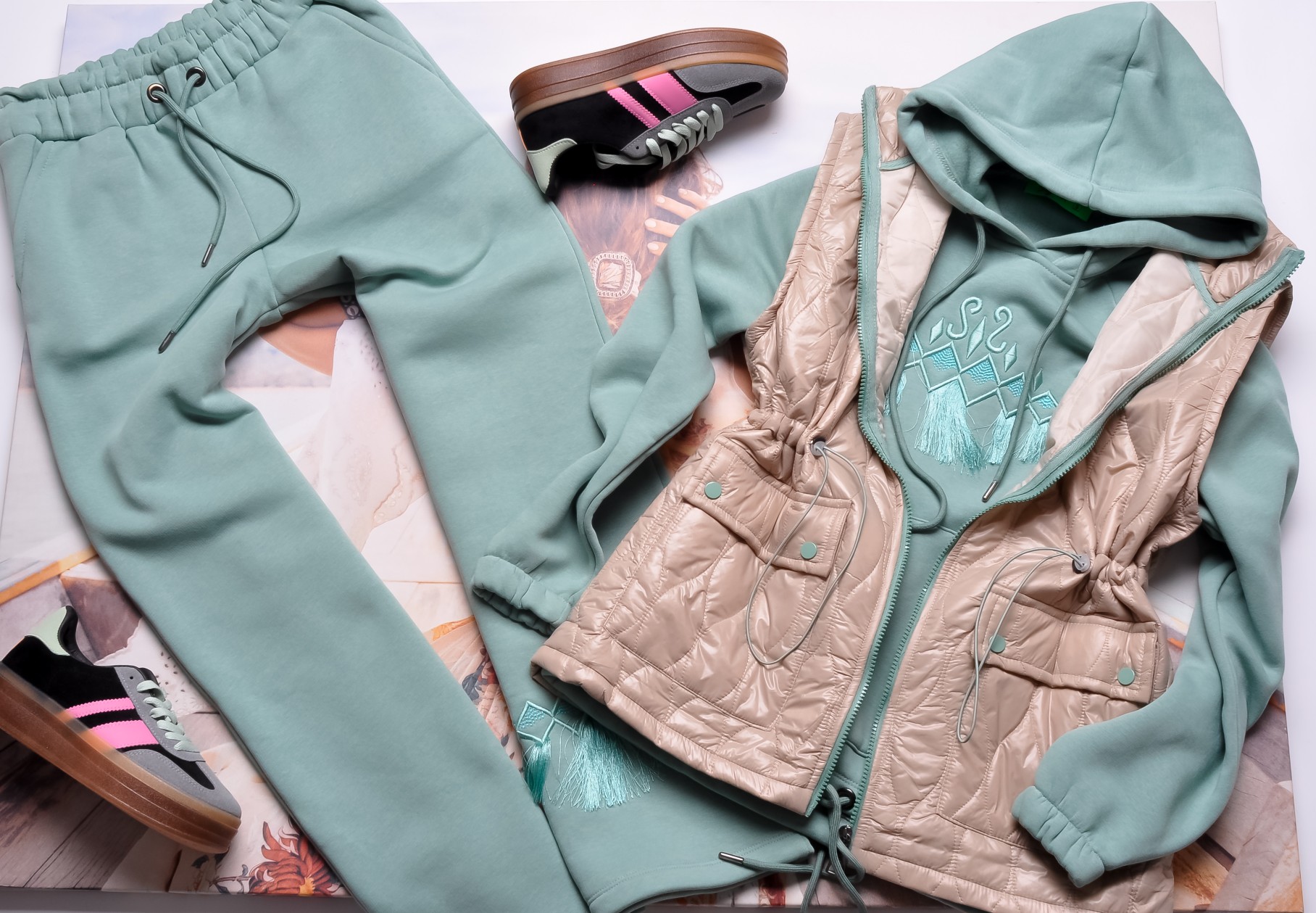 Zjawiskowy komplet skladający się z kamizelki, bluzy i spodni.