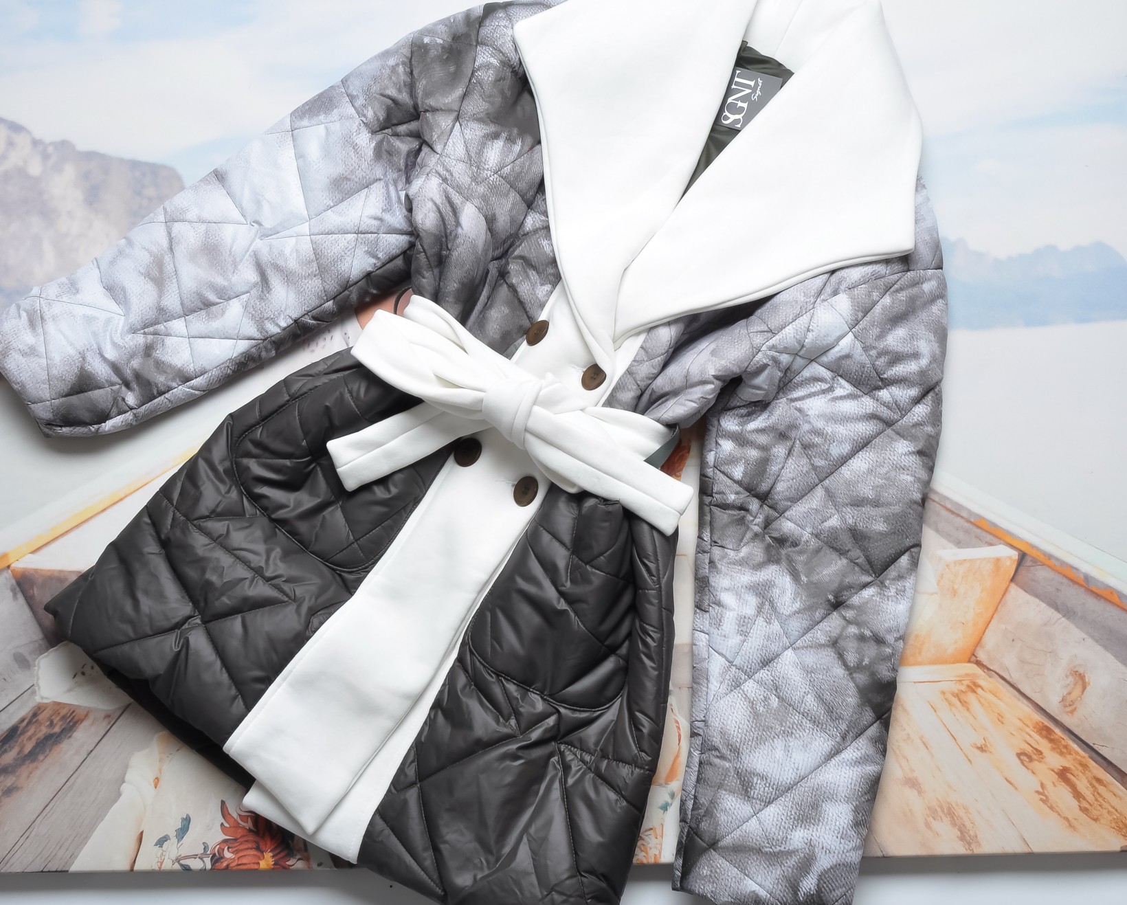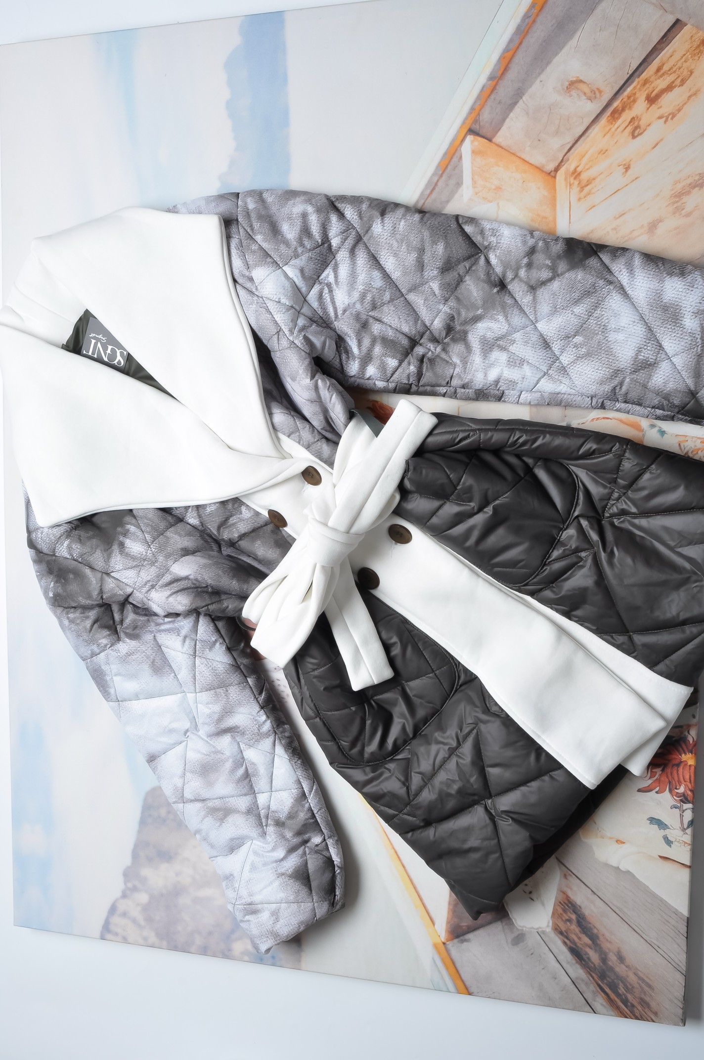 Unikalny zielony płaszcz pikowany zapinany na guziki i pasek. Materiałowa stójka w kolorze ecru. Z przodu dwie pojemne kieszenie. Materiał nie jest elastyczny.