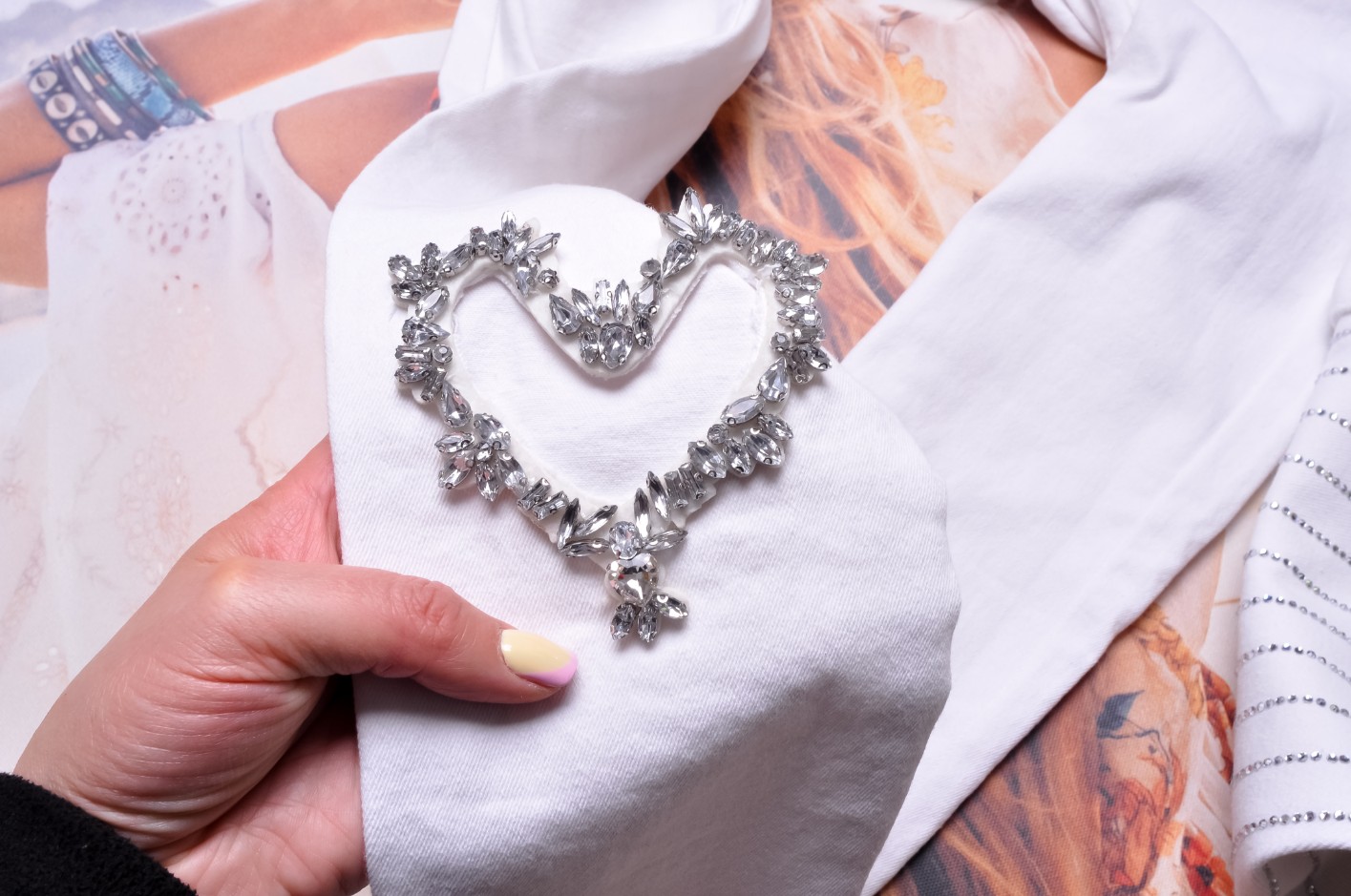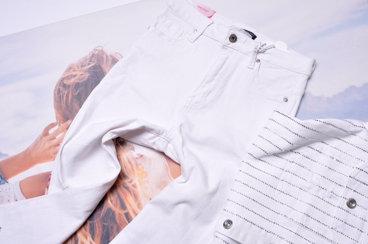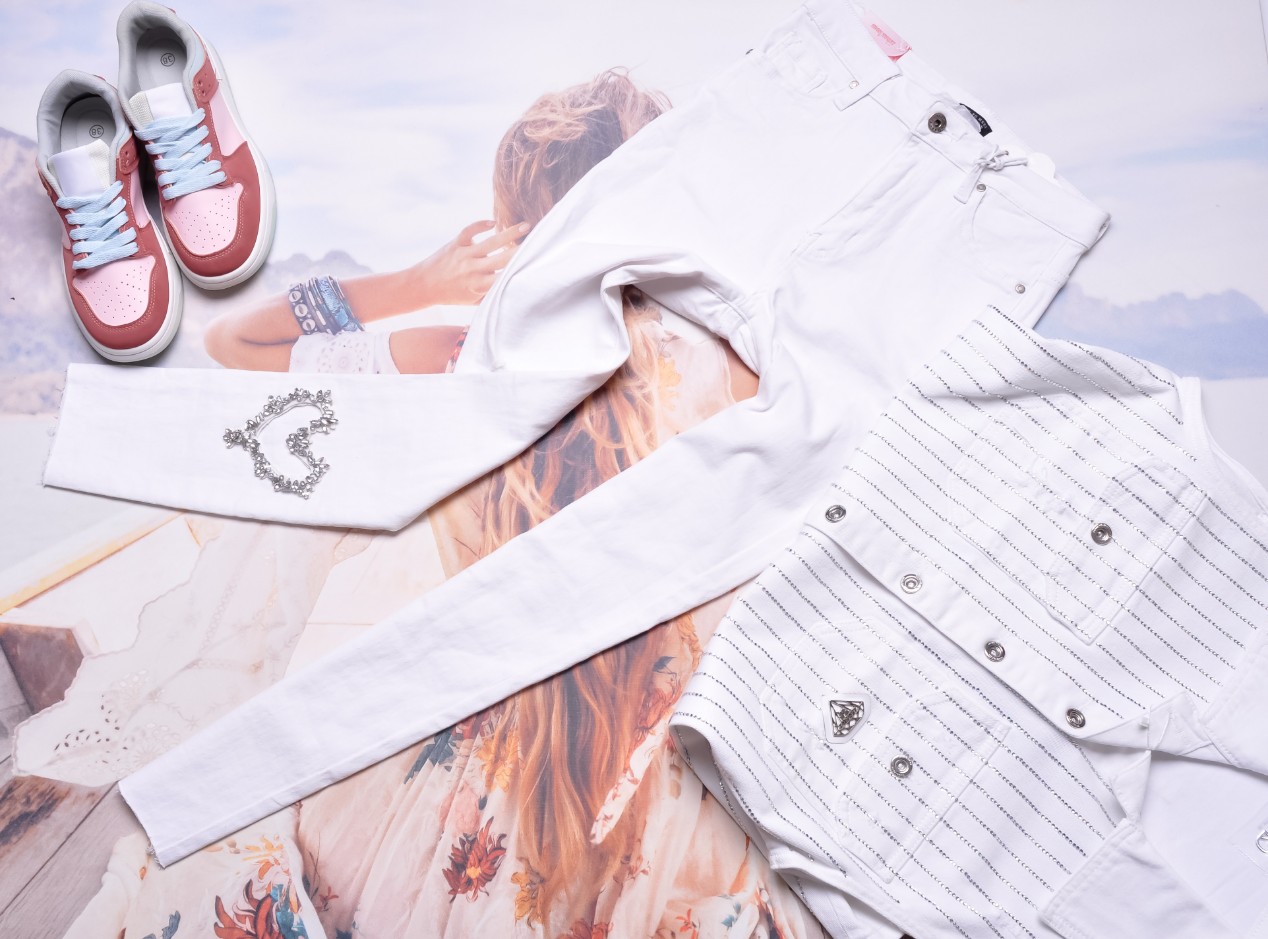 Jeansy w białym kolorze. Model SKINNY z wysoką talią. Zapinane na zamek oraz guziczek. Z przodu i z tyłu dwie kieszenie. Nogawki zwężane - przylegające. Z tyłu na nogawce wycięcie na zdobione cyrkoniami serduszko. Nogawki surowo zakończone.