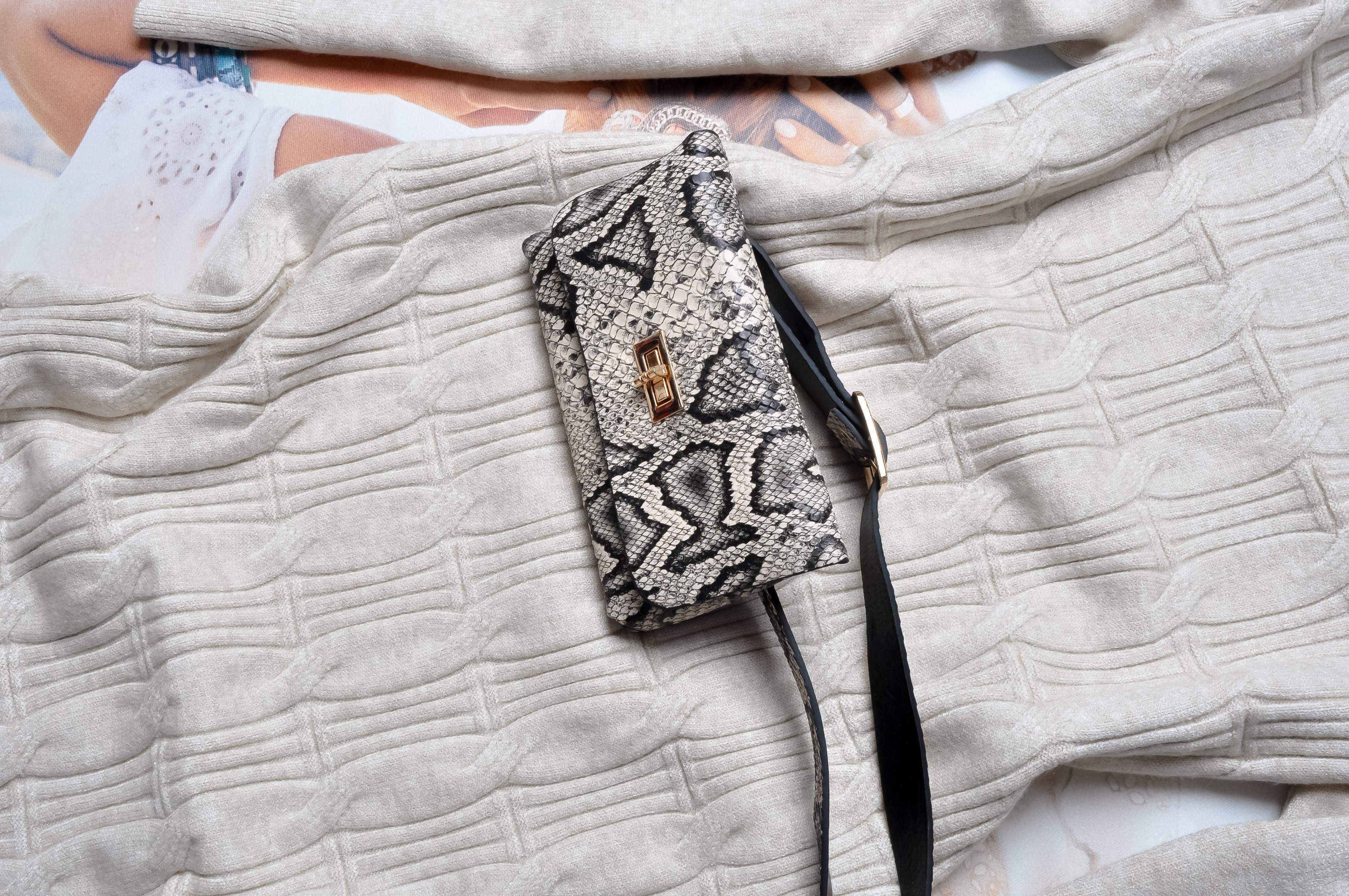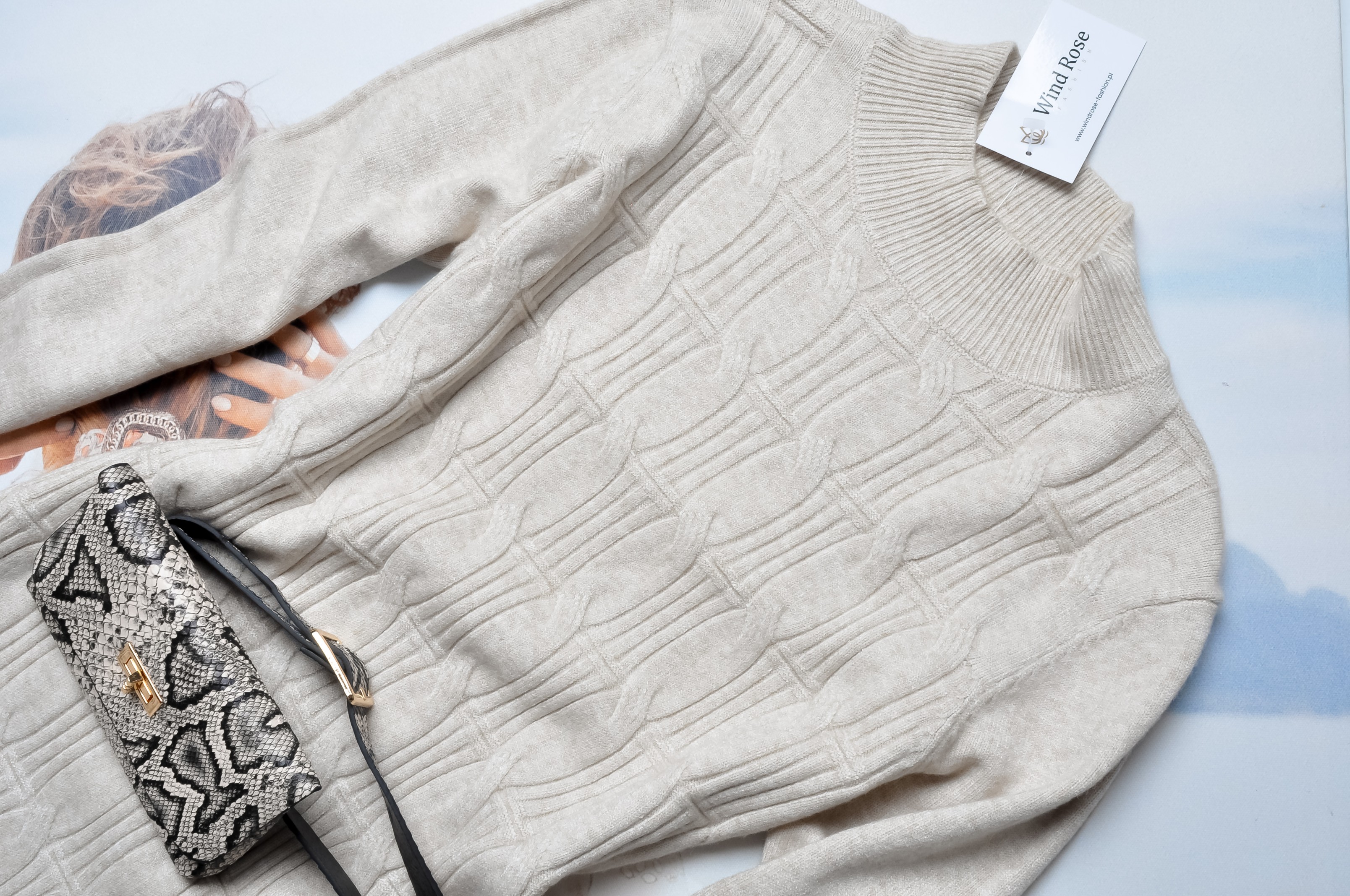 Elegancka sukienka w kolorze beżowym. Wkładana przez głowę, prosty krój. Z motywem warkoczowego splotu. Golfik. Rękawy długie. Fason dopasowany. Do zestawu pasek z torebeczką w motywie węża.