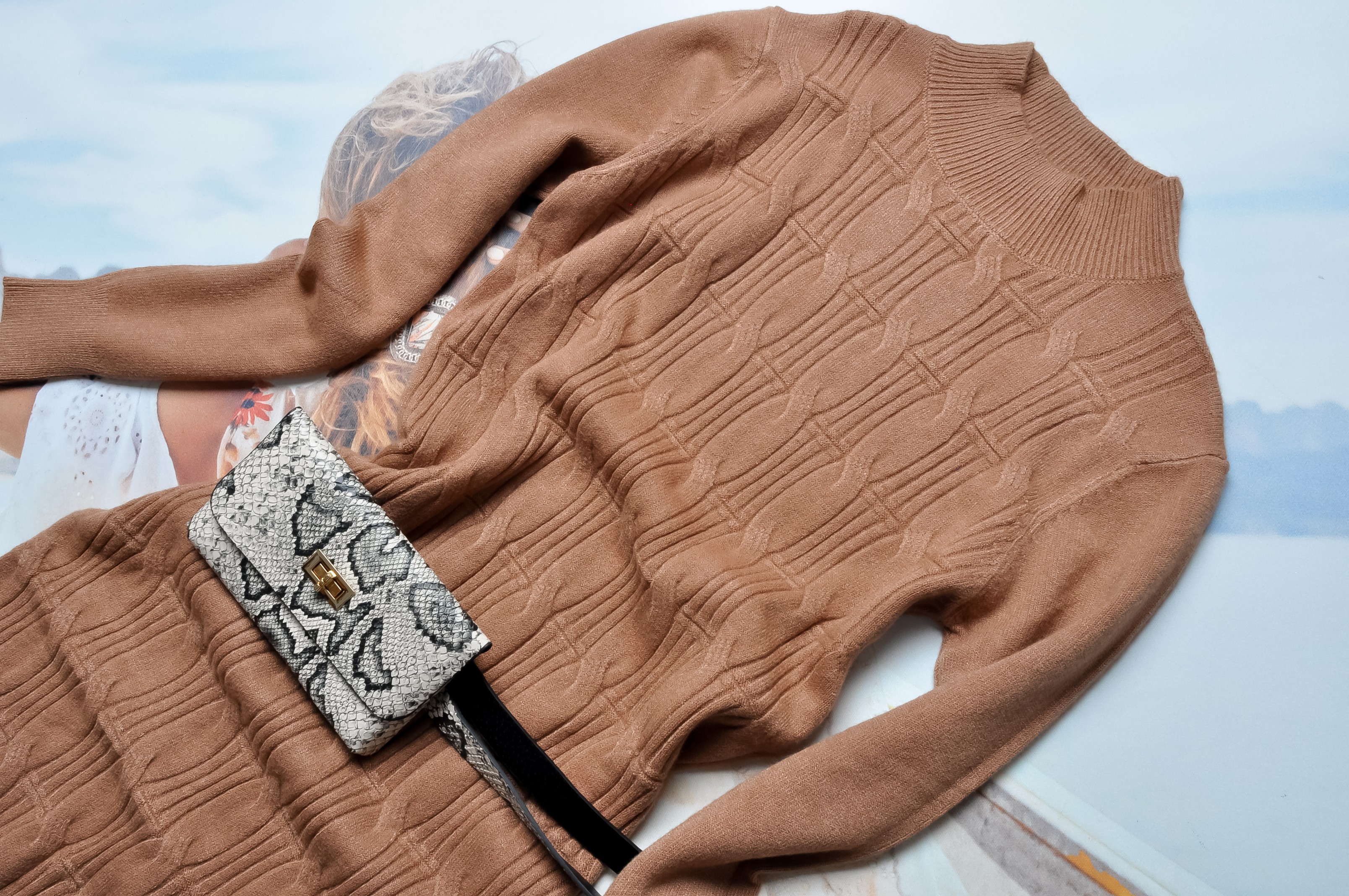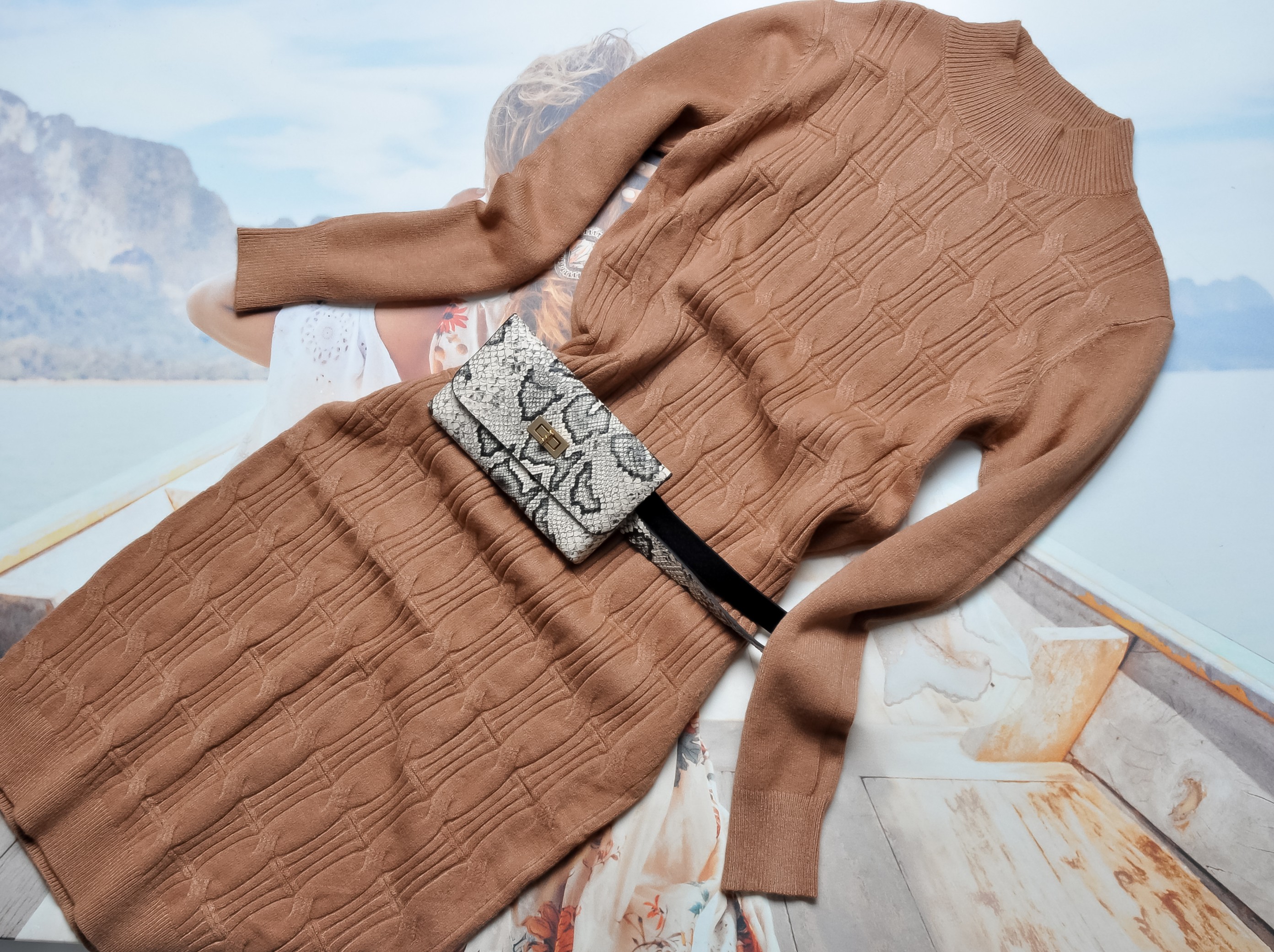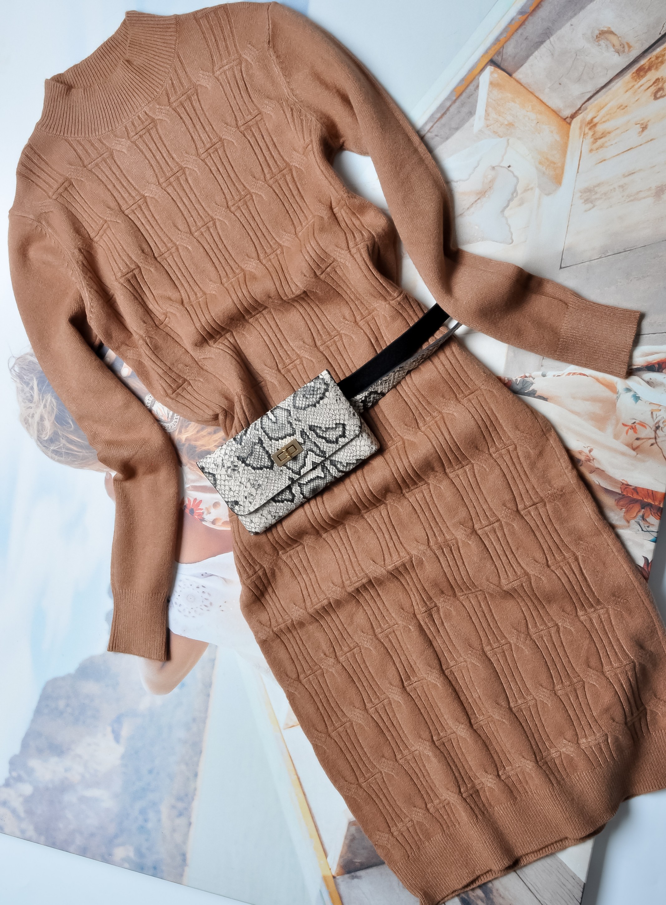 Elegancka sukienka w kolorze karmelowym. Wkładana przez głowę, prosty krój. Z motywem warkoczowego splotu. Golfik. Rękawy długie. Fason dopasowany. Do zestawu pasek z torebeczką w motywie węża.