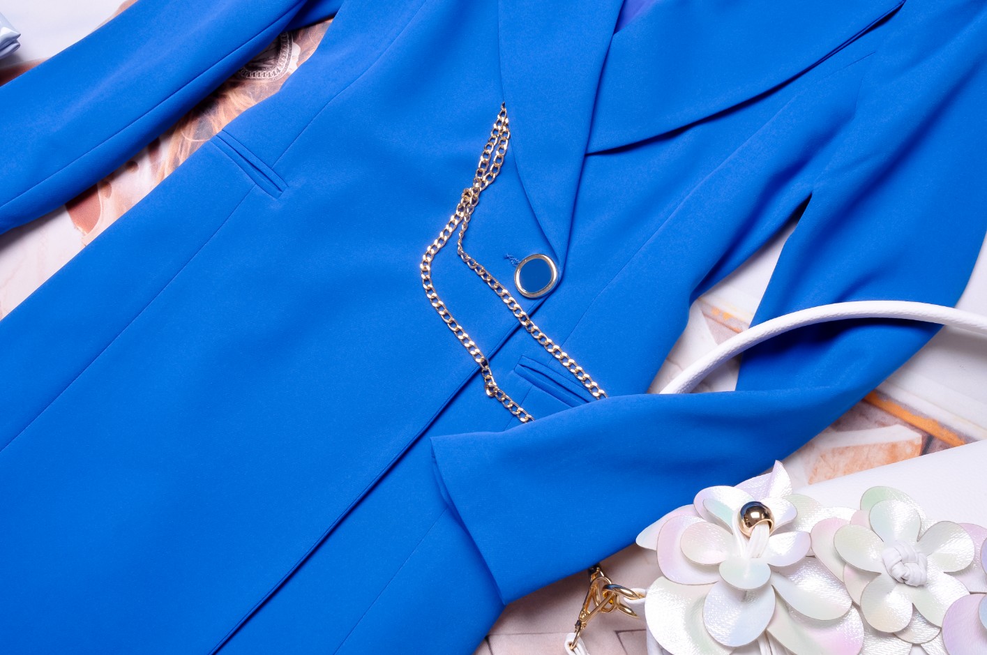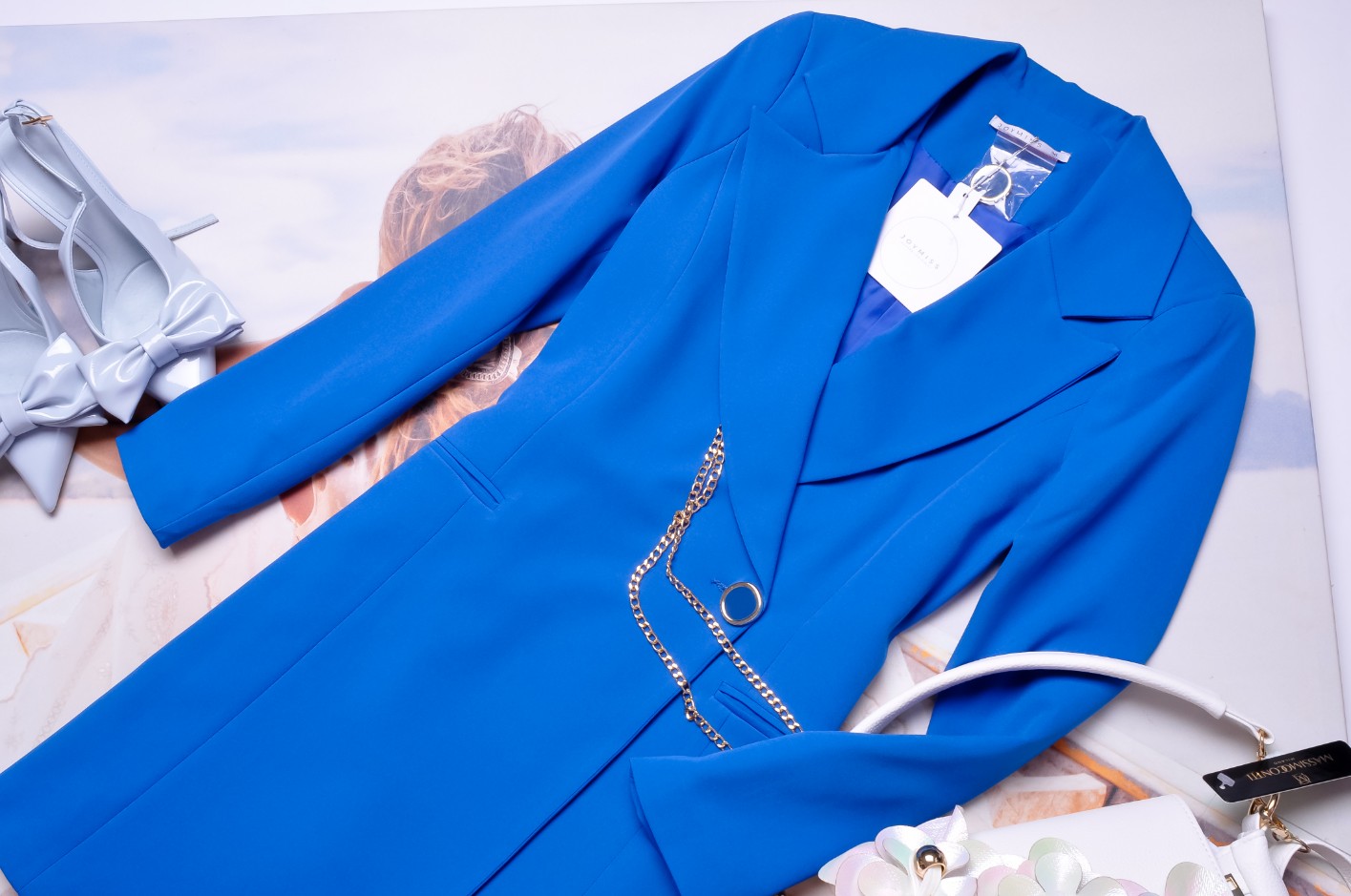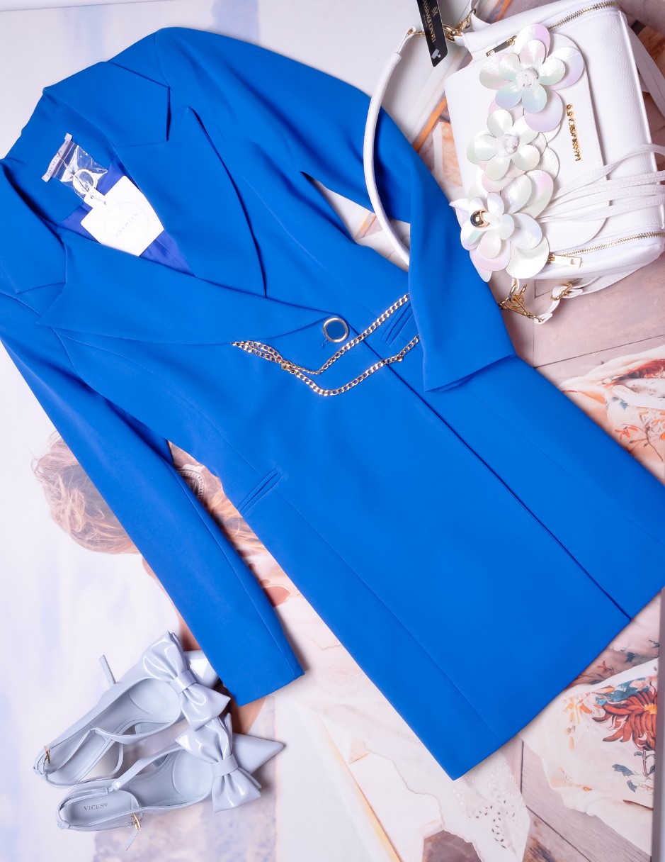 Piękna sukienka w kolorze chabrowym. Model w stylu marynarki. Rękawy długie. Po bokach dwie imitacje kieszeni. Z przodu przypinany złoty łańcuszek. Fason lekko przylegający. Materiał nie jest elastyczny.