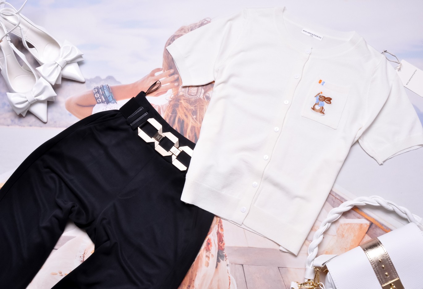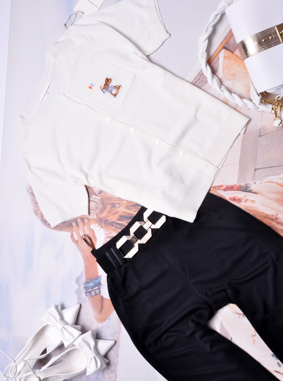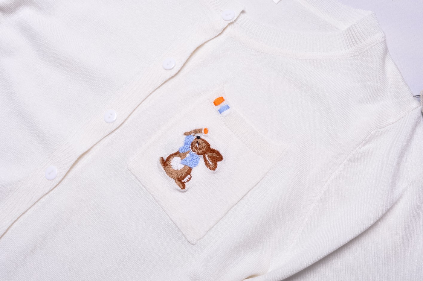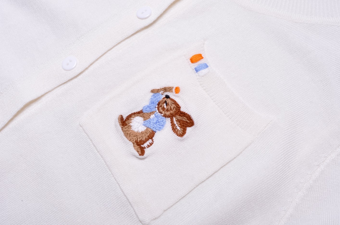 Uroczy sweterek w kolorze ecru z uroczym, wyszywanym króliczkiem na kieszonce. Zapinany na guziki. Rękawy krótkie. Okrągły dekolt. Materiał miękki, lekko elastyczny.