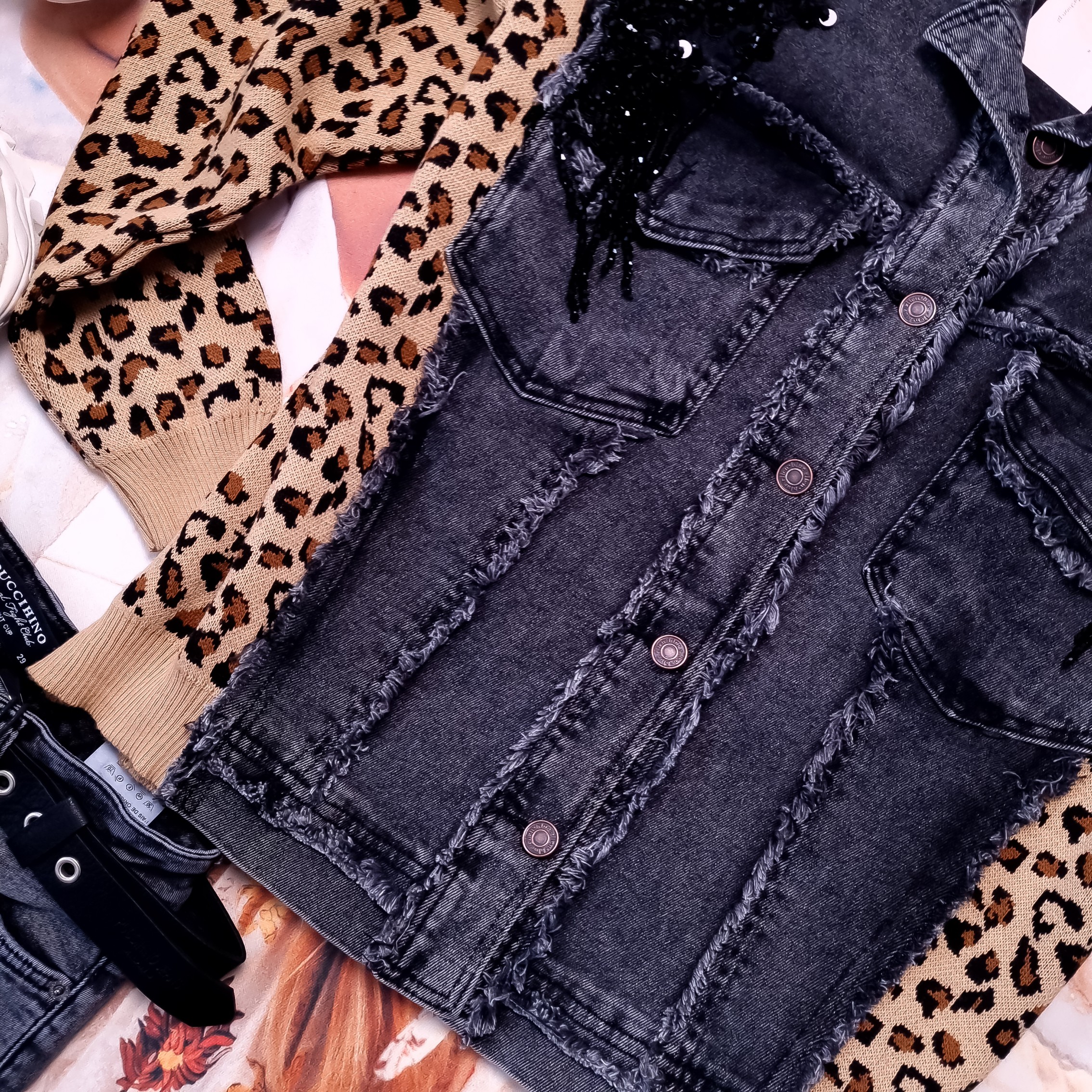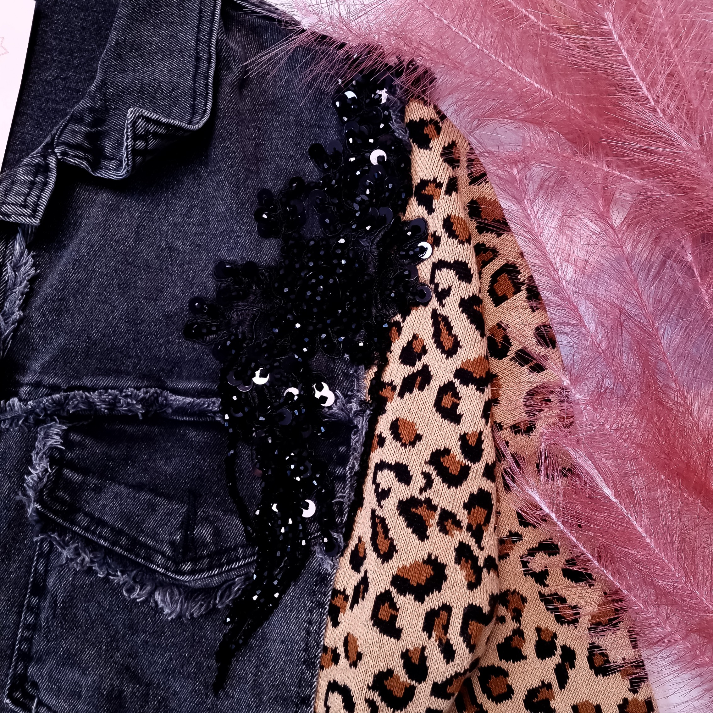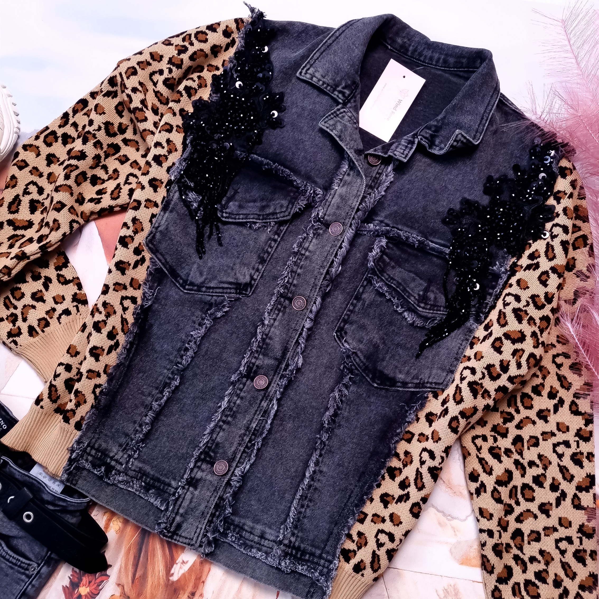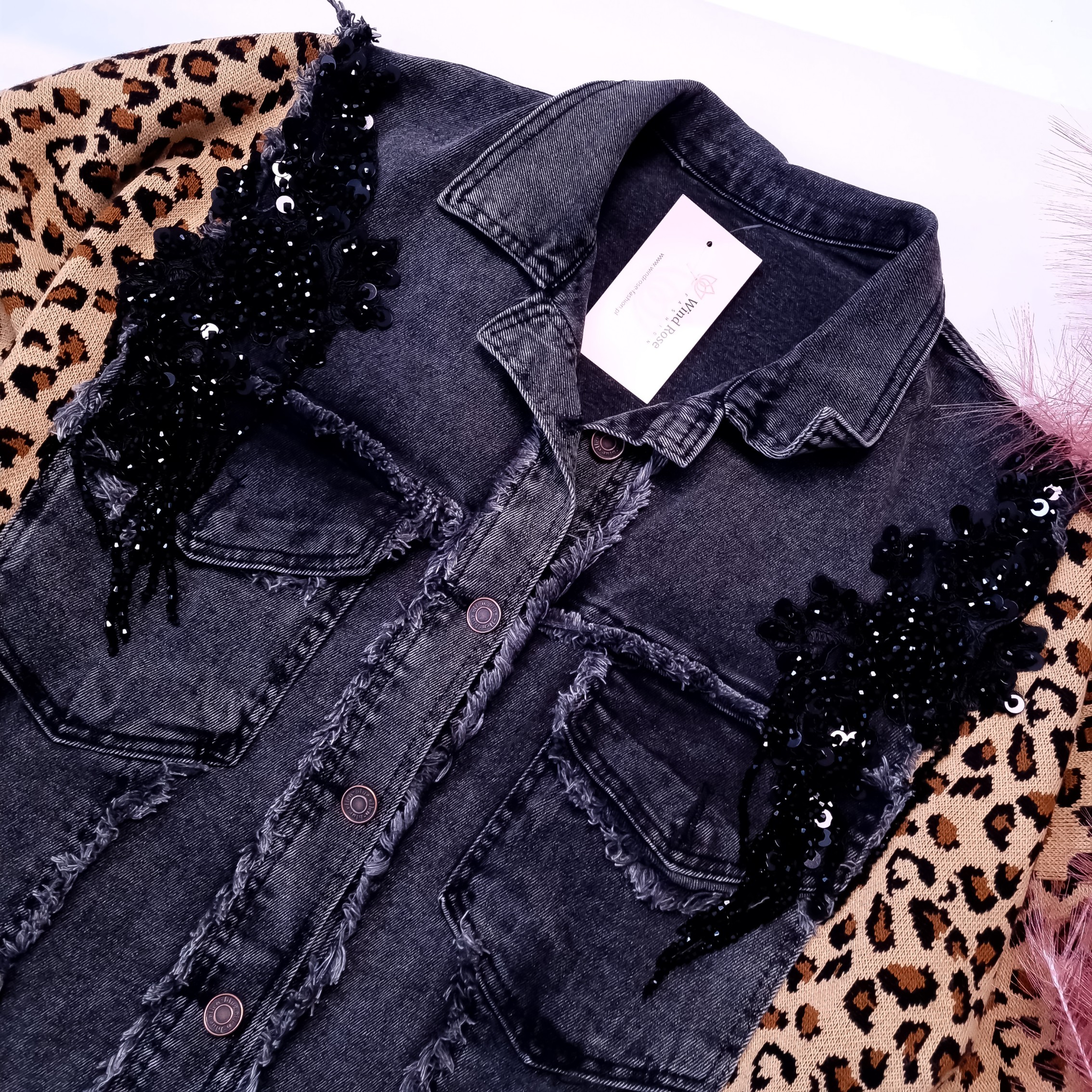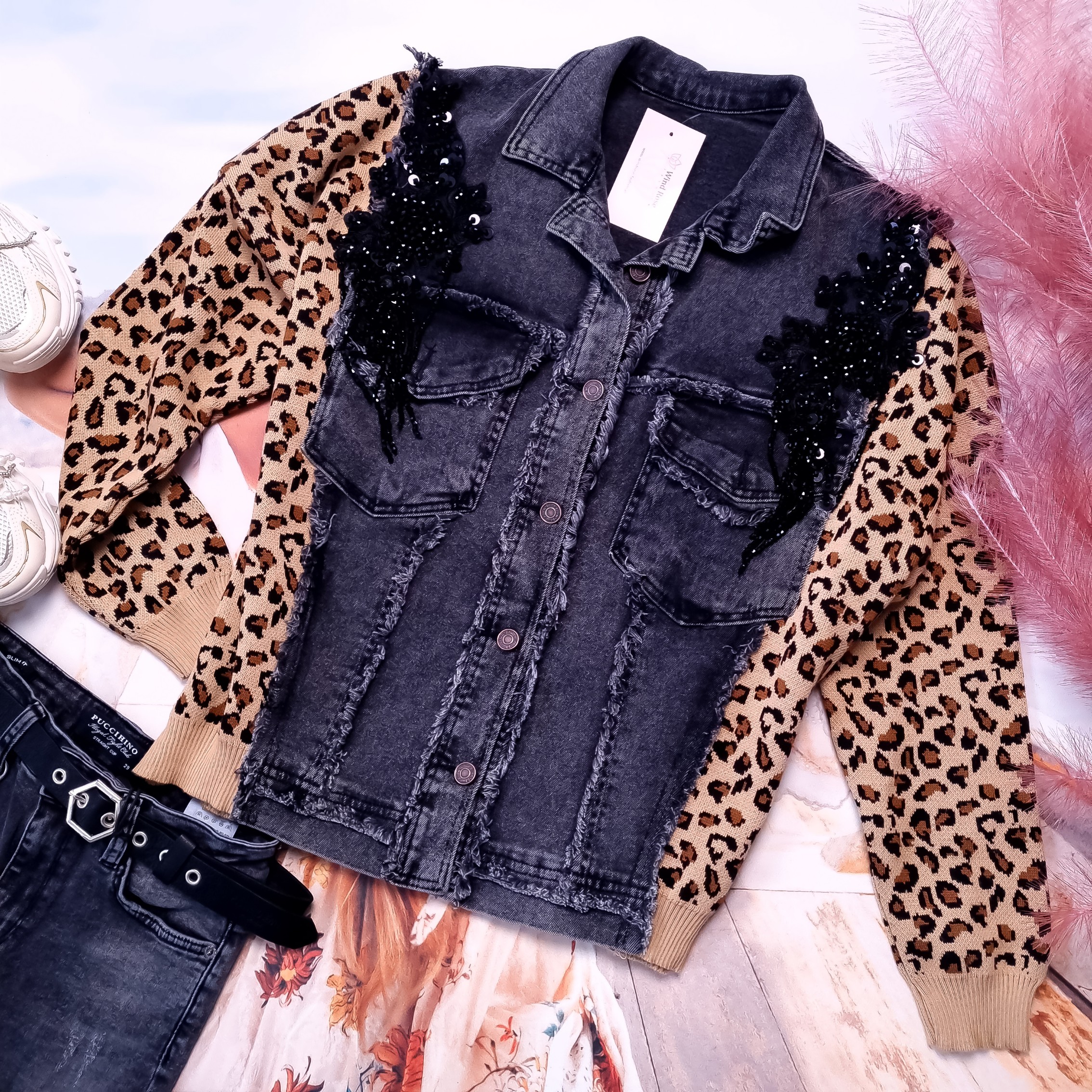 Jeansowa kurtka zapinana na guziki, o fasonie swobodnym, w kolorze szarym. Zdobiona czarnymi cyrkoniami na ramionach. Z przodu dwie kieszenie. Rękawy i boki kurtki są sweterkowe w motywie cętek. Fason oversize, obniżona linia ramion. Wysoka jakość.