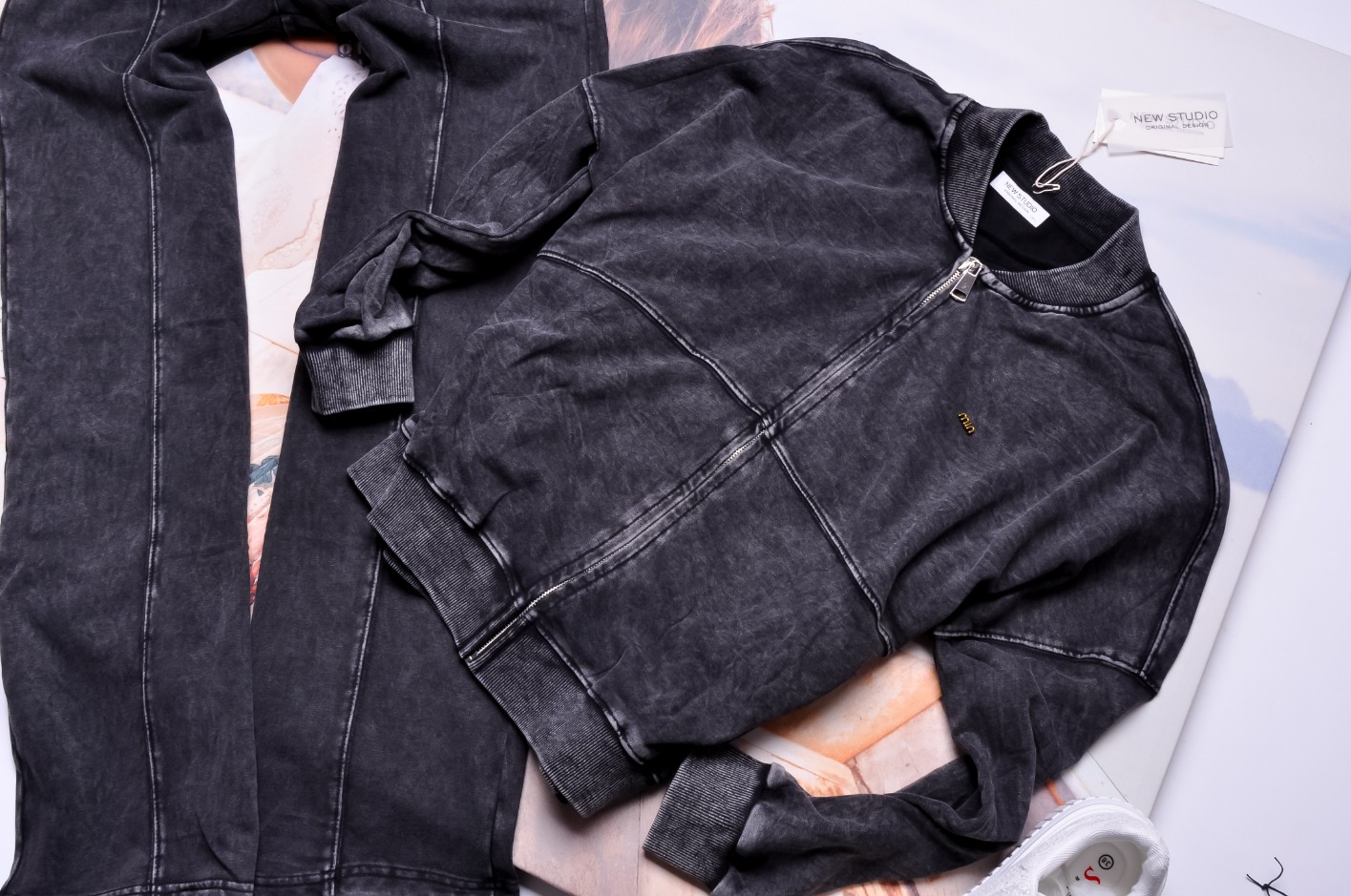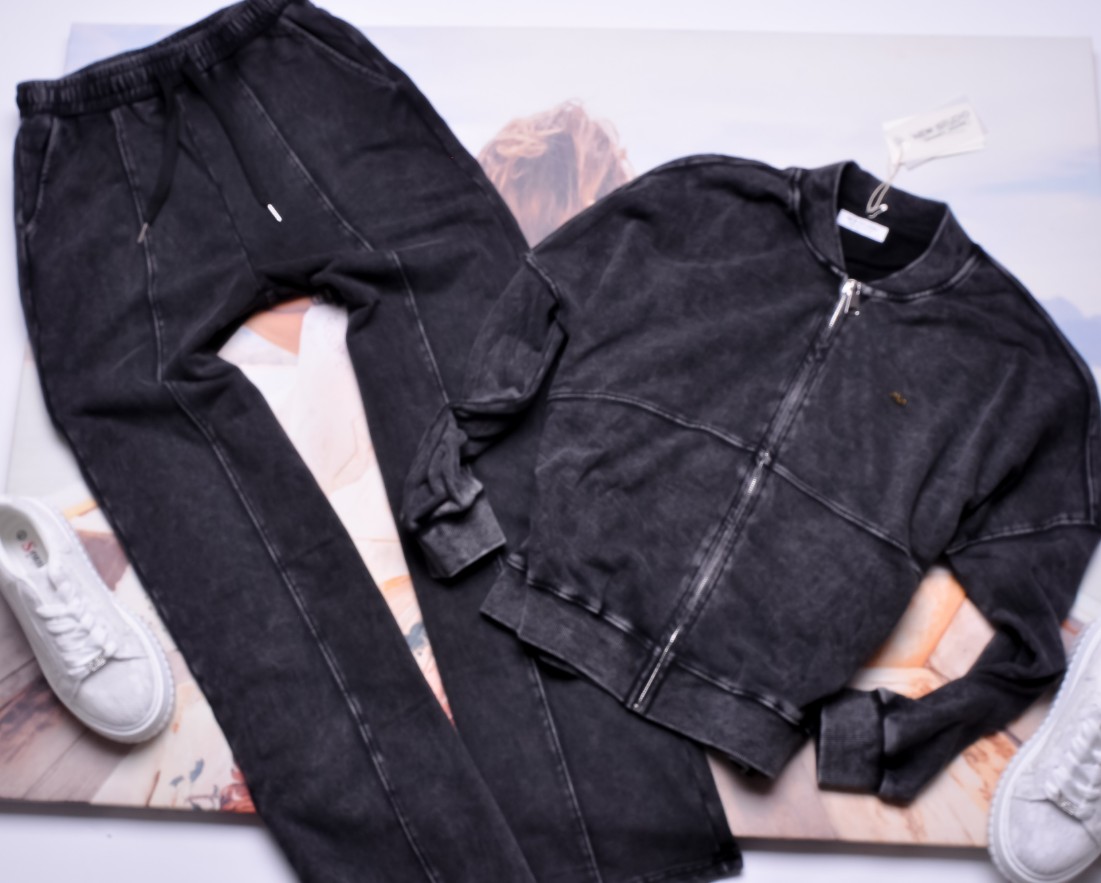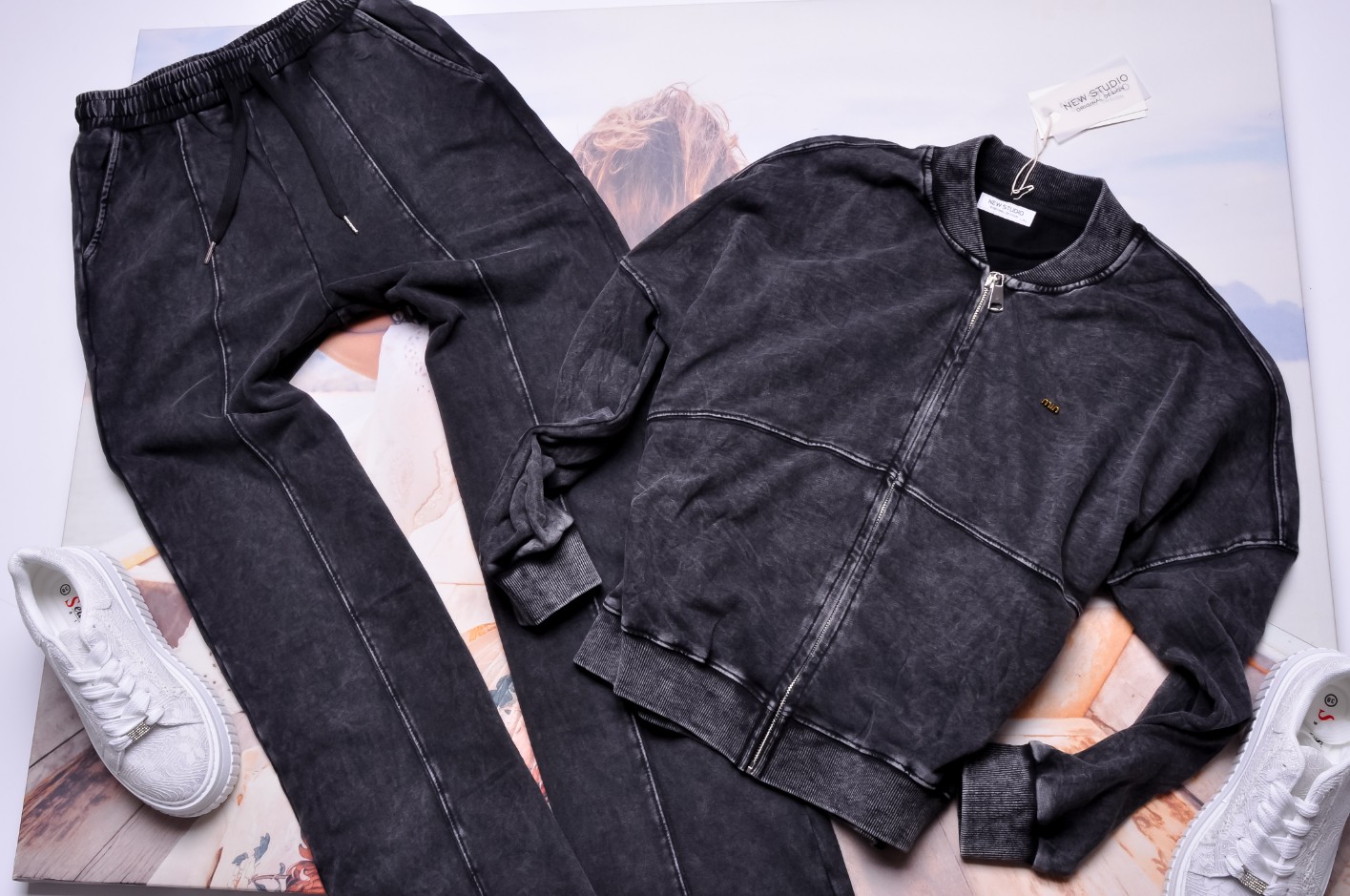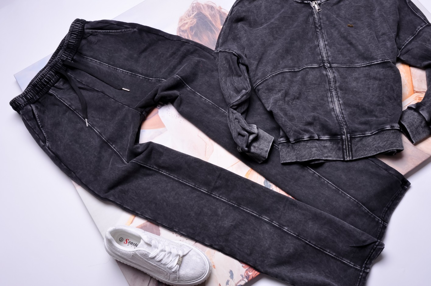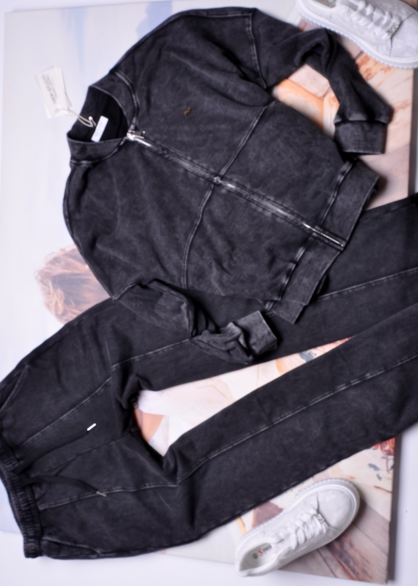 Dwuczęściowy dres składający się z bluzy i spodni w szarym kolorze. Bluza o fasonie luźnym, nieprzylegającym, zapinana na zamek. Rękawy długie.
