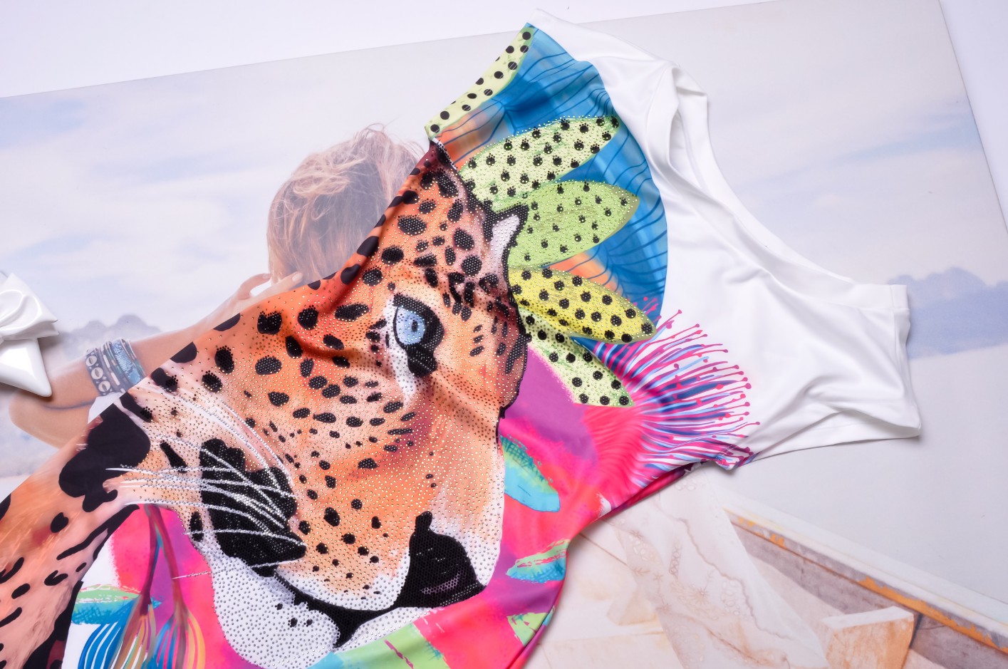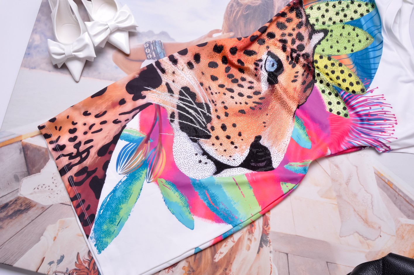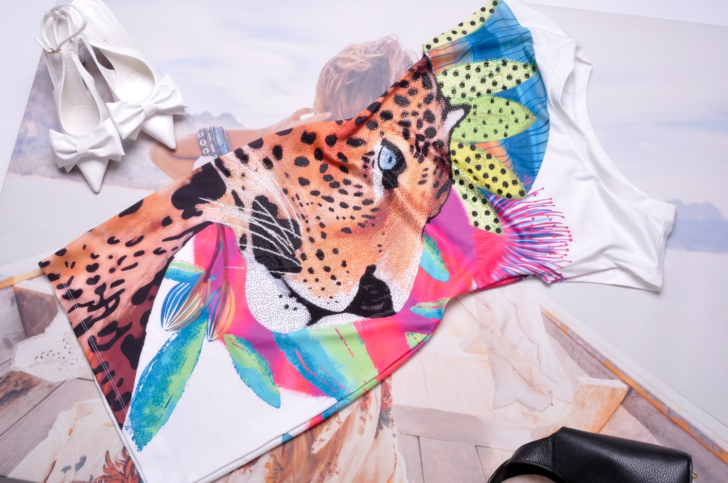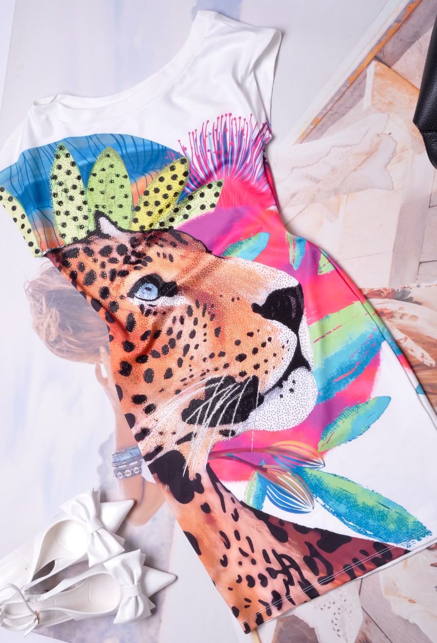 Dopasowana sukienka z motywem pantery wykończona błyszczącymi cyrkoniami. Wykonana z opinającego elastycznego materiału przez co świetnie dopasowuje się do ciała podkreślając sylwetkę. Rękawy krótkie. Dekolt okrągły. Model taliowany.