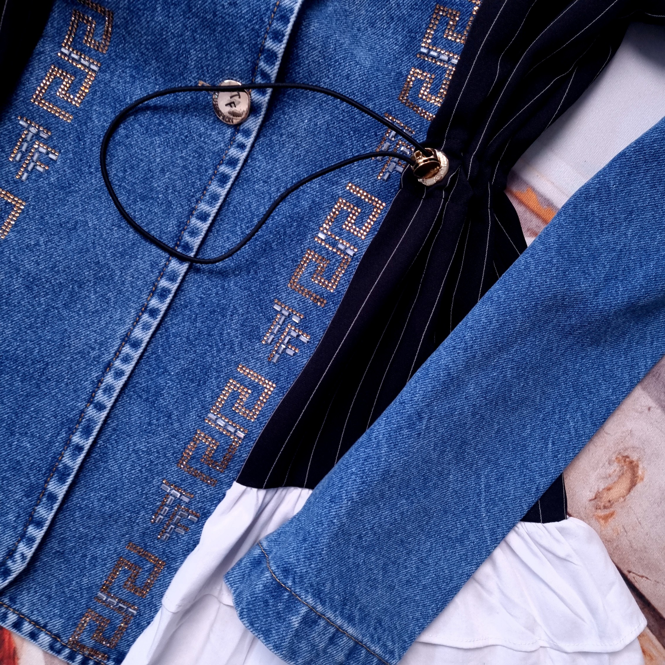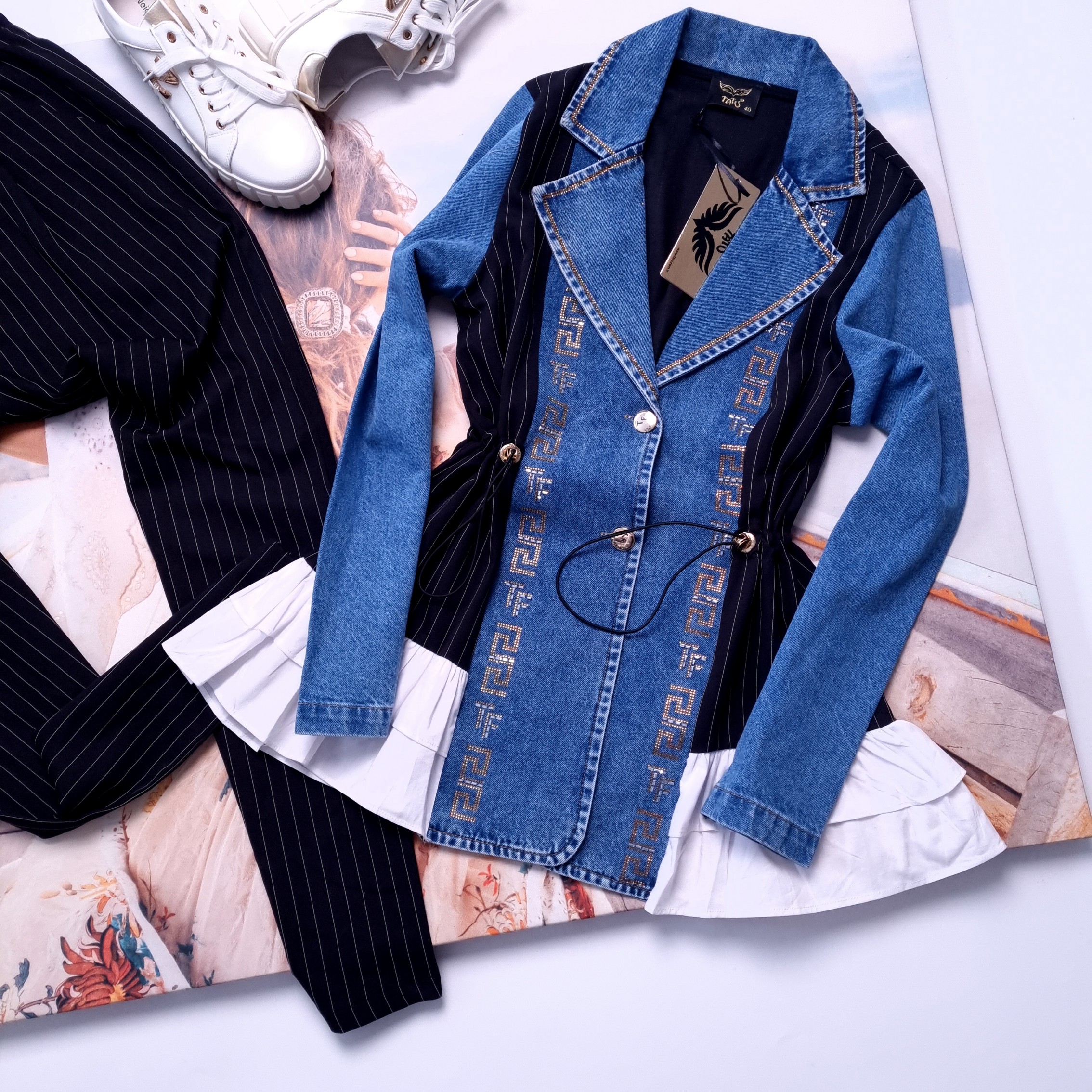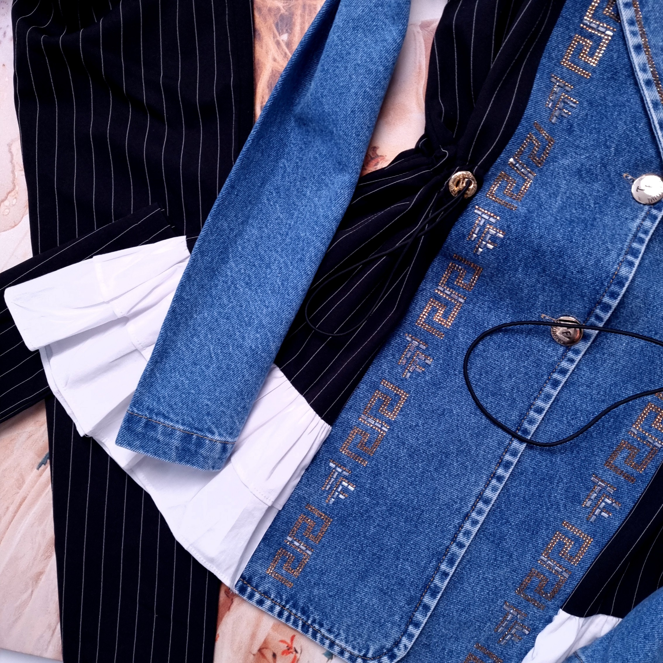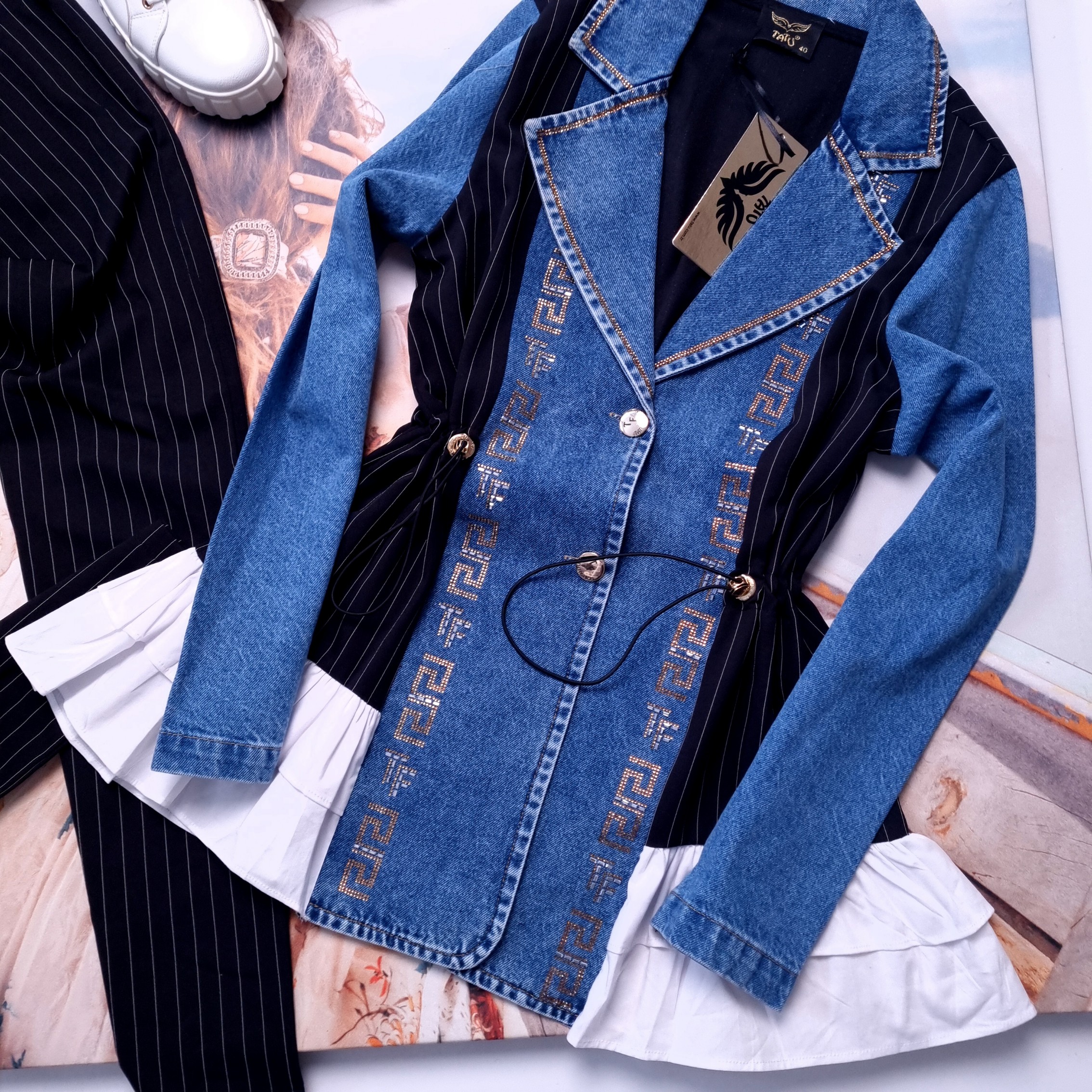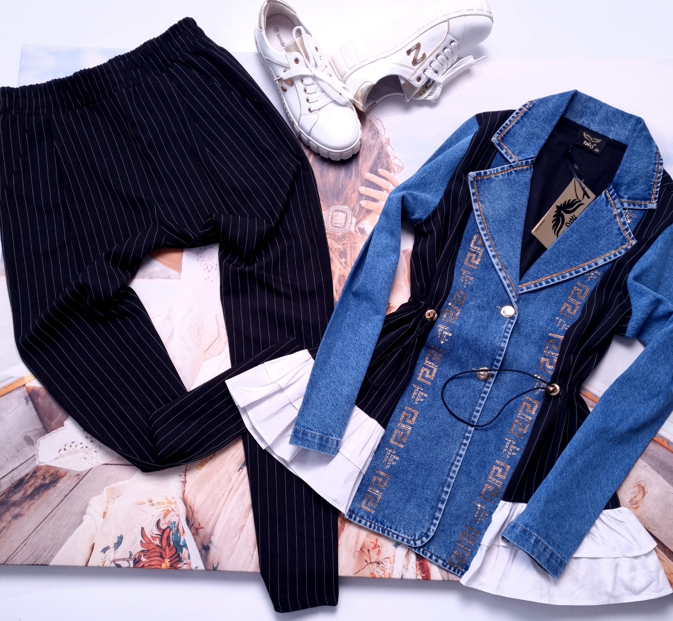 Komplet dwuczęściowy ze spodniami i długą marynarką. Góra o fasonie oversize, nieprzylegającym. Przód i rękawy jeansowe. Tył elegancki, garniturowy - czarny z delikatnymi, białymi paskami. Został wykończony rozkloszowanym, białym, koszulowym materiałem. Stójka i przód wysadzany cekinami. Rękawy długie, zakończone mankietami. Zapinana na guziki. W pasie ściągacze do podkreślenia talii.