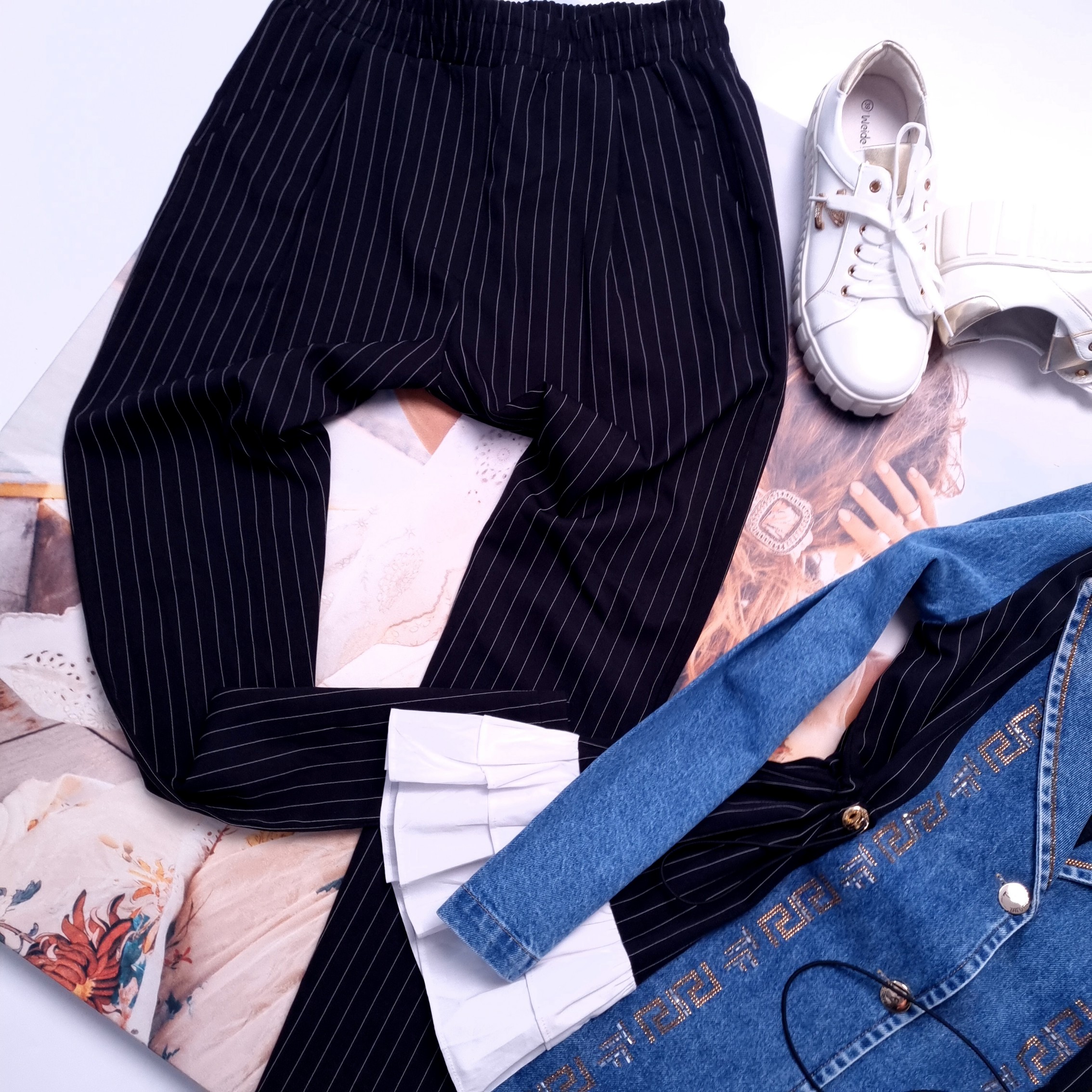 Spodnie z wysokim stanem i grubą gumką w pasie. Szerokie nogawki, z kieszeniami po bokach. Czarne z delikatnymi, białymi paseczkami.