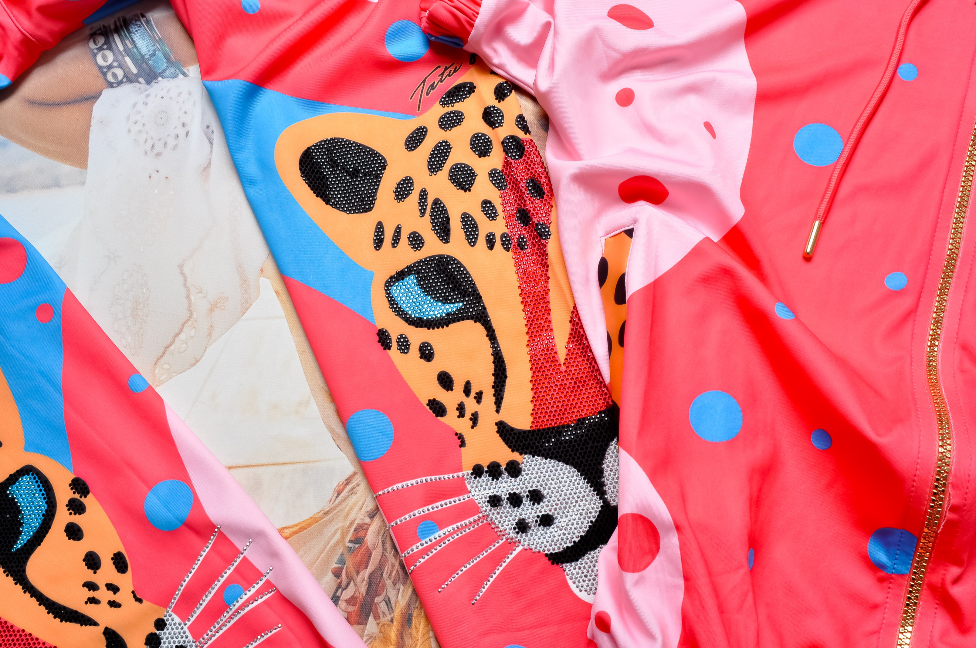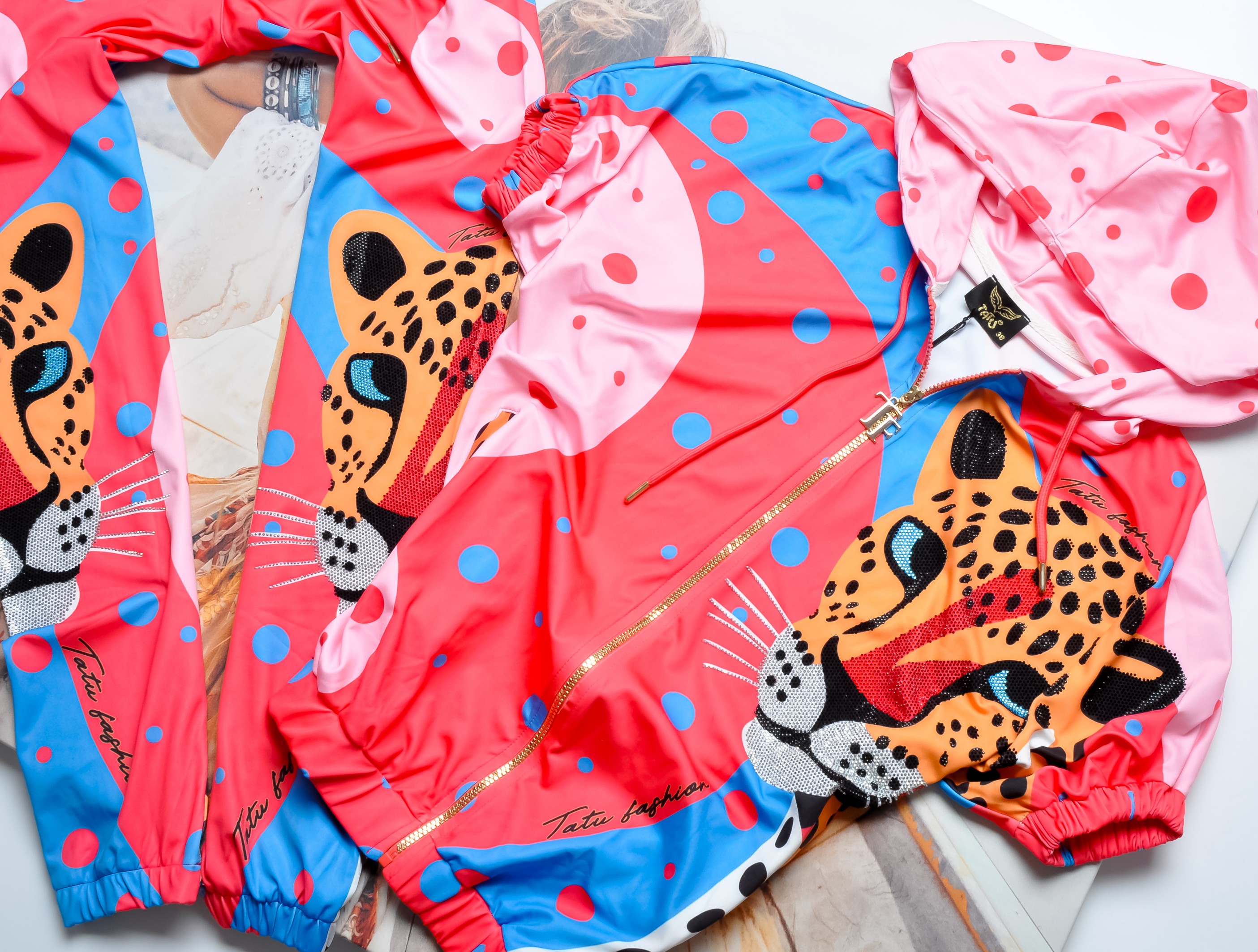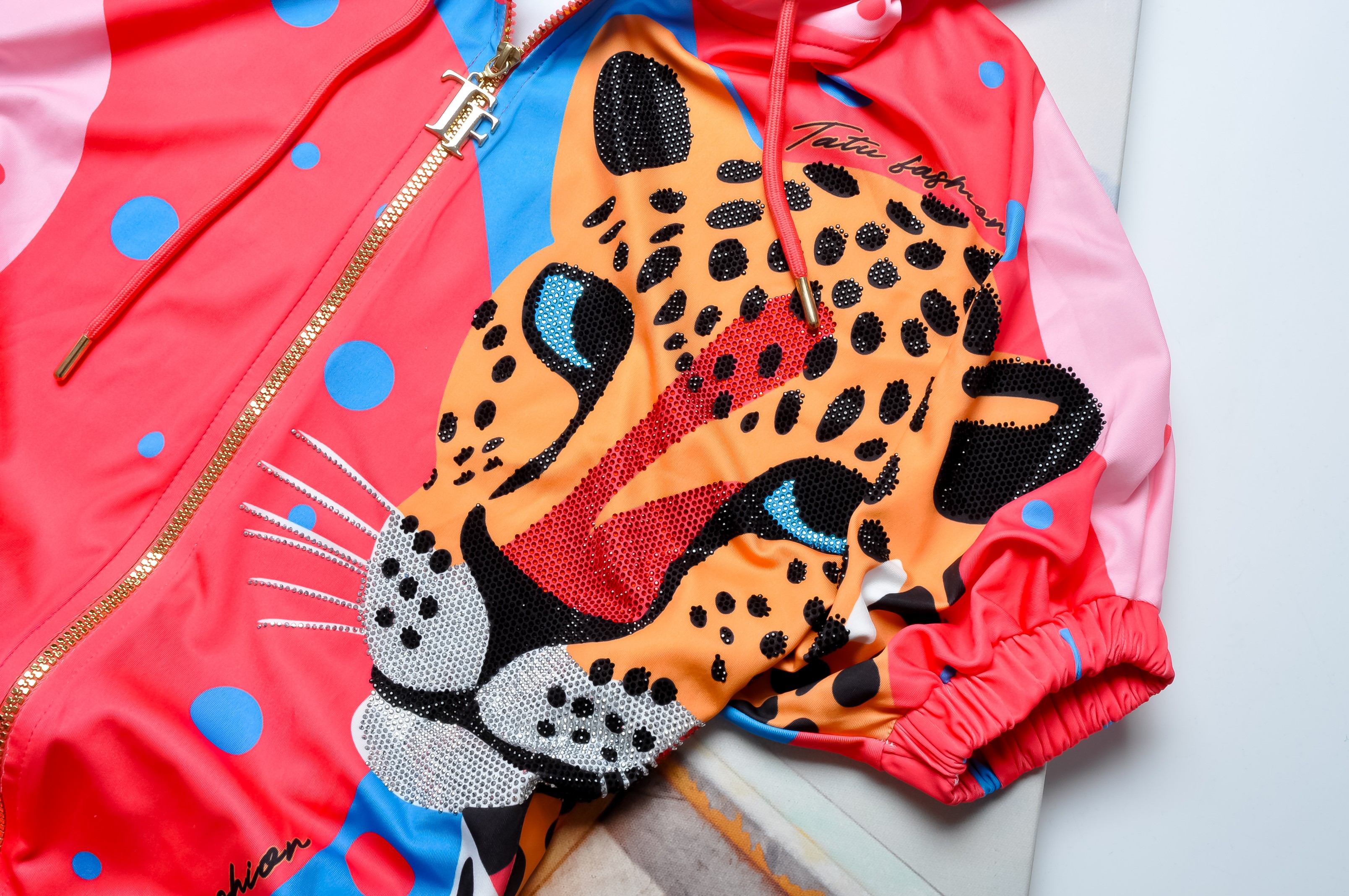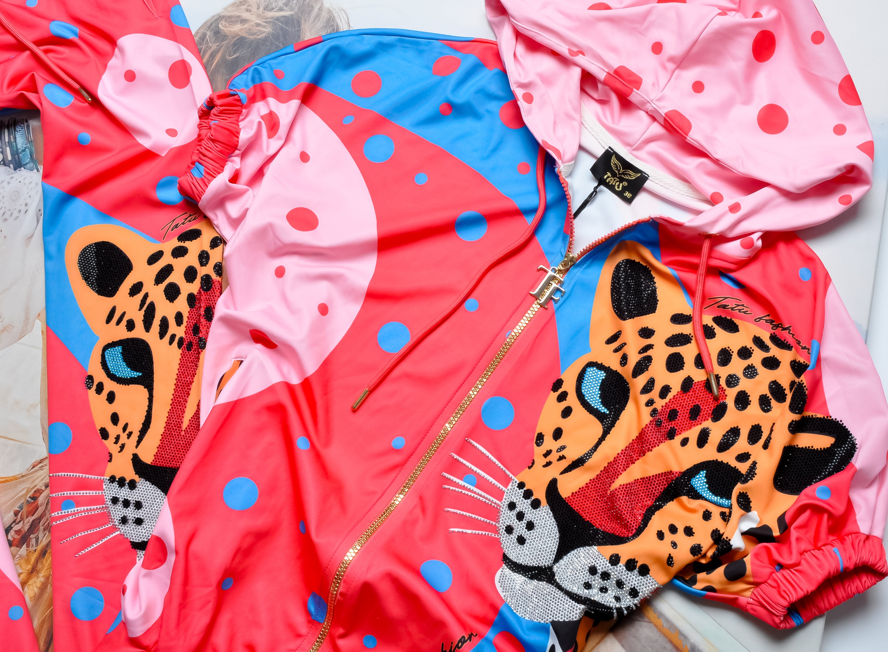 Kobiecy komplet w soczystych kolorach. Bluza z krótkim rękawem o nieprzylegającym kroju. Zapinana na zamek, ze ściągaczem na dole. Całość wykończona zdobieniem z mieniących cyrkonii i motywem pantery. Materiał lekko elastyczny.