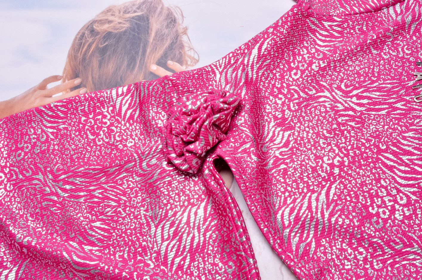 Elegancka dopasowana sukienka, w różowo - srebrnym kolorze. Z boku małe wycięcie i ozdobny kwiat . U góry srebrny łańcuszek z logo.