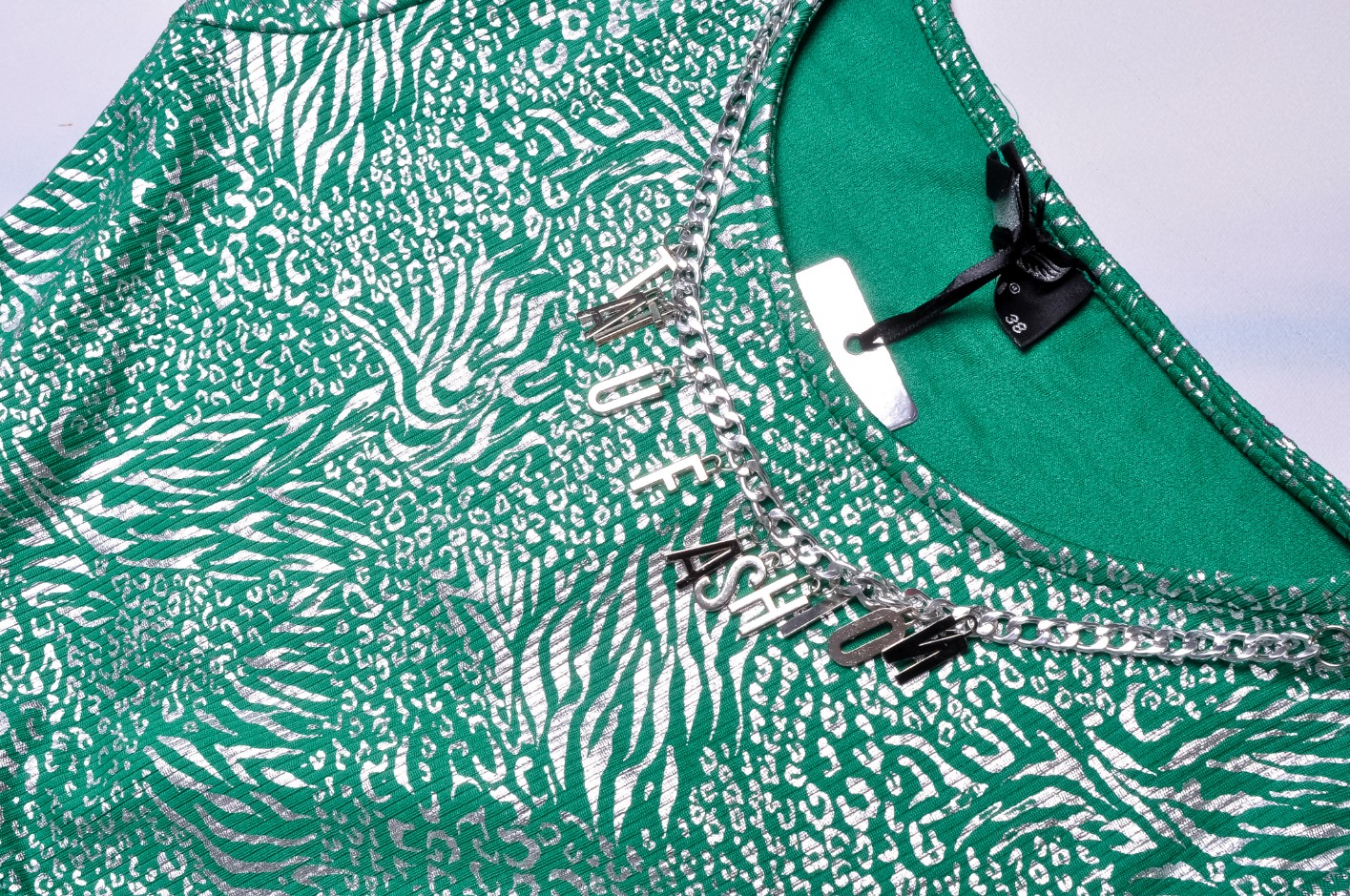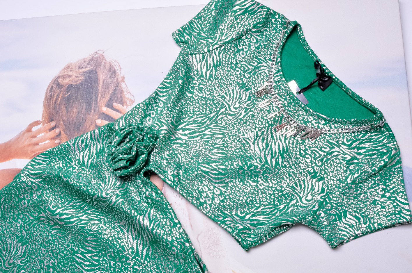 Elegancka dopasowana sukienka , w zielono srebrnym kolorze. Z boku małe wycięcie i ozdobny kwiat . U góry srebrny łańcuszek z logo