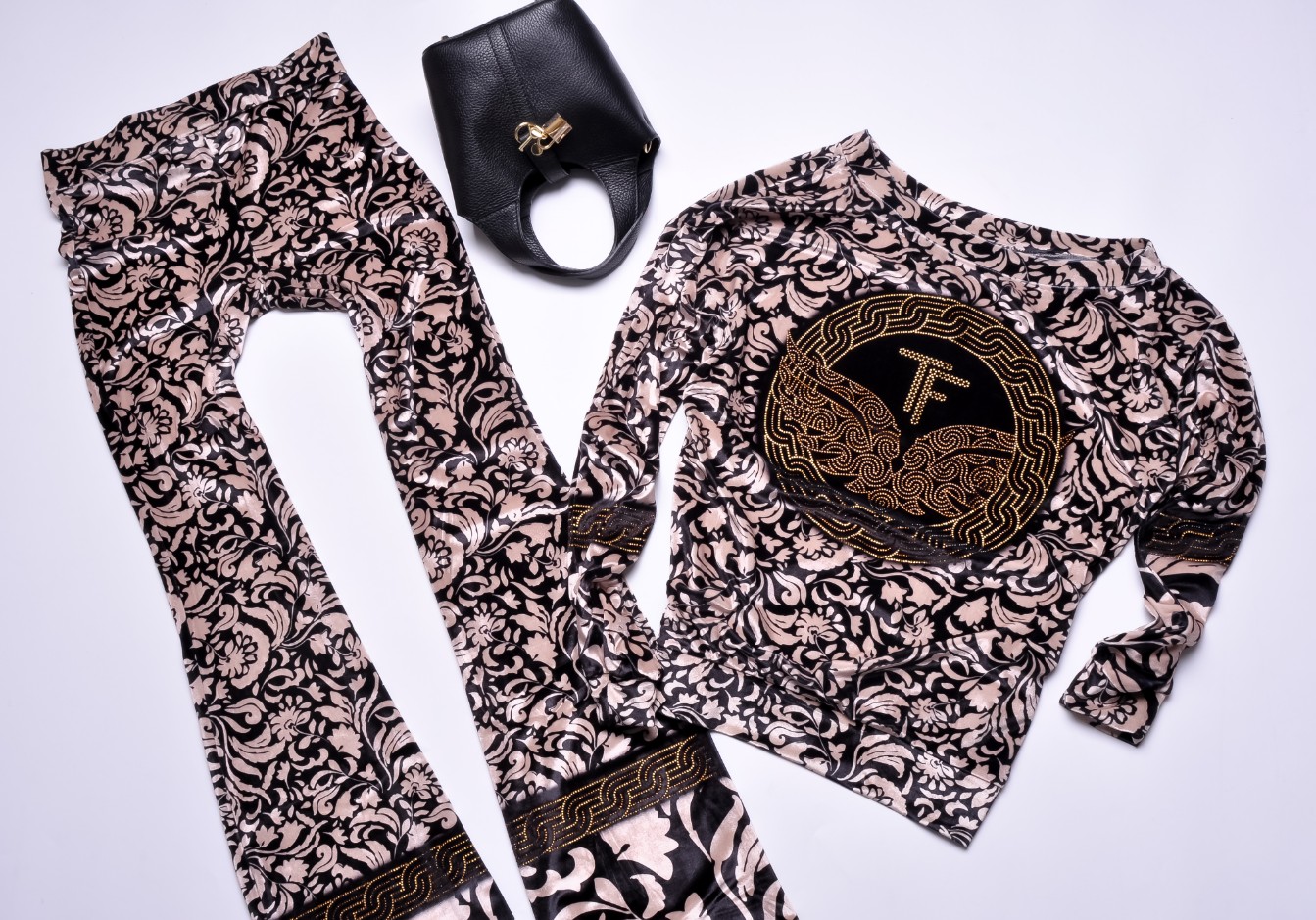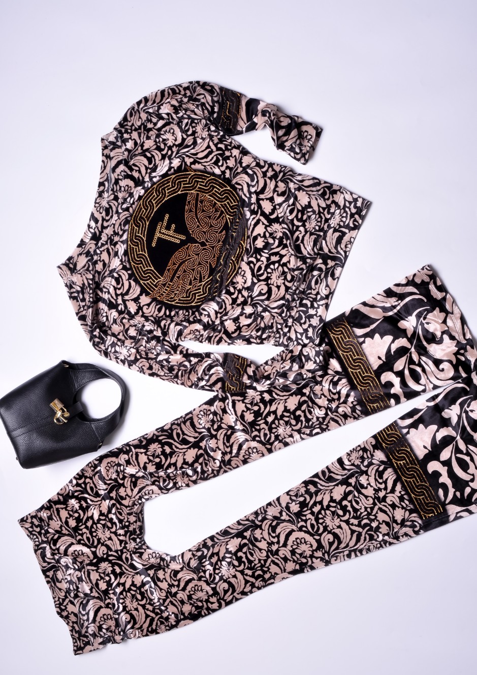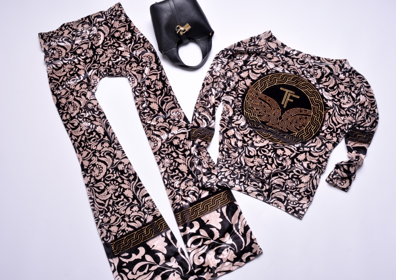Dwuczęściowy dres welurowy w kolorze beżowym wykończony printem i zdobieniem z cyrkonii. Góra oversize, dekolt okrągły. Wkładana przez głowę. Wykończenie ściągaczami. Długie rękawy. Spodnie - dzwony z gumką w pasie. Materiał lekko elastyczny.