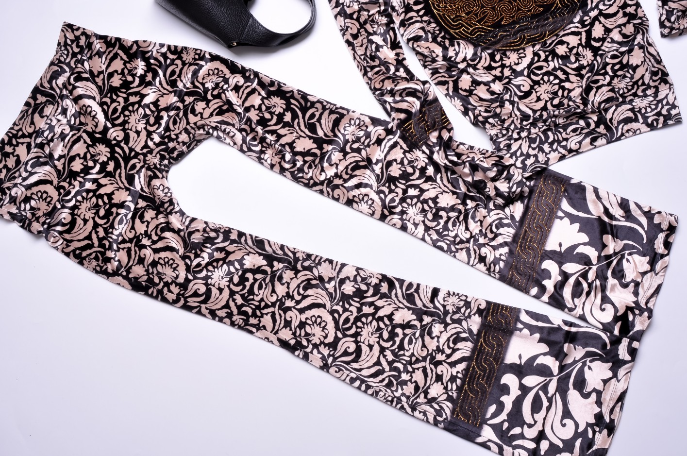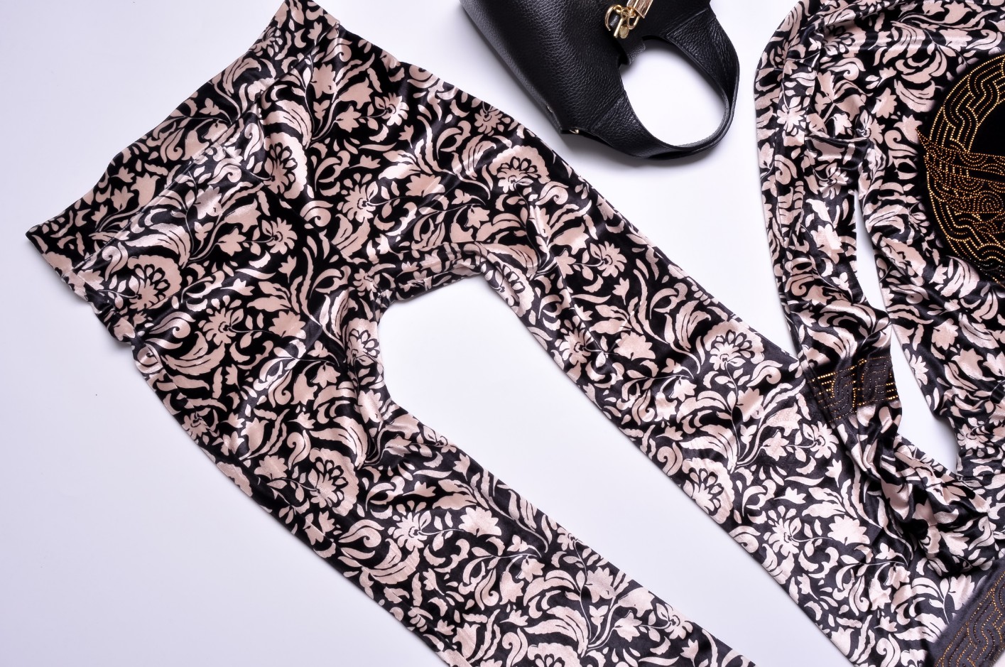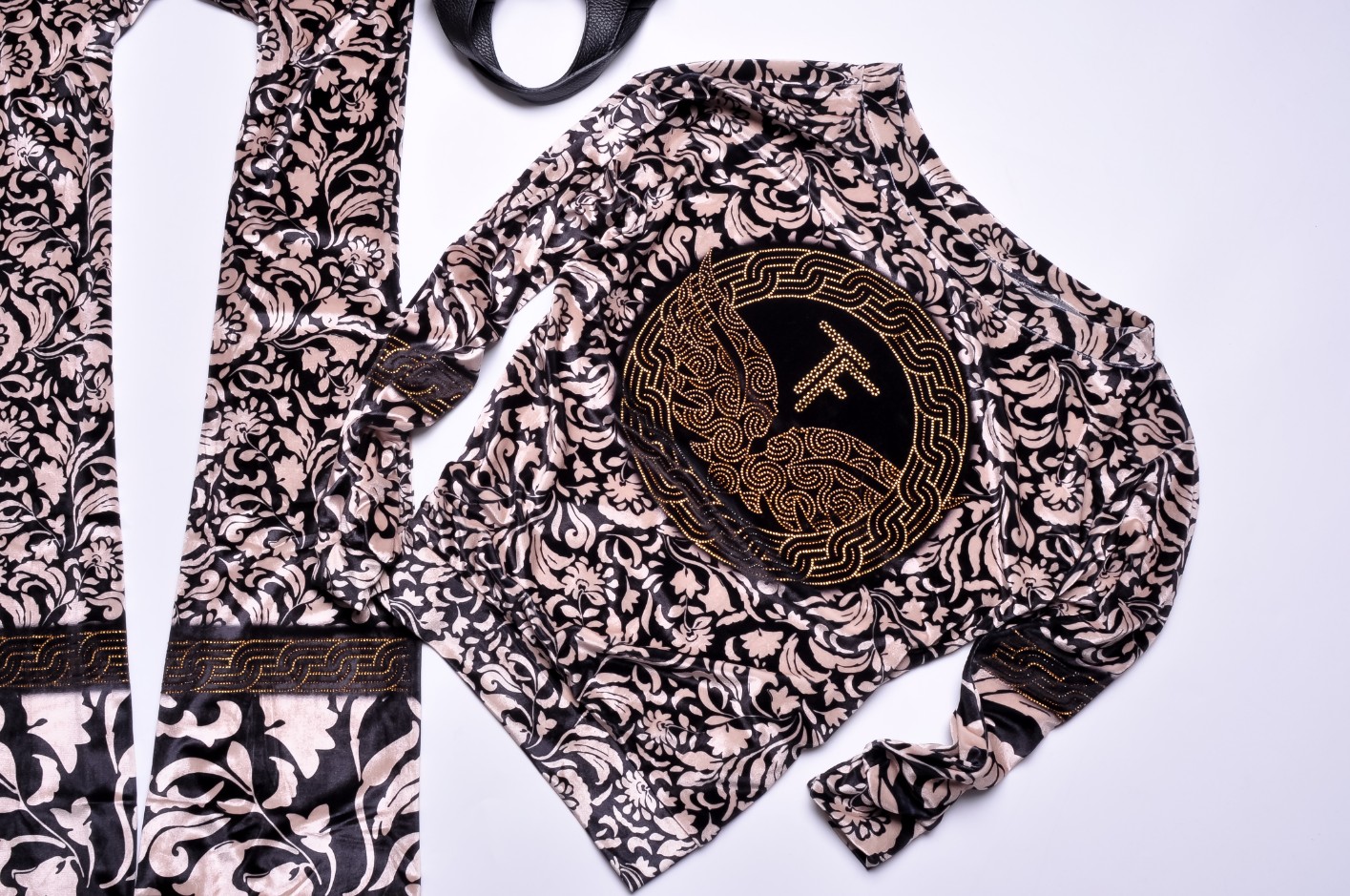 Dwuczęściowy dres welurowy w kolorze beżowym wykończony printem i zdobieniem z cyrkonii. Góra oversize, dekolt okrągły. Wkładana przez głowę. Wykończenie ściągaczami. Długie rękawy. Spodnie - dzwony z gumką w pasie. Materiał lekko elastyczny.