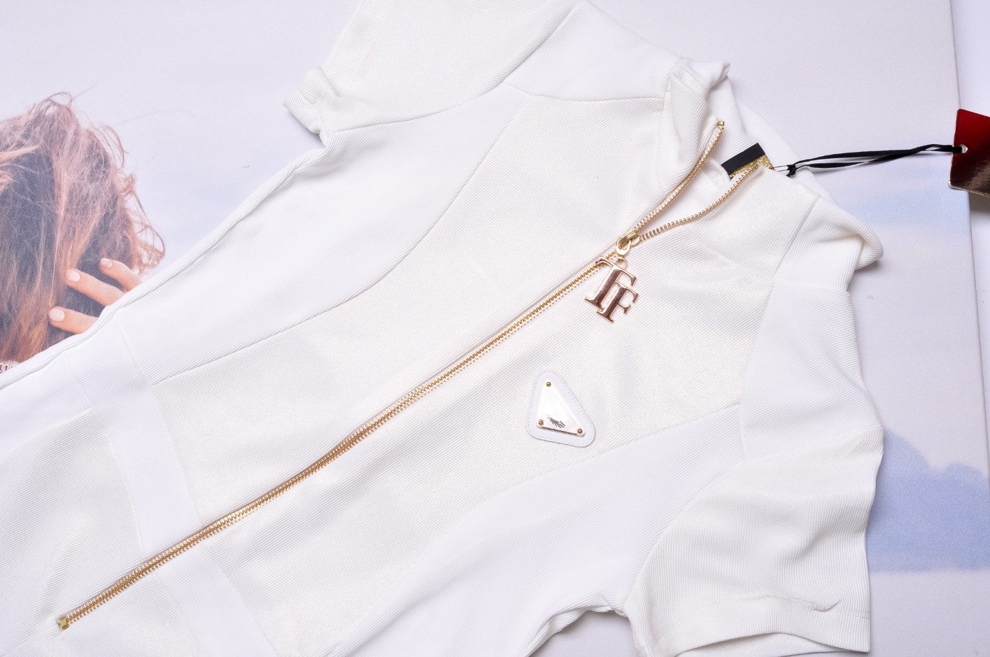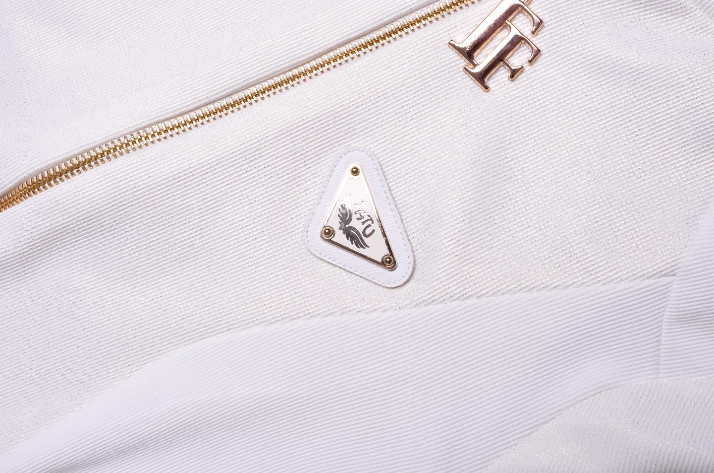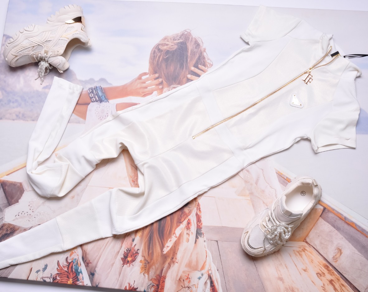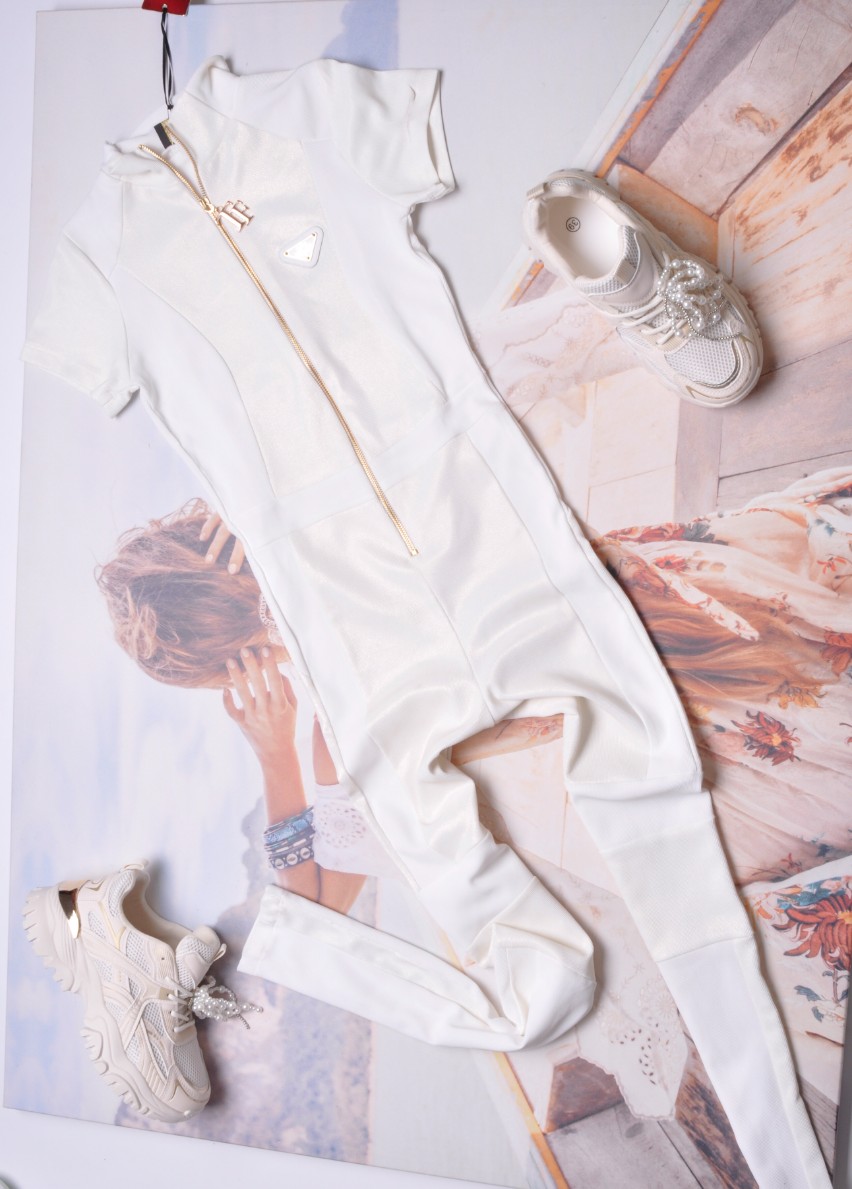 Dopasowany biało- złoty kombinezon, zapinany z przodu na złoty zamek z logo. Materiał połyskujący , prążkowany i elastyczny.