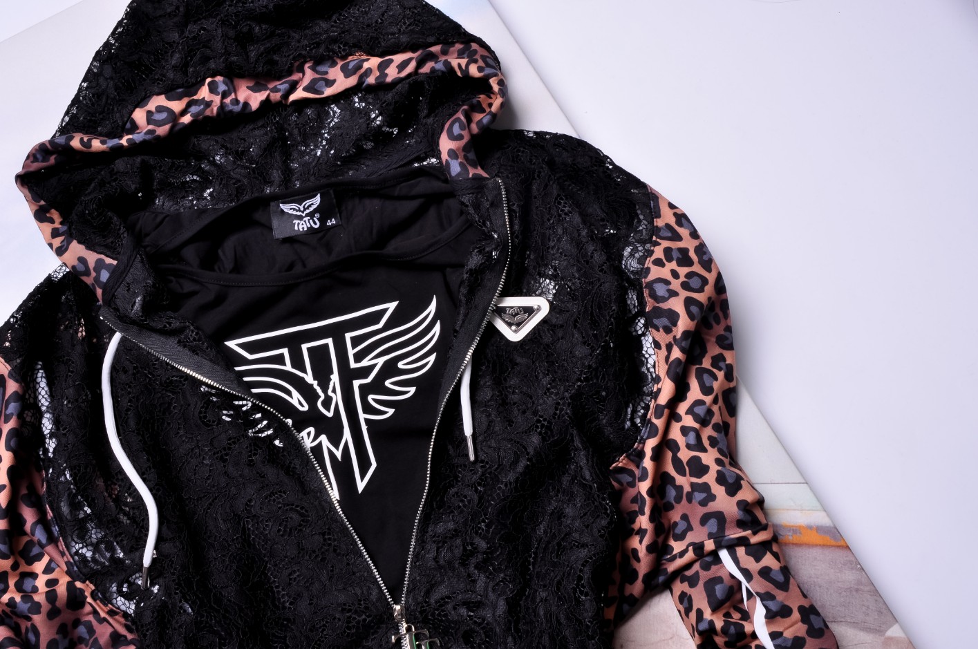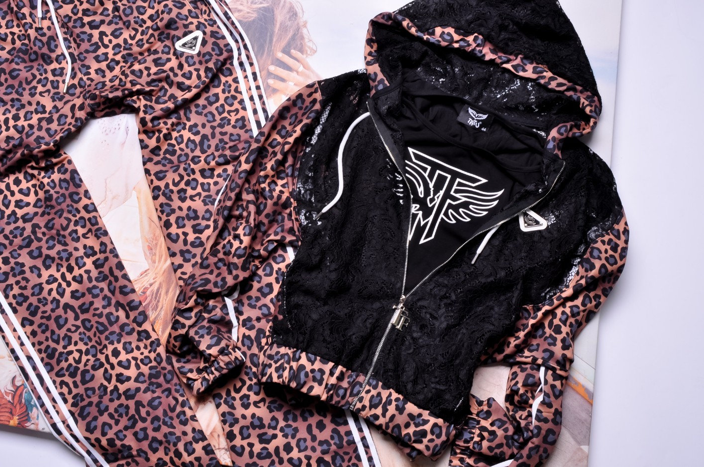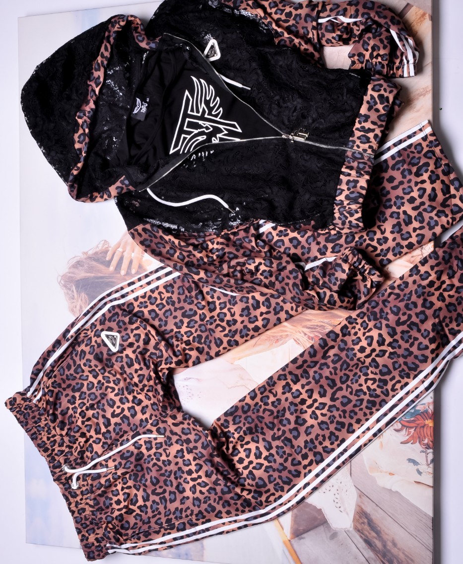 Bluza z kapturem – zapinana na zamek, w tym samym wzorze leopard print. Wyjątkowego charakteru nadają jej koronkowe wstawki, które przełamują sportowy styl nutą elegancji i kobiecości.