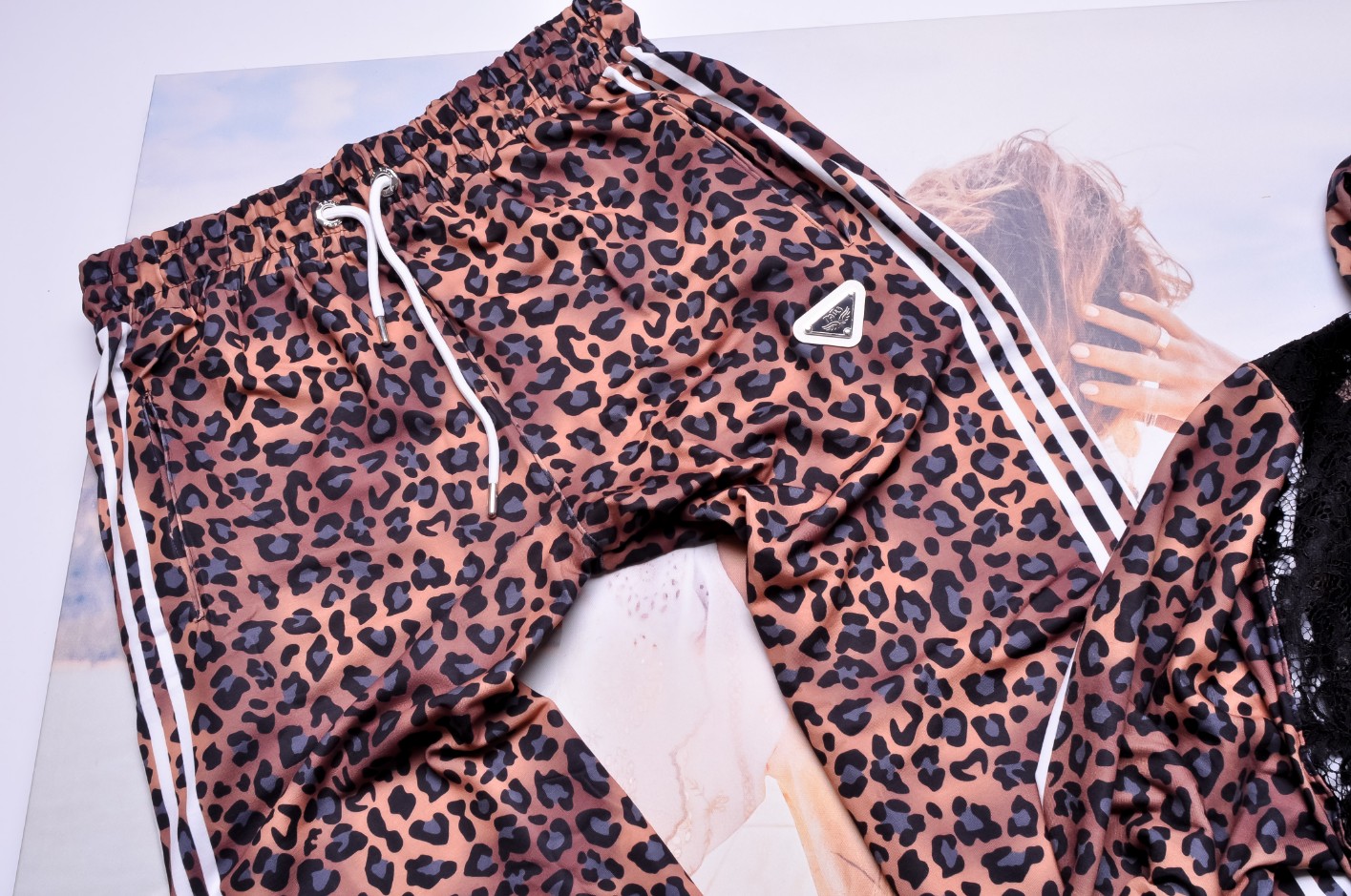 Spodnie dresowe – w klasycznym kroju, z wygodną gumką w pasie i ściągaczami, ozdobione modnym nadrukiem w panterkę oraz kontrastowymi, białymi lampasami po bokach.