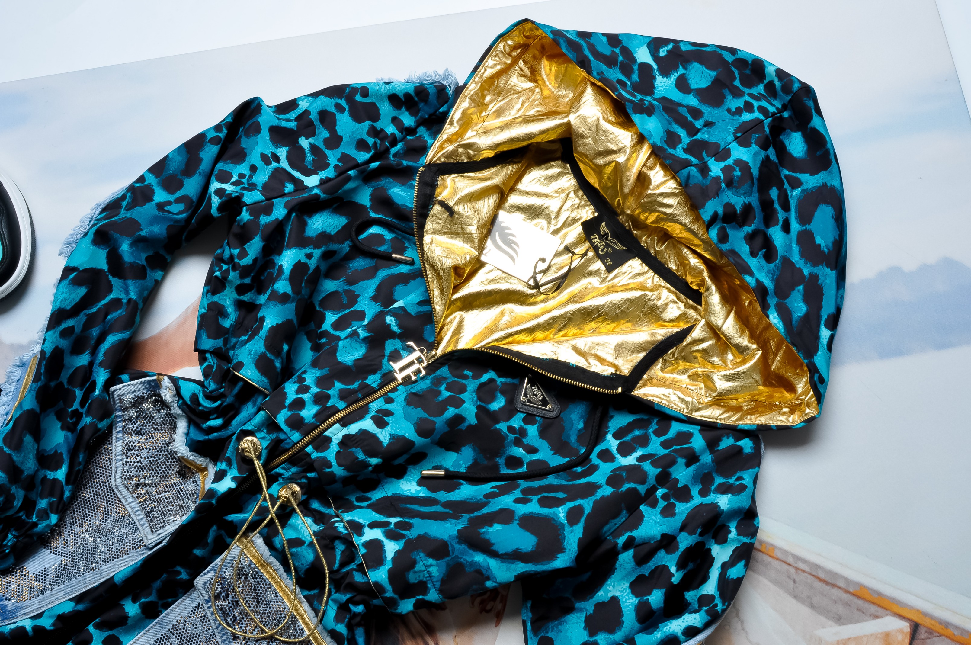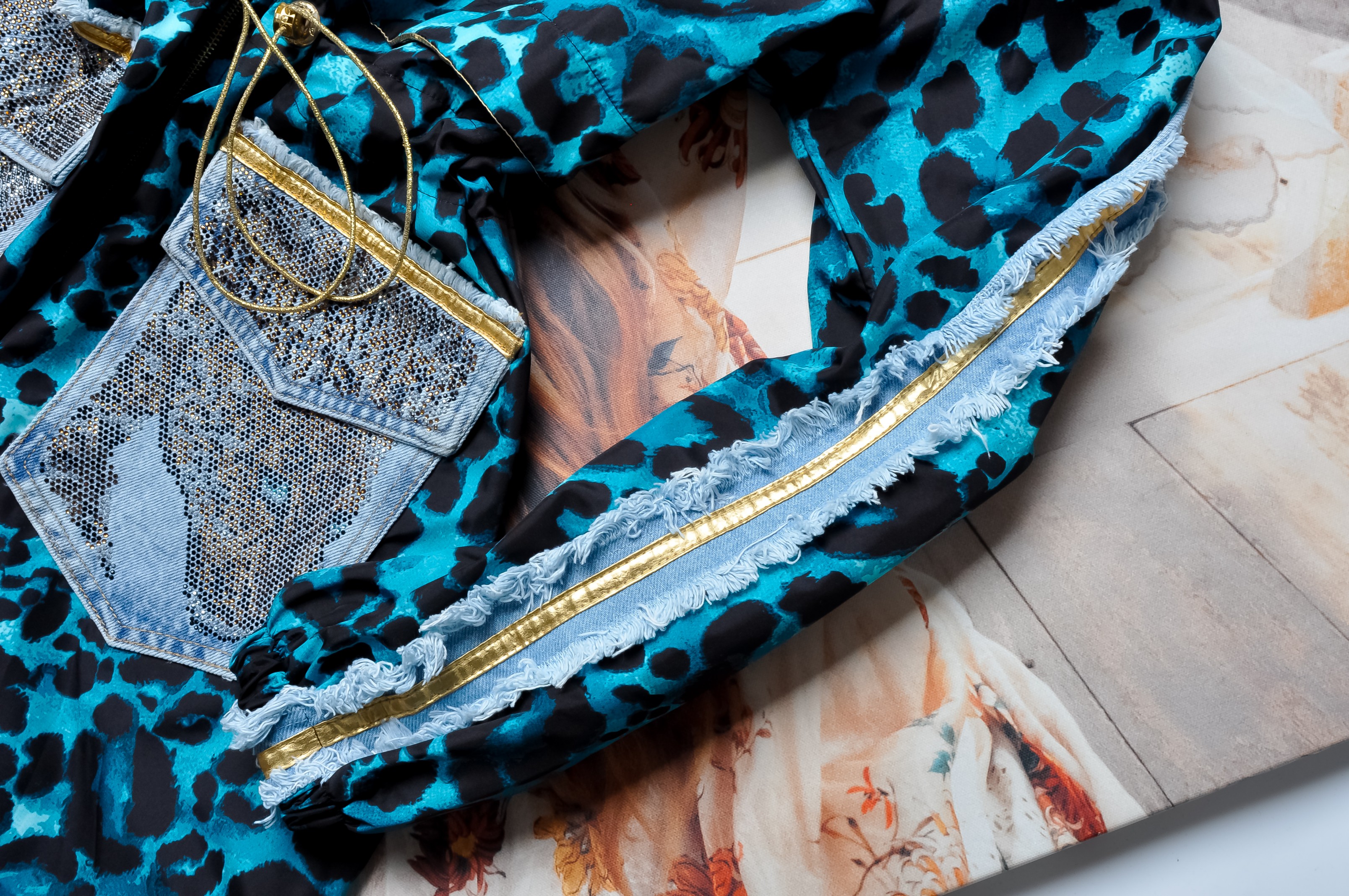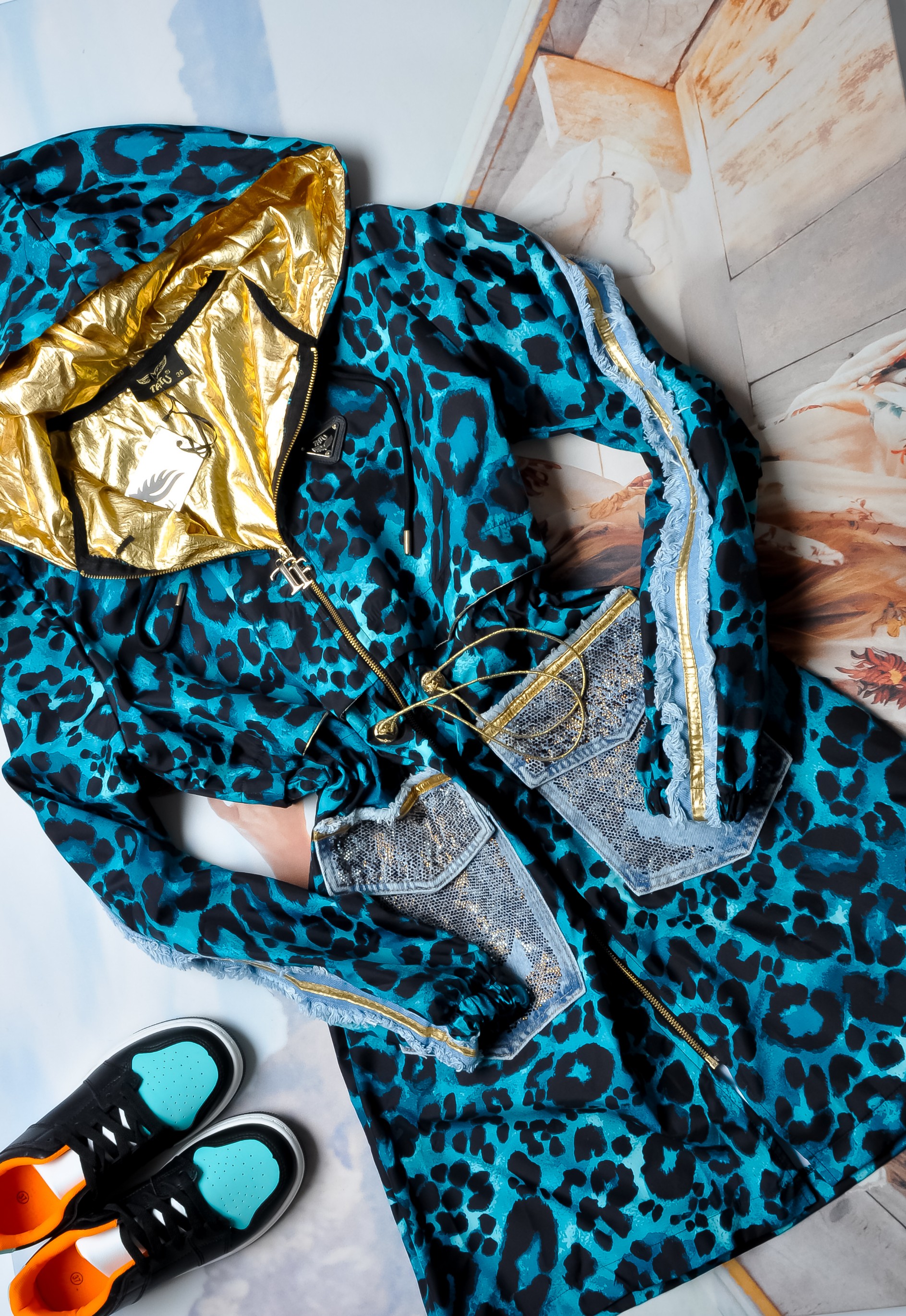 Materiałowa turkusowa kurtka - parka w motywie pantery. Posiada kaptur . Krój parki luźny - prosty, zwężana w talii sznureczkami. Z przodu jeansowe kieszenie wykończone cyrkoniami. Na rękawach jeansowe lampasy.