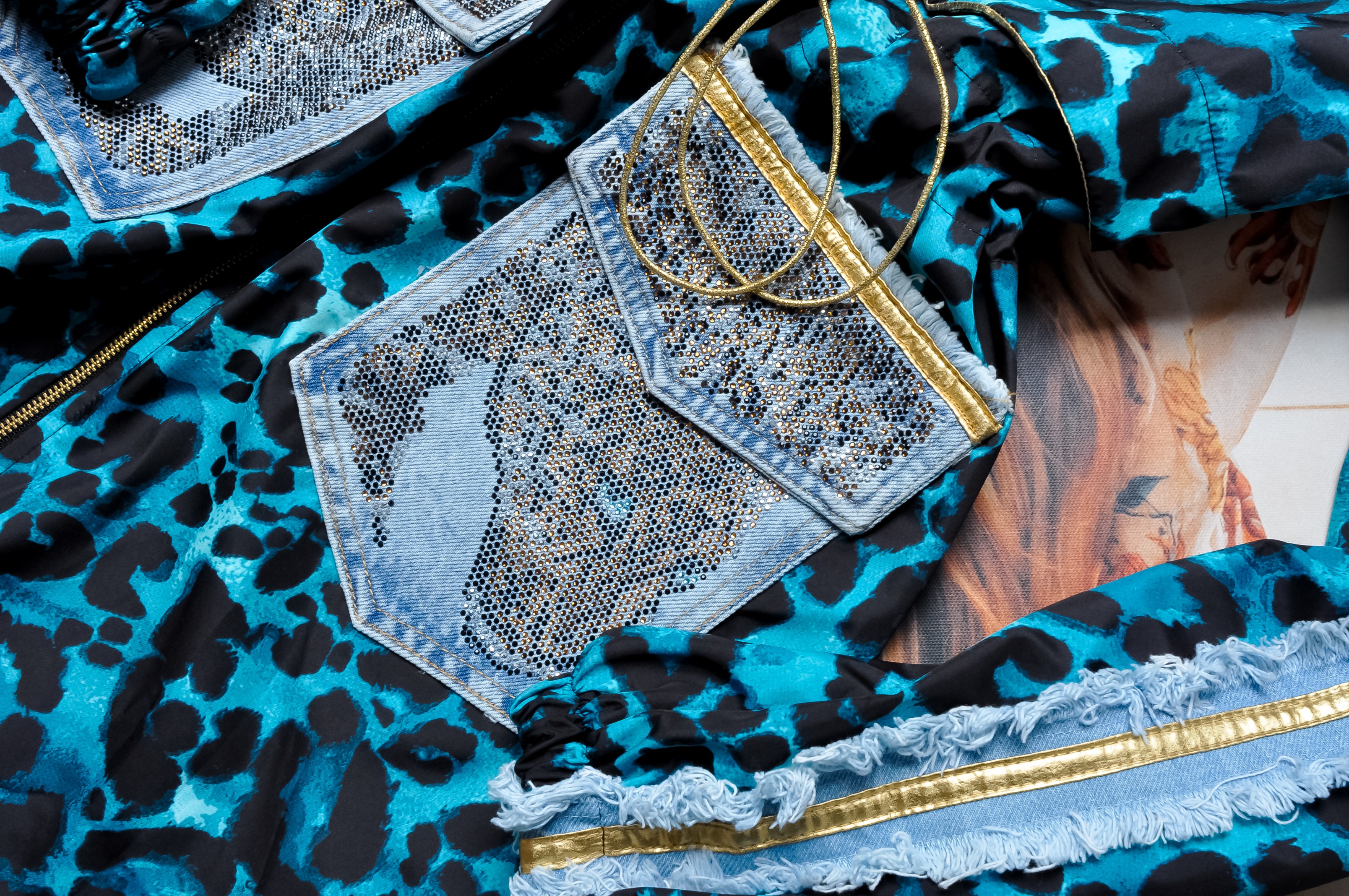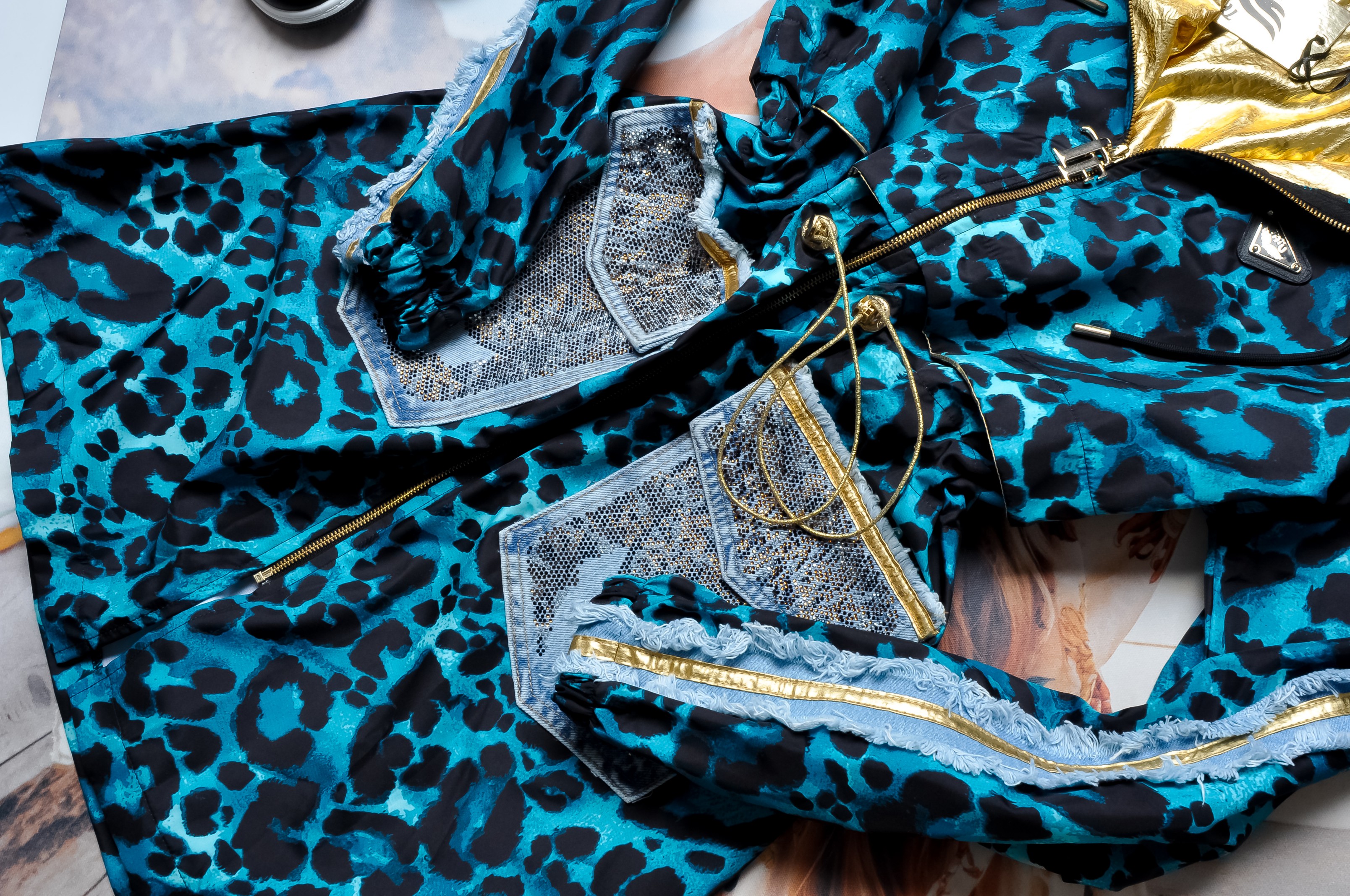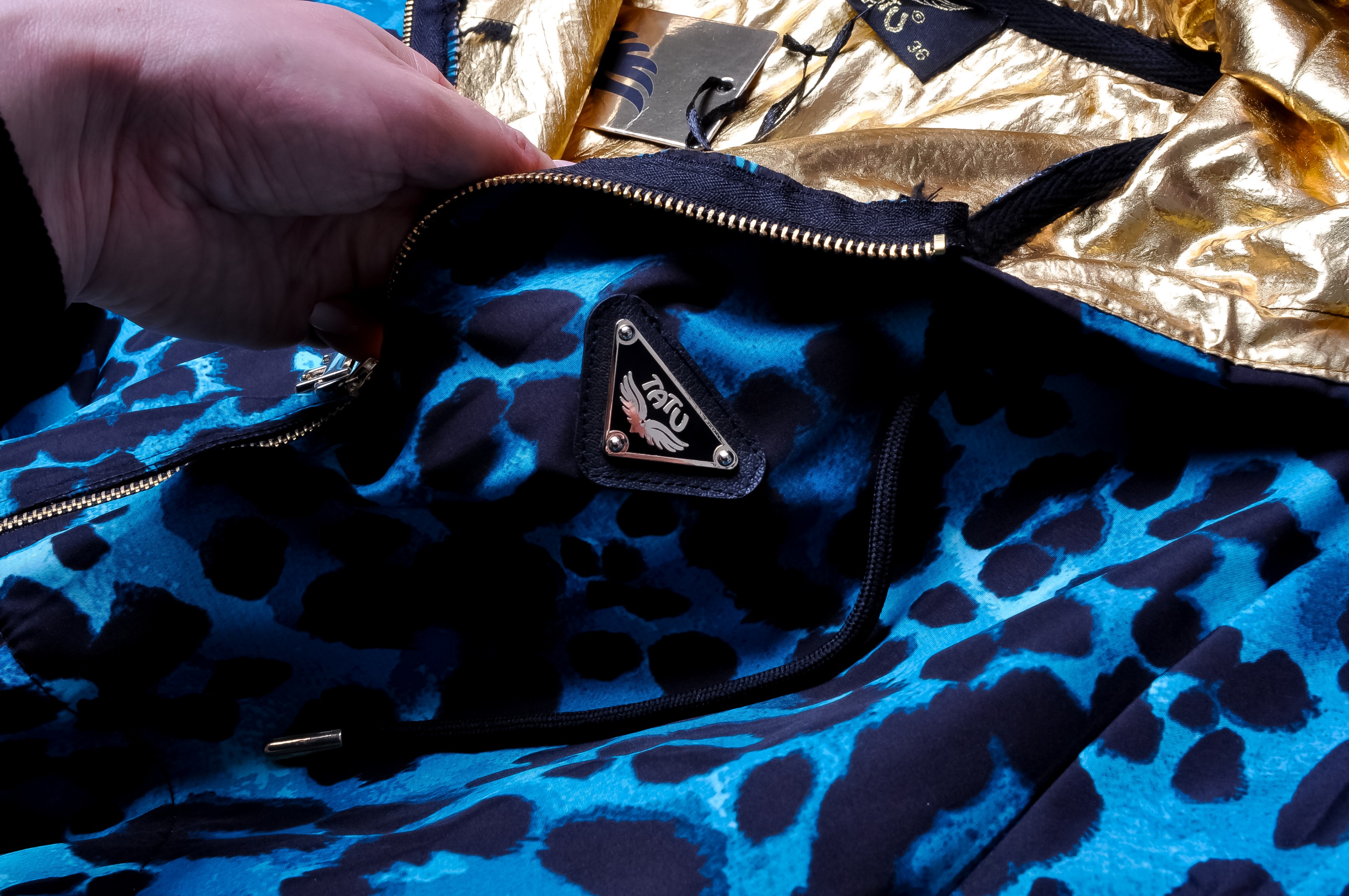 Materiałowa turkusowa kurtka - parka w motywie pantery. Posiada kaptur . Krój parki luźny - prosty, zwężana w talii sznureczkami. Z przodu jeansowe kieszenie wykończone cyrkoniami. Na rękawach jeansowe lampasy.