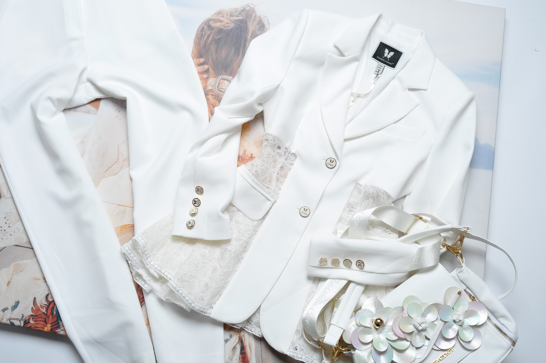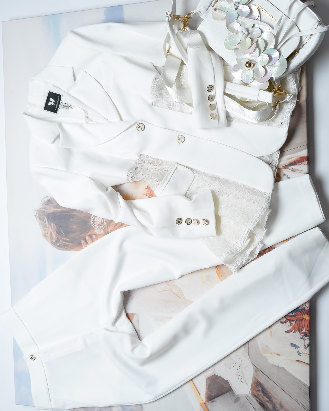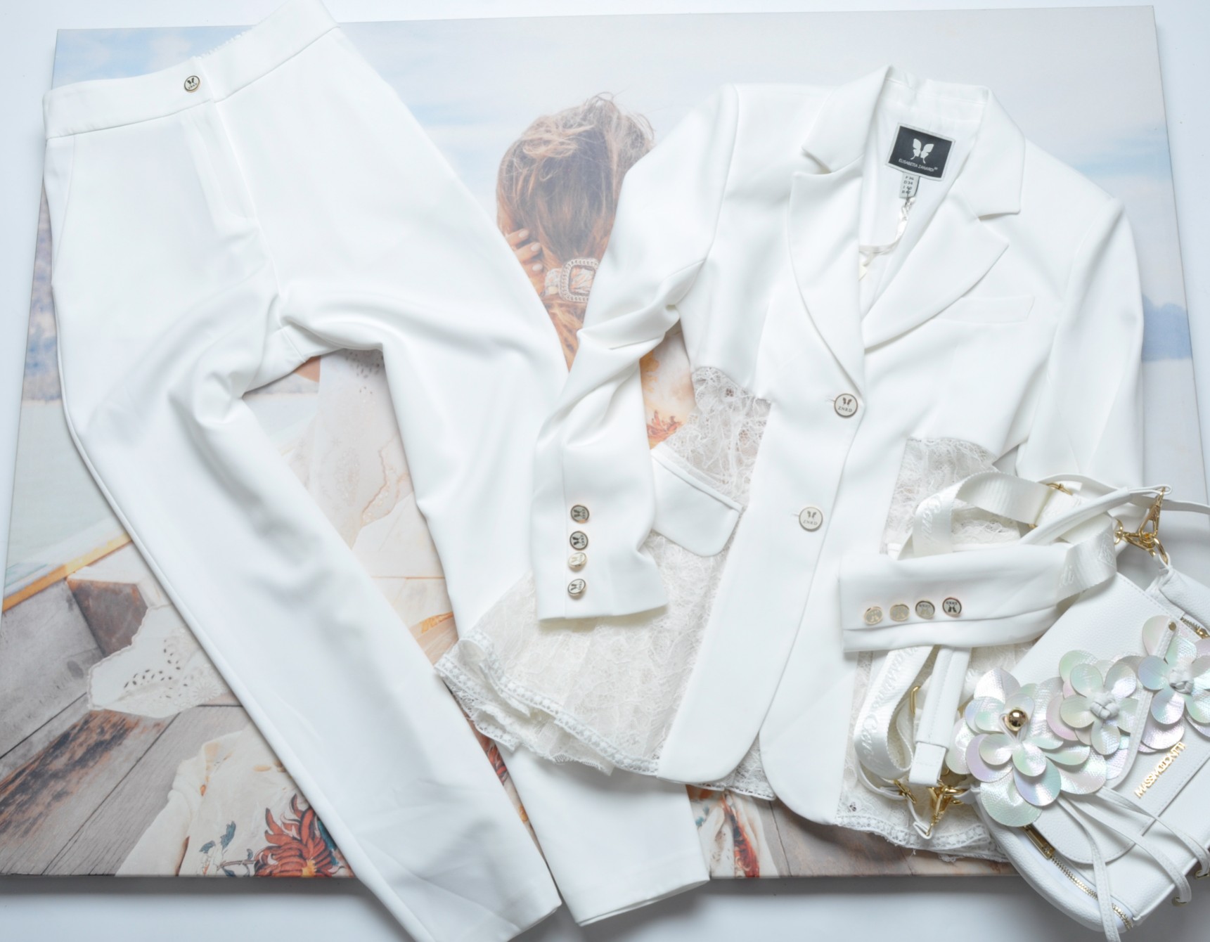 ZANARDI - BIAŁY ELEGANCKI KOMPLET - MARYNARKA Z KORONKĄ - SPODNIE