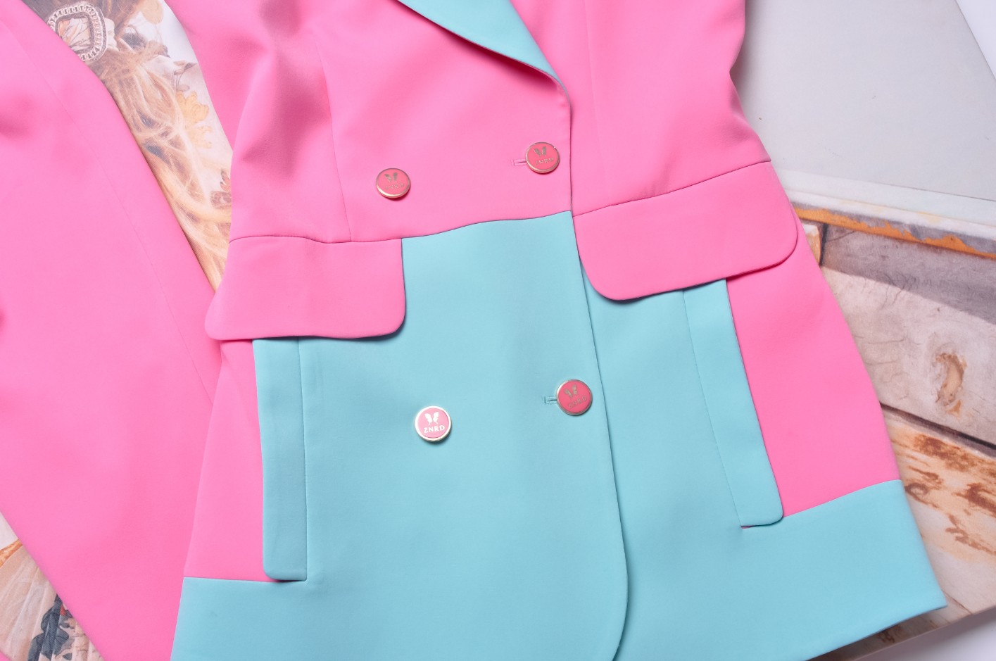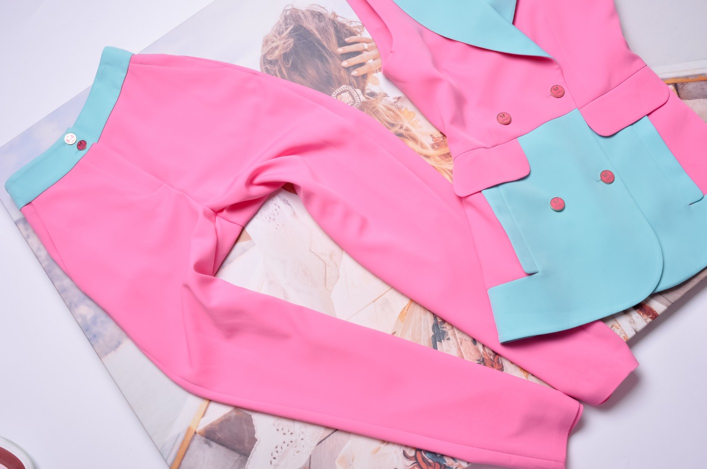 Zjawiskowy komplet w różowym kolorze z seledynowymi wstawkami.
