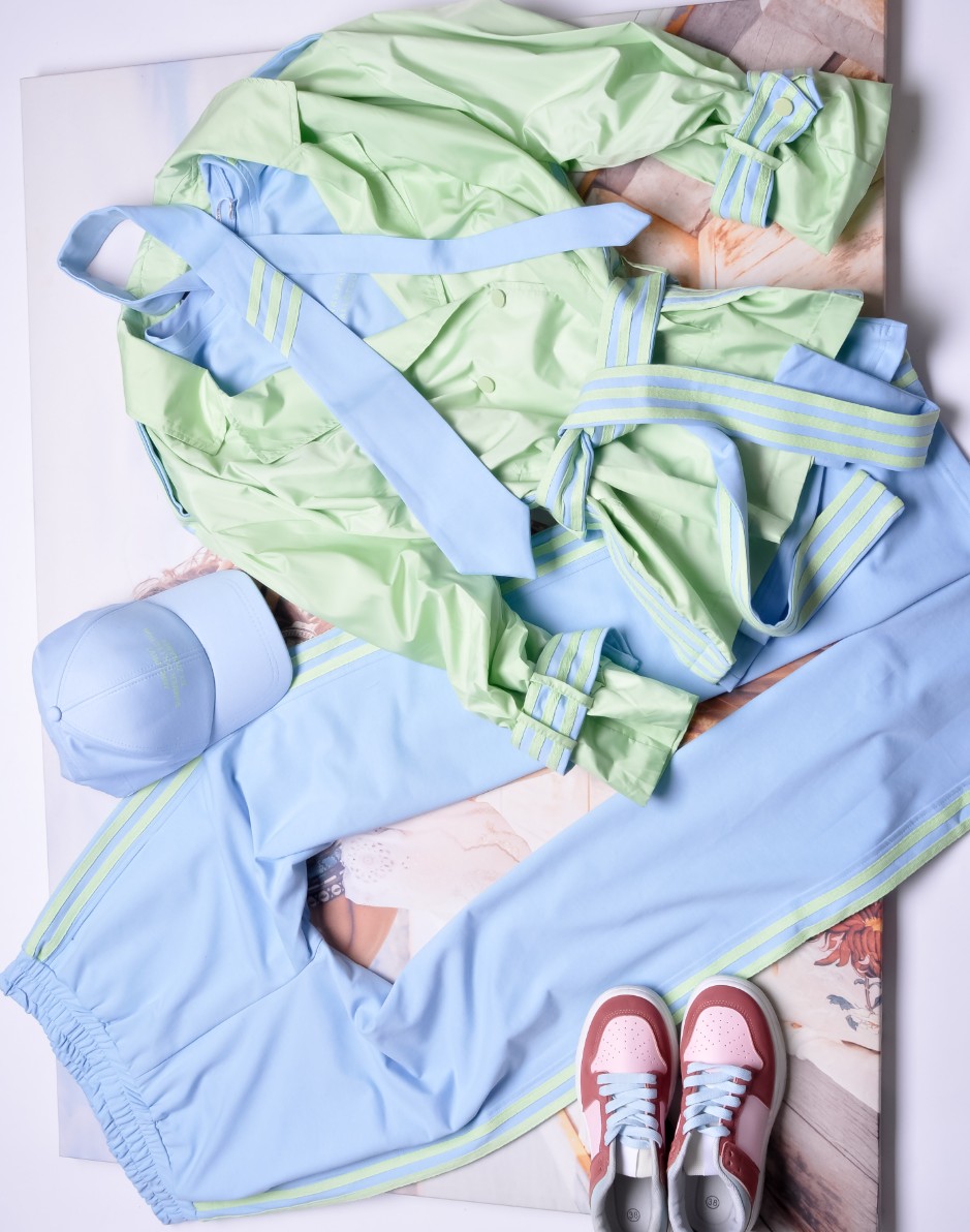 Góra kompletu - ortalionowa kurteczka w zielonym kolorze z ozdobnymi błękitnymi paskami na rękawach i w talii. Zapinana na napy. Dwie kieszenie. Fason oversize, krój prosty.