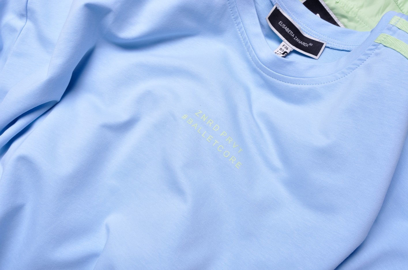 Bluzka błękitna z subtelnymi napisami z przodu. Obniżona linia ramion, fason oversize. Krój prosty. Krótki rękaw.