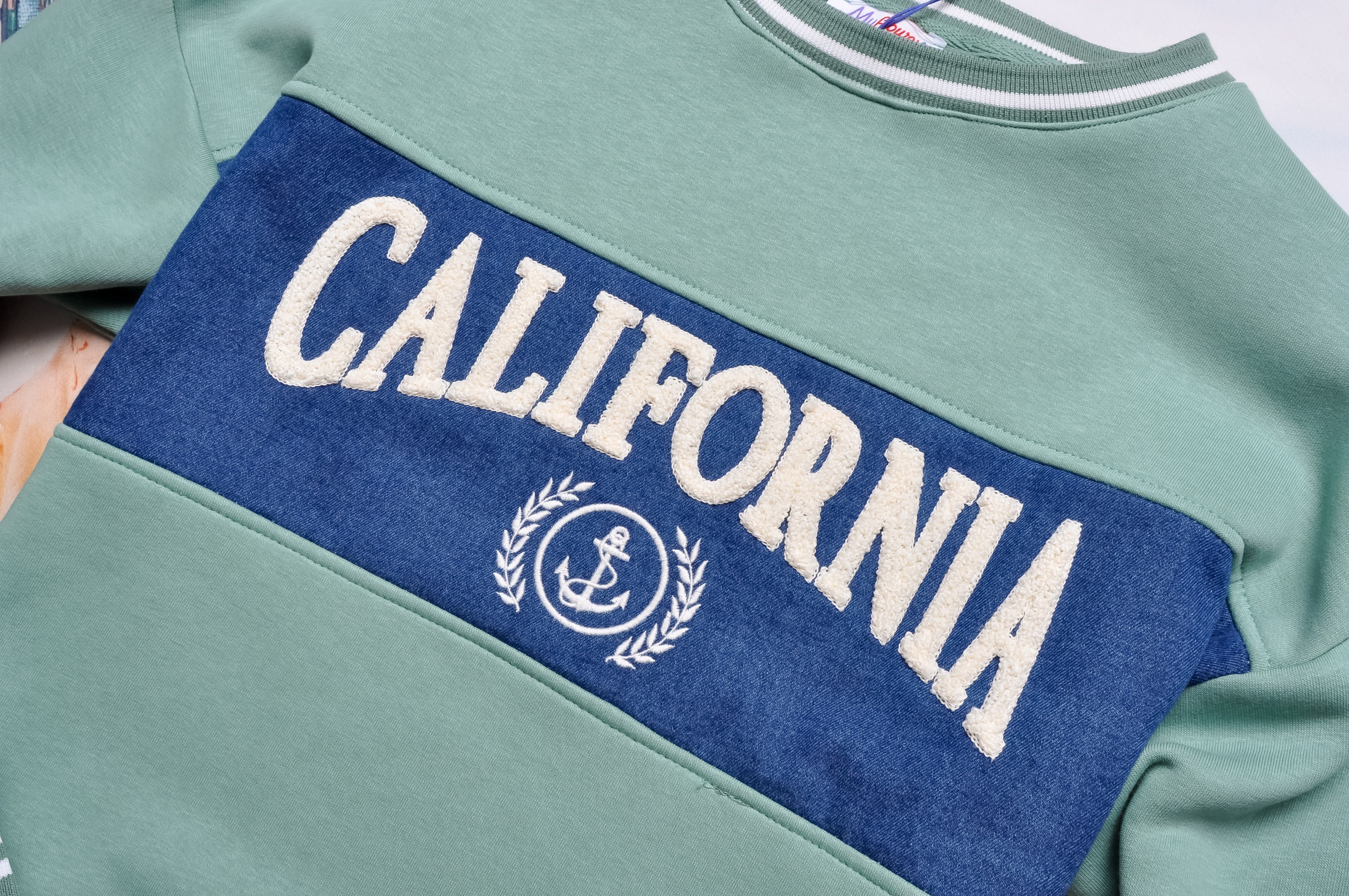 Śliczna bluza w zielonym kolorze. Wkładana przez głowę. Dekolt okrągły. Rękawy długie, obniżona linia ramion. Fason oversize, nieprzylegający. Wykończona jeansową wstawką i napisem.