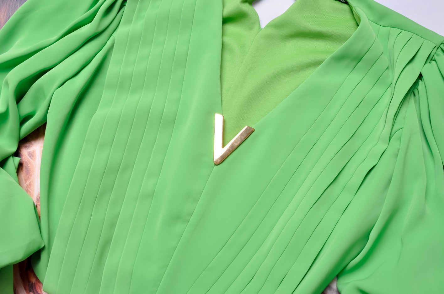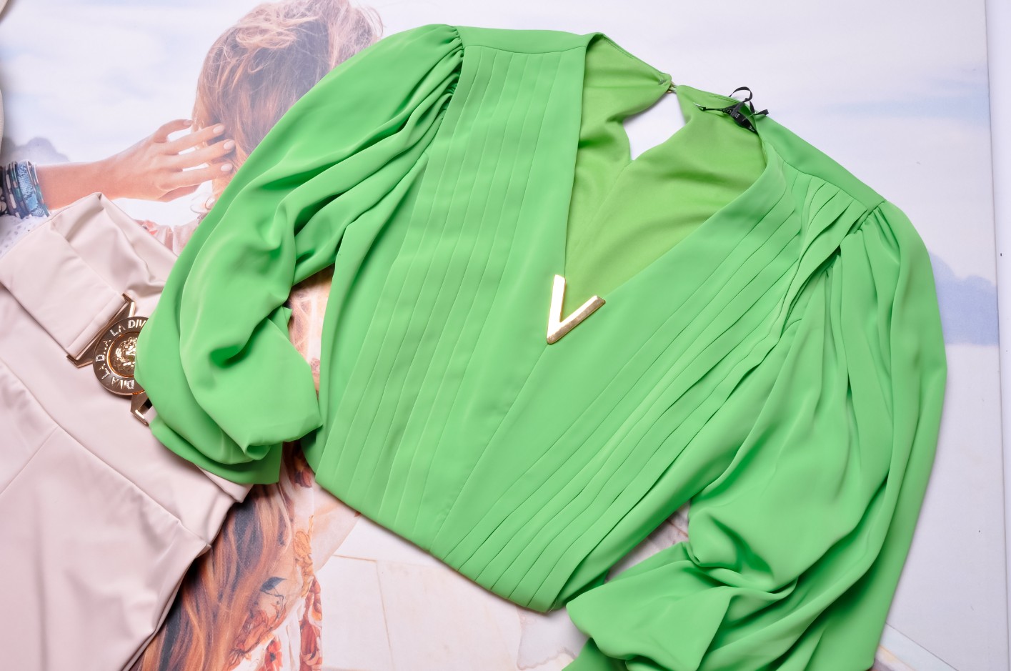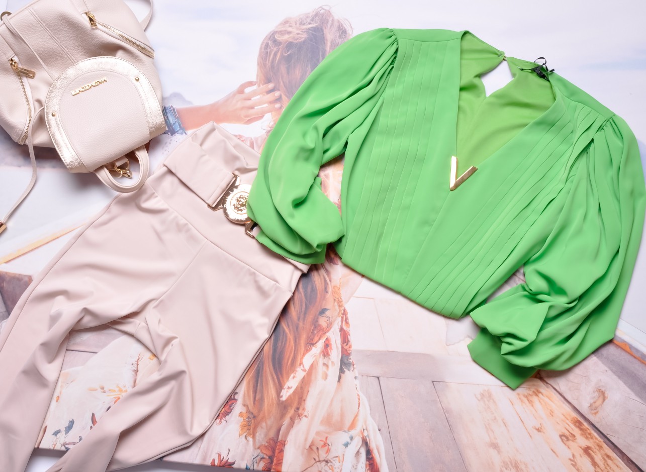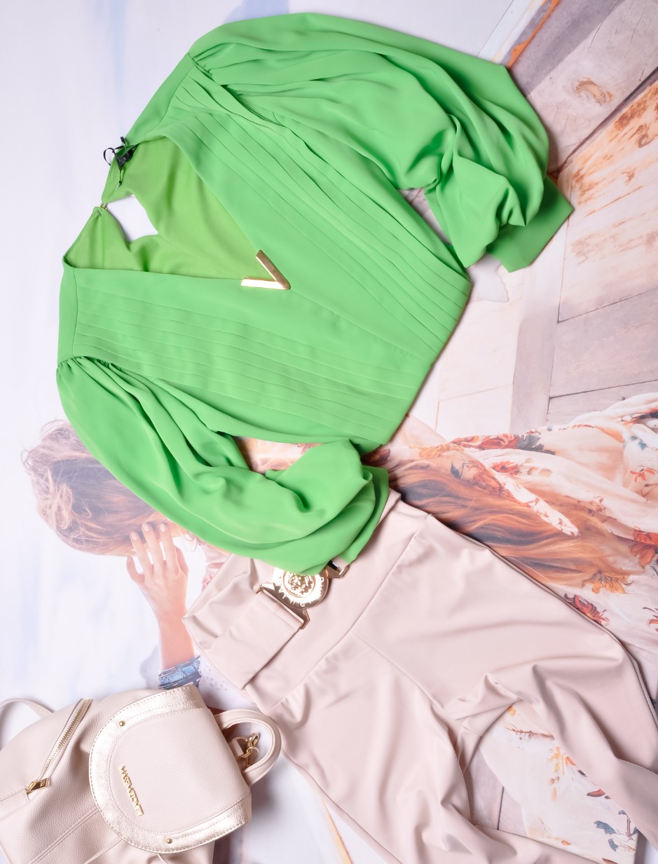 ZIELONA KRÓTKA KOSZULA - ZŁOTE ZDOBIENIE - BUFIASTE RĘKAWY